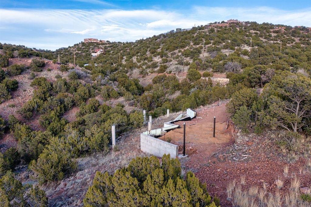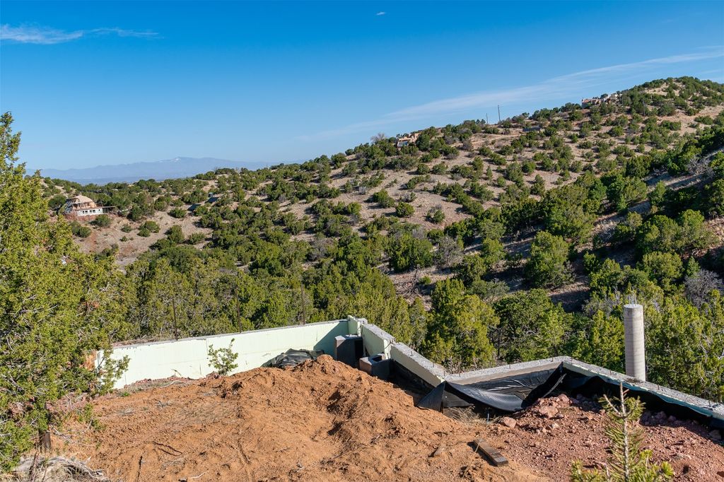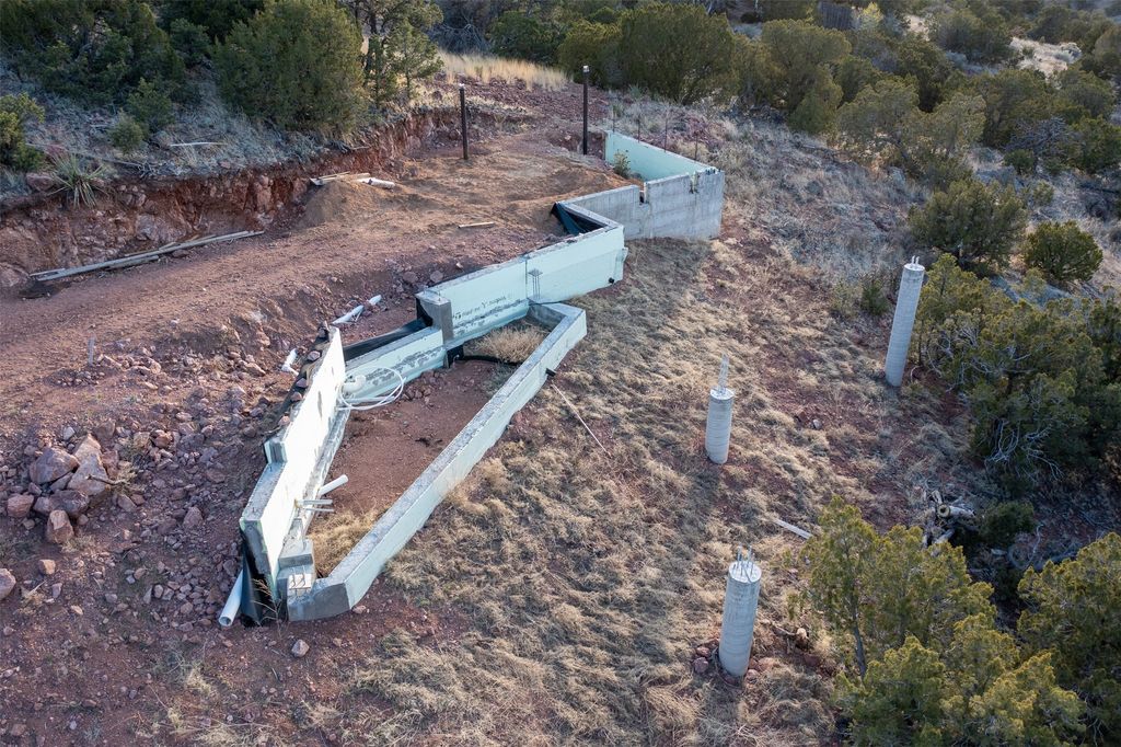 Elevated Sunlit Hills view-lot, 5.5. acres, with foundation and development work completed, and plans for a 1648 square foot contemporary two-bedroom, two-bathroom home included. Finish this home or use the work done here for a significant head-start on your own vision. This quiet hillside acreage is just minutes from town, and on a paved road, a rarity in Sunlit Hills, and opens to expansive views and sunsets over the Jemez. Much of the engineering, prep-work and necessary infrastructure to make the best use of this property has already been completed: The driveway and the site have been engineered and graded from Camino Pacifico. Excavation has been completed and utilities are in place. A water connection to the Sunlit Hills Water system was created, the electricity is trenched, with a transformer and meter installed, and the foundation and stem walls constructed, along with a buried water catchment system. Advanced septic system has been installed. Seller investment in utilities and site-prep exceeds $120,000. Additional space for a shop, casita, or studio may be possible on lower sections of the lot that are gently sloped.