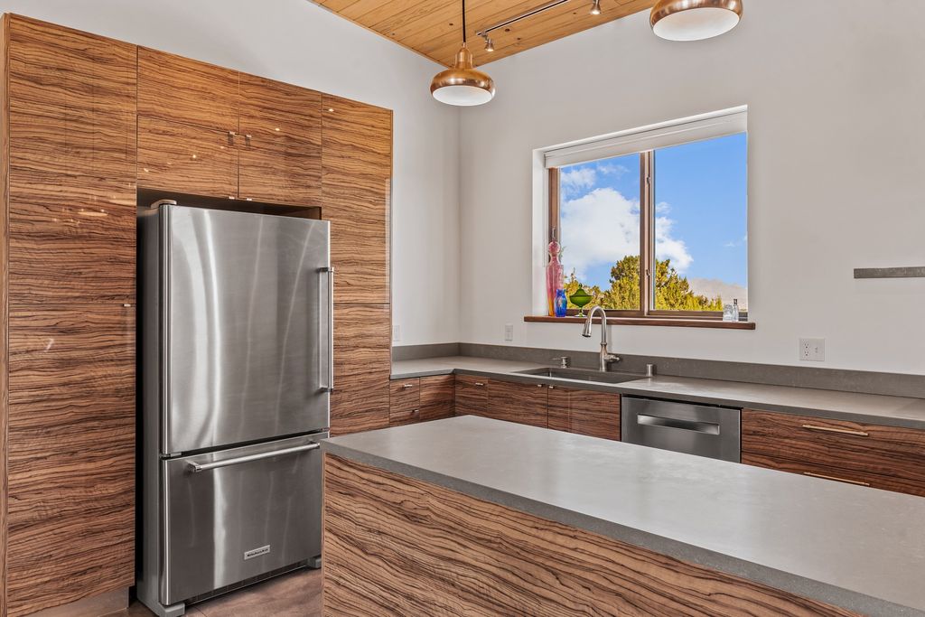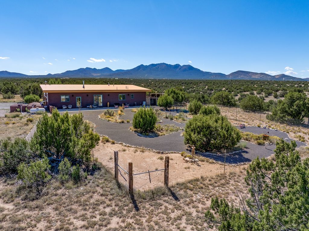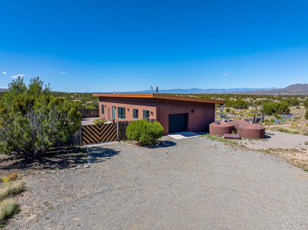 Contemporary style in a high-desert setting with breathtaking mountain views, this home sits on a spacious forty-acre lot in the foothills of the Ortiz Mountains. Fully self-reliant, it boasts utilities provided by solar, wind, and water catchment, with public electric lines available on the street. Thoughtfully designed, the home features high wood plank ceilings, polished concrete floors, and an open, modern kitchen. House is constructed of rastra for energy efficiency and fire safety.