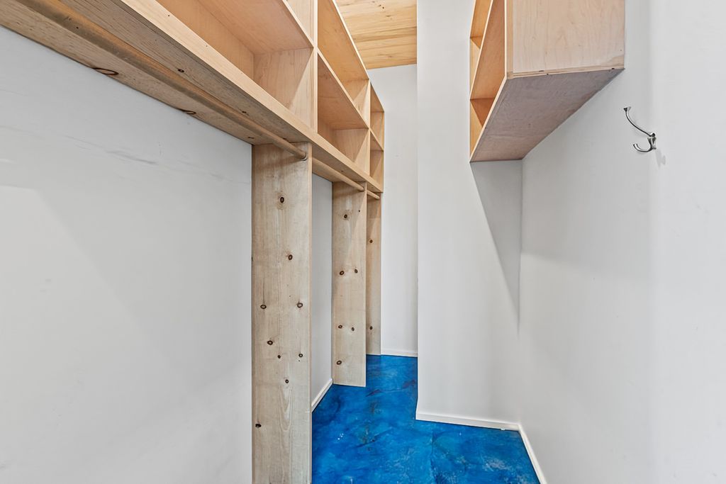 On the opposite side of the house, a large bonus room offers versatility as an office, second bedroom, or art space, and leads to a one-car garage. Both the garage and bonus room are equipped with sinks. The house is warmed by radiant heat in the floors, powered by solar hot water collectors.