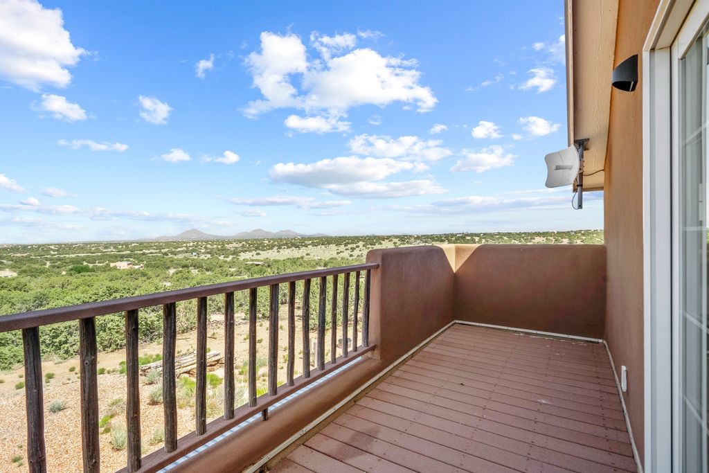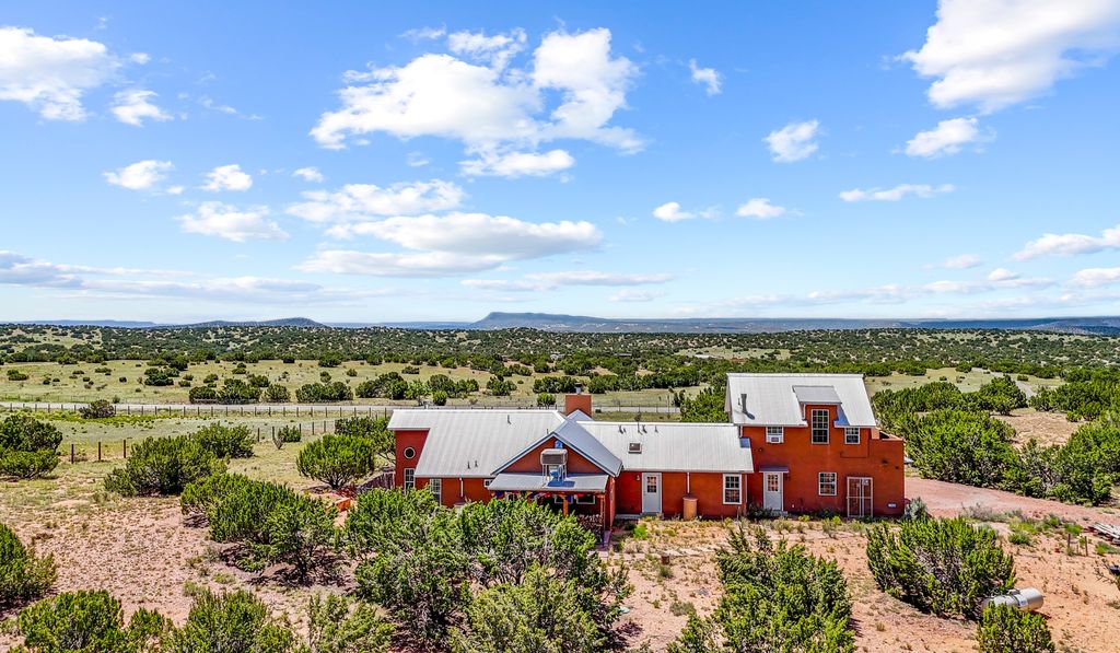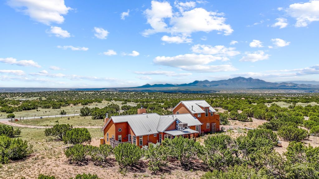 The second floor reveals a versatile studio, an ideal workspace with durable rubber flooring and a viewing deck that captures spectacular western sunsets over the Jemez and Ortiz Mountains. With views from almost every window and a rainwater catchment system, this 2-bedroom, 2-full-bathroom home is a sophisticated perch offering unmatched solitude and privacy.