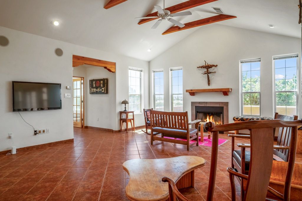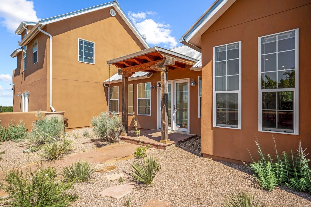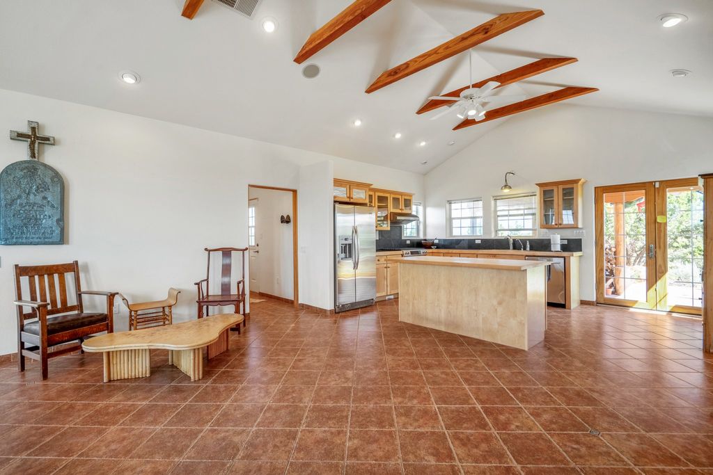 This move-in ready home masterfully blends a light-filled, soft contemporary feel with the soul of an authentic New Mexican ranch home. The clean, sophisticated design features a pitched metal roof, passive solar principles, and beautiful Saltillo tile floors accented with small decorative tiles.
