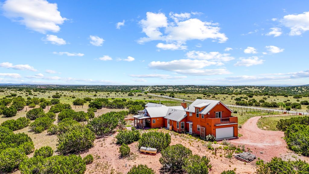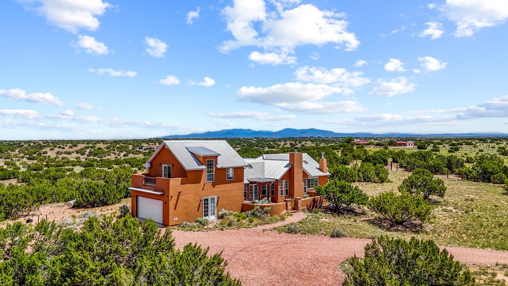 Discover a true work of art, designed and built by the artist who cherished it for 18 years. This private sanctuary sits on 10 acres of serene high-desert landscape just south of Santa Fe. Located off the scenic Turquoise Trail (Hwy 14), the gated property offers commanding views from its high point, showcasing the majestic Sangre de Cristo, Jemez, and Sandia Mountains, as well as Cerro Pelon, the Ortiz Mountains, and the Cerrillos Hills.