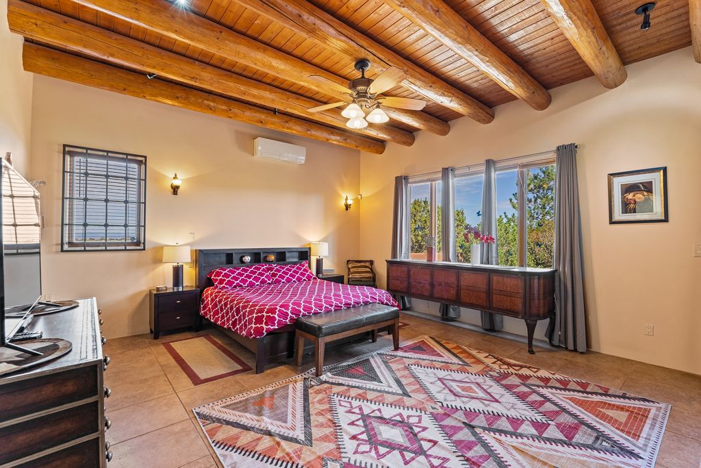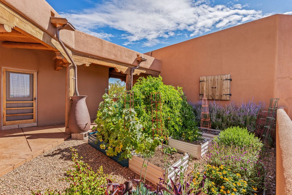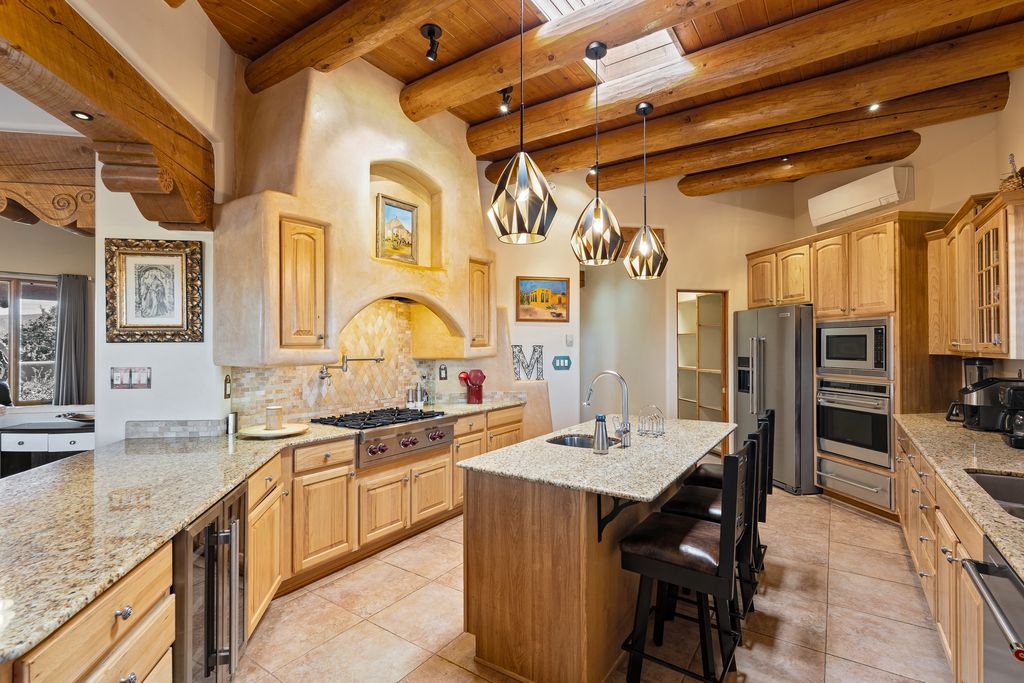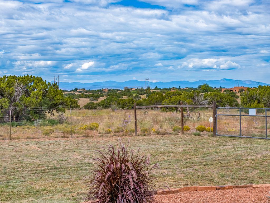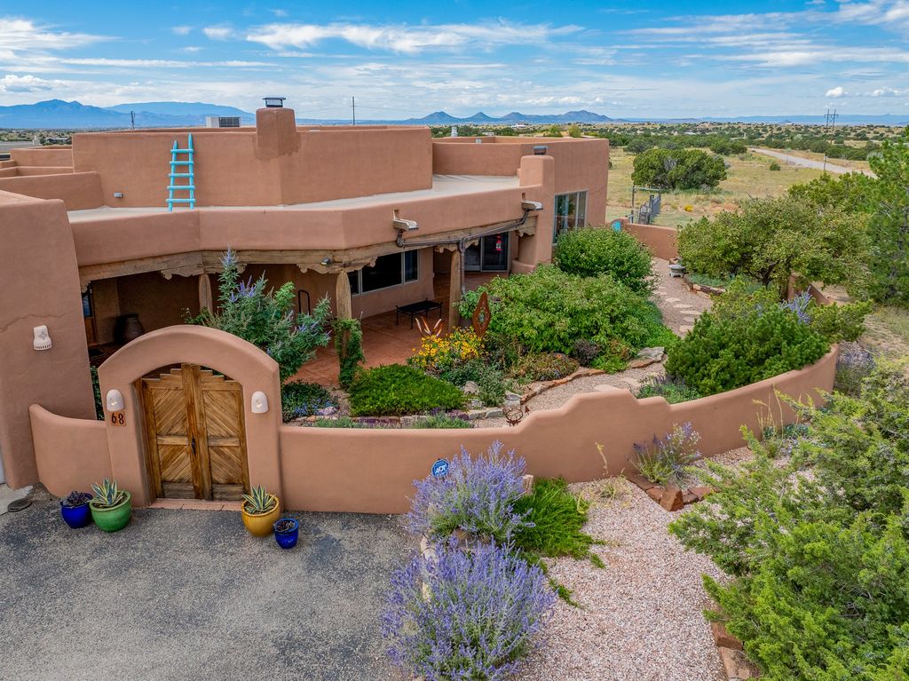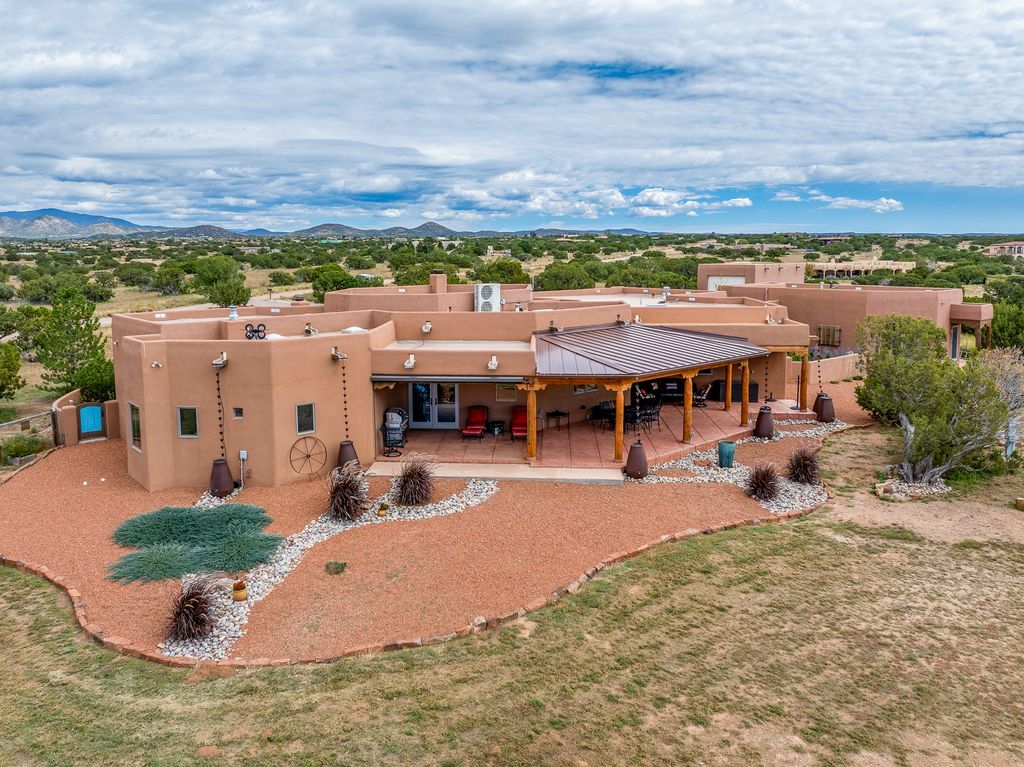 Wishing for a HOUSE/GUESTHOUSE/and a 5-CAR GARAGE with an additional RV GARAGE on 5 acres? Your wish has been granted! Just 20 minutes from downtown Santa Fe, this beautifully sited single-level property offers sweeping mountain views, abundant garage space, and classic regional charm. The 5-acre parcel (with ½ acre fenced) includes a 2,548 sq. ft. 3BD/2.5BA main residence and a connected 698 sq. ft. 1BD/1BA guest house"”ideal for guests and flexible use.The property features an attached/heated 3-car garage, an attached 2-car garage (connected to the guest house), and a heated/cooled RV garage, perfect for a hobbyist, car enthusiast or artist! The main residence captures expansive views of the Sangre de Cristo, Jemez, and Ortiz mountain ranges from a deep East-facing portal and a new 900 sq. ft. West-facing portal. The living room features a custom plastered and hand-painted kiva fireplace and beautifully hand-carved corbels. The kitchen is outfitted with granite countertops, a 6-burner Wolf range with a potfiller, two ovens (one convection microwave), warming drawer, a KitchenAid refrigerator, and an extra dual temp beverage refrigerator. The kitchen island has a second sink and seating for three. The breakfast bar with seating for 2 or 3 persons, creates an open flow to the dining area. The private primary suite enjoys a sitting area, east portal access, two walk-in closets, a soaking tub beside a gas fireplace, and a walk-in shower. The 2 guest bedrooms share a ¾ bathroom and have excellent separation from the main living areas. A breezeway connects the guest house, which enjoys its own patio and a beautifully maintained vegetable garden"”perfect for those wanting to grow fresh greens. Additional features include in-floor radiant heating, natural gas, 8 mini-splits, Eldorado community water. Horses are also allowed. A rare opportunity for peaceful country living with city conveniences"”this home blends beauty, functionality, and flexibility in one stunning package.