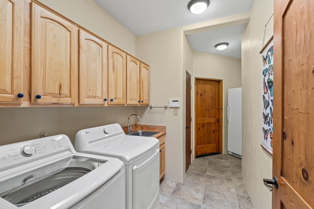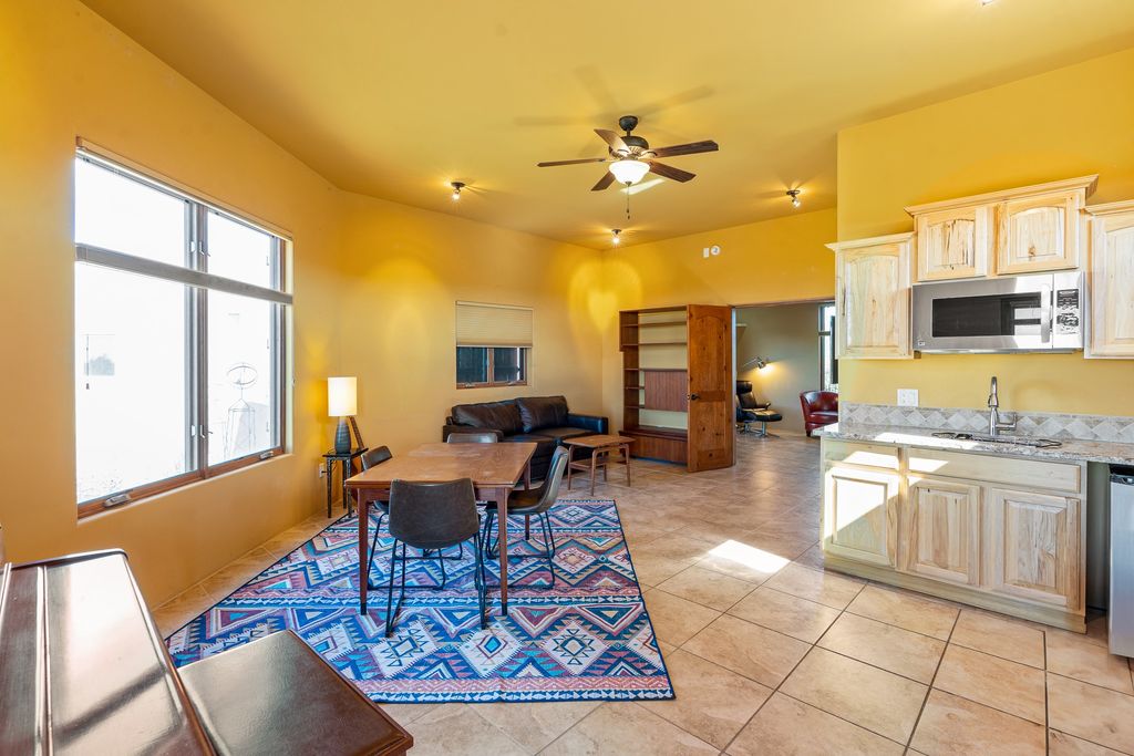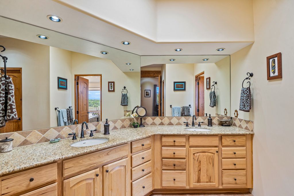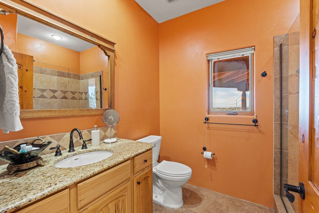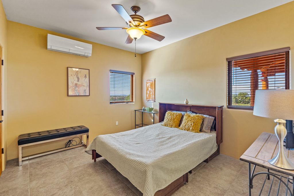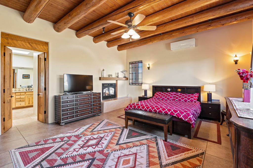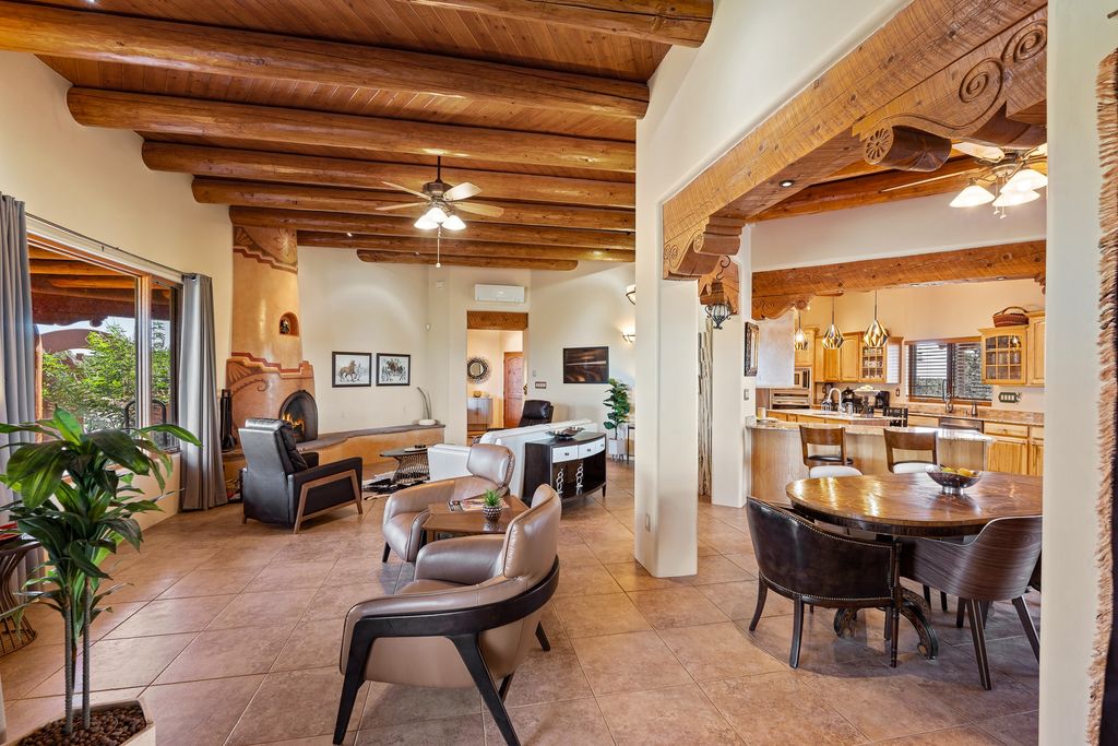 Wishing for a HOUSE/GUESTHOUSE/and a 5-CAR GARAGE with an additional RV GARAGE on 5 acres? Your wish has been granted! Just 20 minutes from downtown Santa Fe, this beautifully sited single-level property offers sweeping mountain views, abundant garage space, and classic regional charm. The 5-acre parcel (with ½ acre fenced) includes a 2,548 sq. ft. 3BD/2.5BA main residence and a connected 698 sq. ft. 1BD/1BA guest house"”ideal for guests and flexible use.The property features an attached/heated 3-car garage, an attached 2-car garage (connected to the guest house), and a heated/cooled RV garage, perfect for a hobbyist, car enthusiast or artist! The main residence captures expansive views of the Sangre de Cristo, Jemez, and Ortiz mountain ranges from a deep East-facing portal and a new 900 sq. ft. West-facing portal. The living room features a custom plastered and hand-painted kiva fireplace and beautifully hand-carved corbels. The kitchen is outfitted with granite countertops, a 6-burner Wolf range with a potfiller, two ovens (one convection microwave), warming drawer, a KitchenAid refrigerator, and an extra dual temp beverage refrigerator. The kitchen island has a second sink and seating for three. The breakfast bar with seating for 2 or 3 persons, creates an open flow to the dining area. The private primary suite enjoys a sitting area, east portal access, two walk-in closets, a soaking tub beside a gas fireplace, and a walk-in shower. The 2 guest bedrooms share a ¾ bathroom and have excellent separation from the main living areas. A breezeway connects the guest house, which enjoys its own patio and a beautifully maintained vegetable garden"”perfect for those wanting to grow fresh greens. Additional features include in-floor radiant heating, natural gas, 8 mini-splits, Eldorado community water. Horses are also allowed. A rare opportunity for peaceful country living with city conveniences"”this home blends beauty, functionality, and flexibility in one stunning package.
