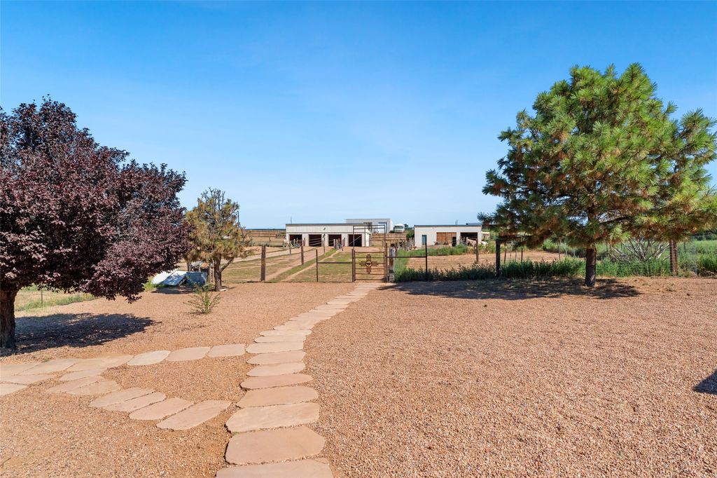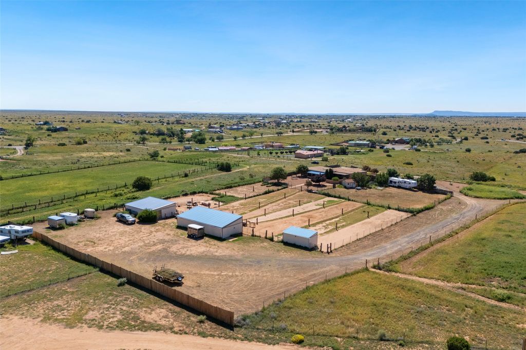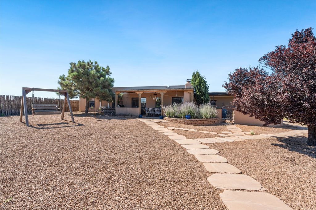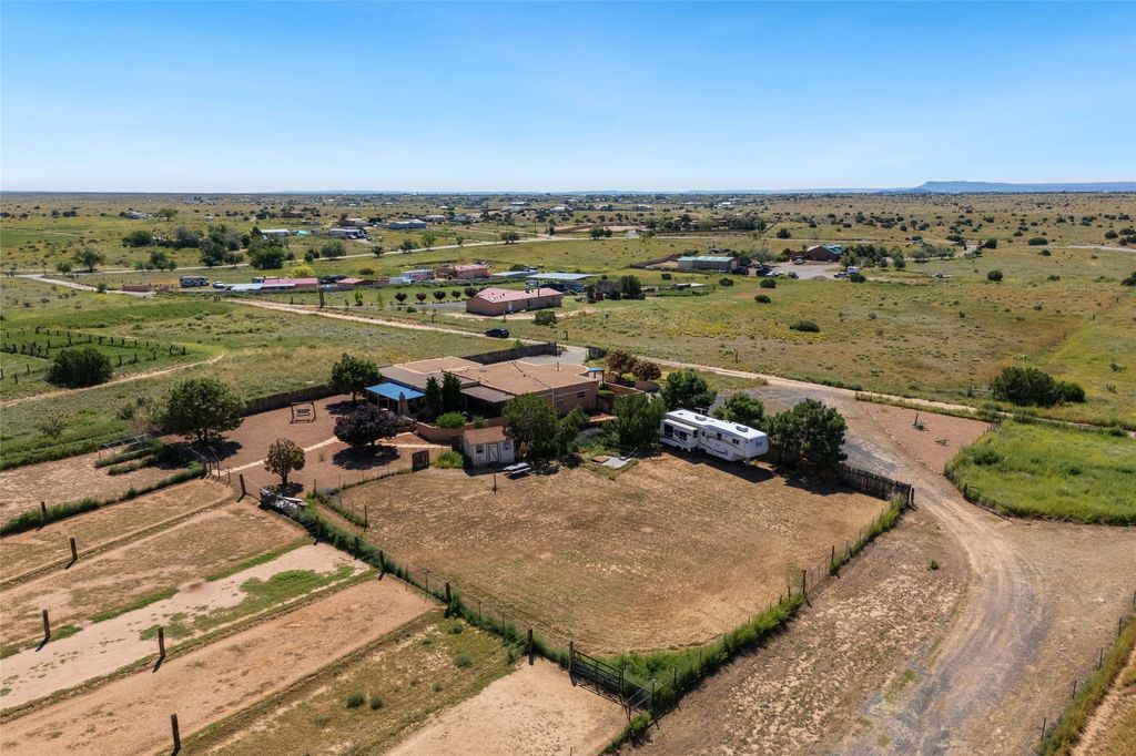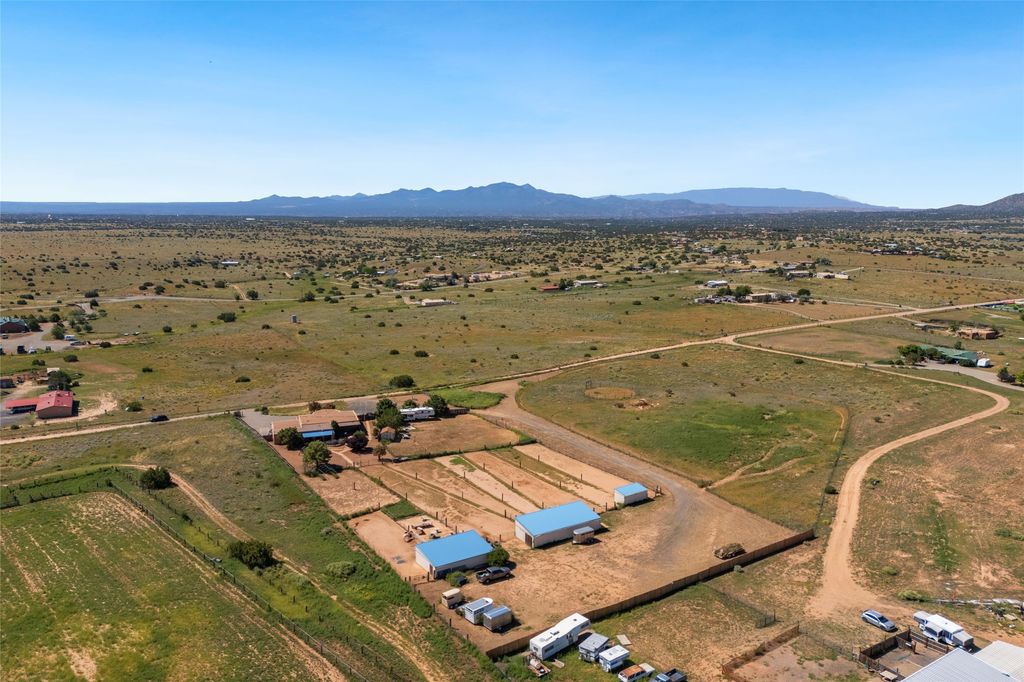 Set on 5.19 fully fenced acres with Sandia and Ortiz mountain views, this 3-bedroom, 2-bath single-level home combines Southwestern character with equestrian-ready facilities and thoughtful upgrades. The 2,645-square-foot residence features a light-filled open floor plan, tile and wood flooring, and expansive south-facing windows that frame mountain views. The circular living room with wood stove flows into the dining area and kitchen, while two covered portals extend the living space outdoors. The attached two-car garage with direct entry was insulated and finished in 2023. Horse facilities include two barns with stalls and turnouts for up to 12 horses, water, power, and lighting, a 60' round pen, and a four-acre no-climb fenced field. Recent improvements include solar electric fencing (2019), new barn siding (2020), gutters (2021), water spigots and conduits (2022), chicken wire installation in barn ceilings (2023), RV hookups (2023), and a solar-powered gate opener (2024). Additional enhancements include new kitchen lighting and interior paint (2023) and a 12' x 14' storage shed (2022). With no HOA restrictions, this property offers flexibility for horse enthusiasts and hobbyists alike. Located just 4 minutes from San Marcos Café & Feed, 12 minutes from Cerrillos, 16 minutes from Madrid, and 22 minutes from Santa Fe shopping and dining, this peaceful property offers mountain views, extensive infrastructure, and a quintessential Santa Fe lifestyle.
