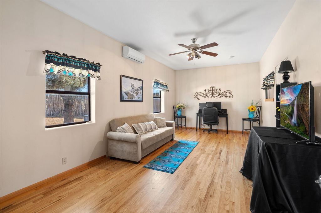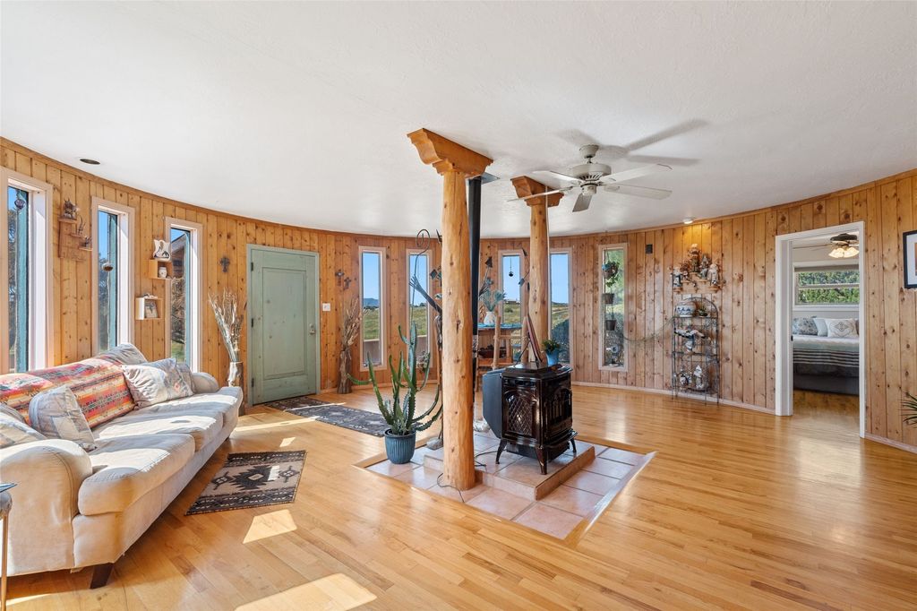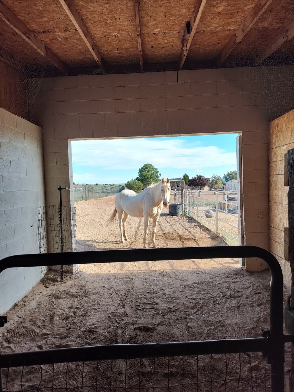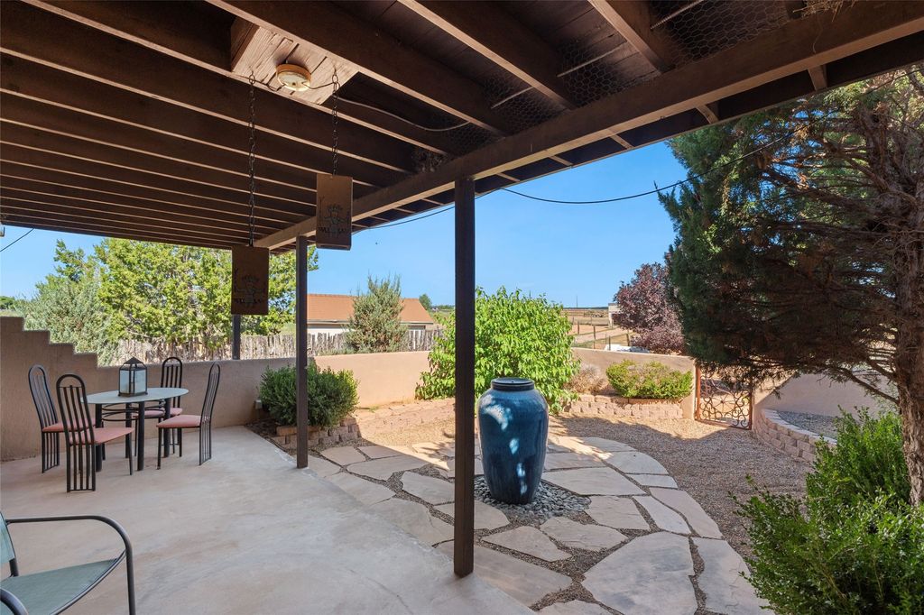Set on 5.19 fully fenced acres with Sandia and Ortiz mountain views, this 3-bedroom, 2-bath single-level home combines Southwestern character with equestrian-ready facilities and thoughtful upgrades. The 2,645-square-foot residence features a light-filled open floor plan, tile and wood flooring, and expansive south-facing windows that frame mountain views. The circular living room with wood stove flows into the dining area and kitchen, while two covered portals extend the living space outdoors. The attached two-car garage with direct entry was insulated and finished in 2023. Horse facilities include two barns with stalls and turnouts for up to 12 horses, water, power, and lighting, a 60' round pen, and a four-acre no-climb fenced field. Recent improvements include solar electric fencing (2019), new barn siding (2020), gutters (2021), water spigots and conduits (2022), chicken wire installation in barn ceilings (2023), RV hookups (2023), and a solar-powered gate opener (2024). Additional enhancements include new kitchen lighting and interior paint (2023) and a 12' x 14' storage shed (2022). With no HOA restrictions, this property offers flexibility for horse enthusiasts and hobbyists alike. Located just 4 minutes from San Marcos Café & Feed, 12 minutes from Cerrillos, 16 minutes from Madrid, and 22 minutes from Santa Fe shopping and dining, this peaceful property offers mountain views, extensive infrastructure, and a quintessential Santa Fe lifestyle.