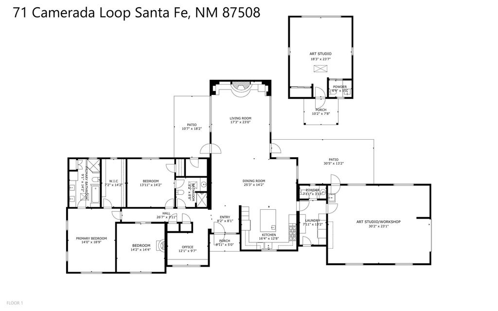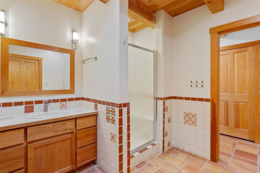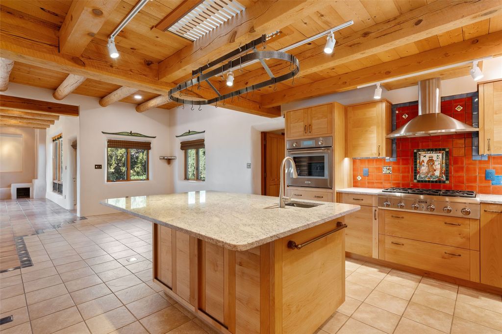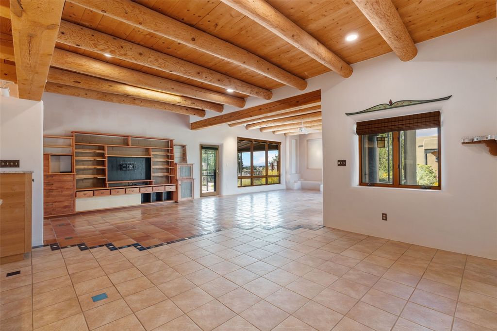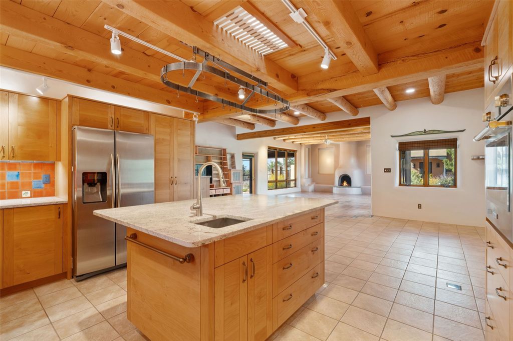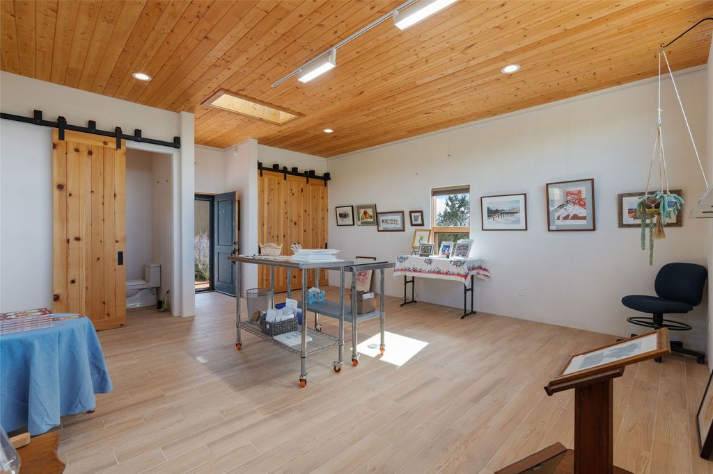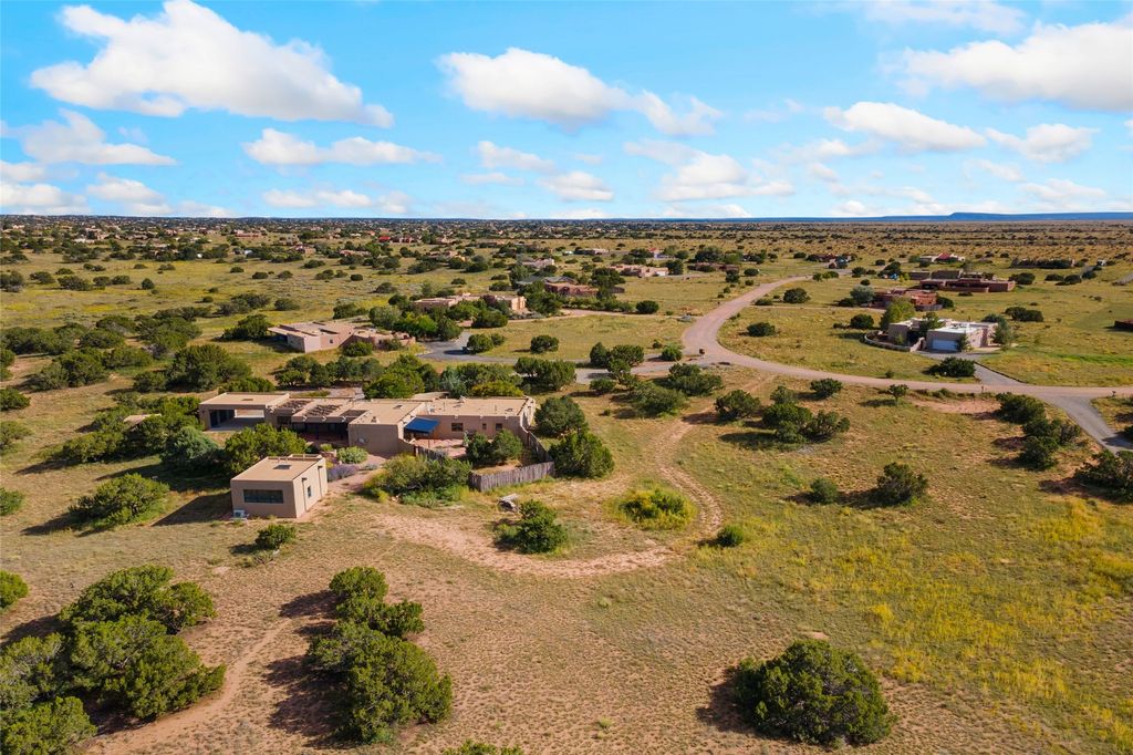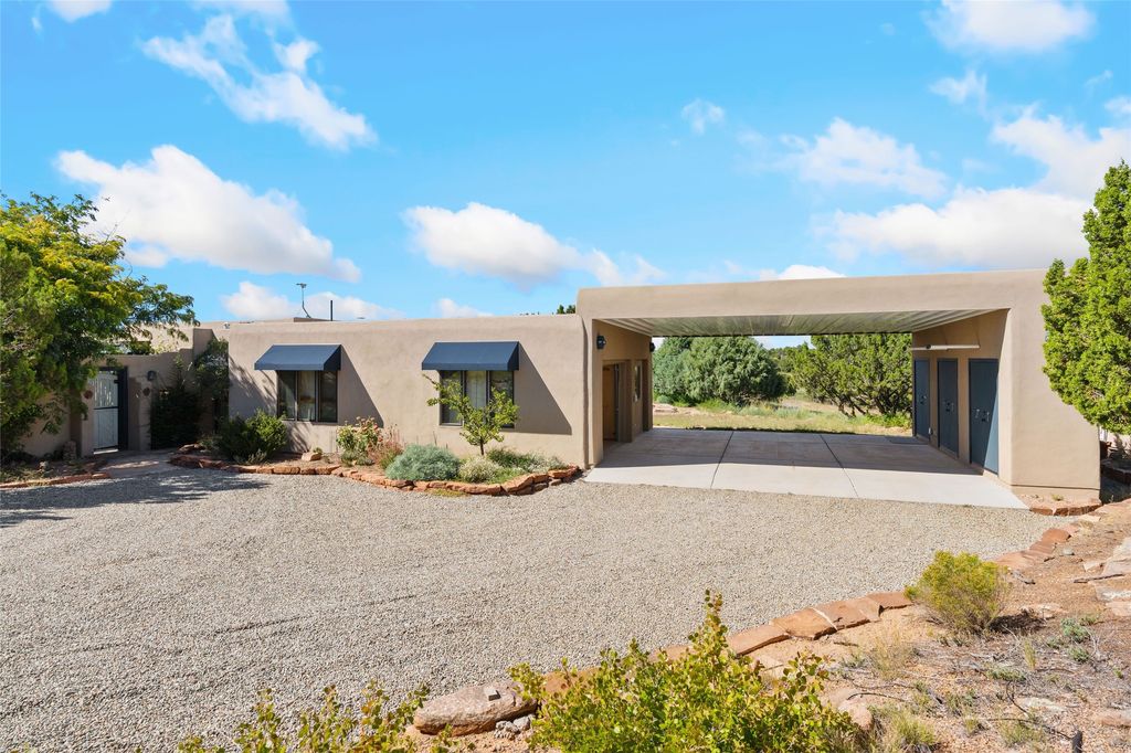 Introducing an elegant, single level, custom adobe home on almost 2 acres with absolutely everything! With an office area, 3 bedrooms, two art studios and 3 patios, the house is flexible enough for the most discerning Buyer. Walk to the front door through a large beautifully landscaped, walled courtyard and enter this light and bright home with high beamed ceilings and a dramatic fireplace - the incredible views to the east and to the west bring the outdoors in. Glass doors open to two different outdoor patios. The spacious open floor plan leads you naturally from the breathtaking living room, to the cozy, comfortable dining area which opens onto the renovated, gourmet, custom kitchen. Alder cabinets, granite countertops, under cabinet lighting and excellent appliances - every detail of this home was lovingly crafted and thoughtfully designed. The contemporary primary suite has a large walk-in closet and the bathroom has a jetted walk-in tub as well as a separate shower area. Another bedroom has a large fireplace and the two guest bedrooms share a bathroom with cheerful Mexican tile. Yes, two separate art studios! First, an attached former woodwork shop/ceramics studio with radiant heat followed by the newly constructed separate studio with high ceilings, art storage, excellent light and a bathroom. The studio has custom raw lime plaster walls. Light filled, with beautiful views from every window, the house is situated on an expansive greenbelt; quiet and privacy prevail. The home has solar panels providing supplemental electricity and a shared well, with excellent water, so utility bills are minimal. Improvements include a 2-year-old roof with a 10-year warranty, a high efficiency boiler with tankless hot water, drip irrigation and a large attached car port with high ceilings and ample storage. There is even a Catio for your feline friends!