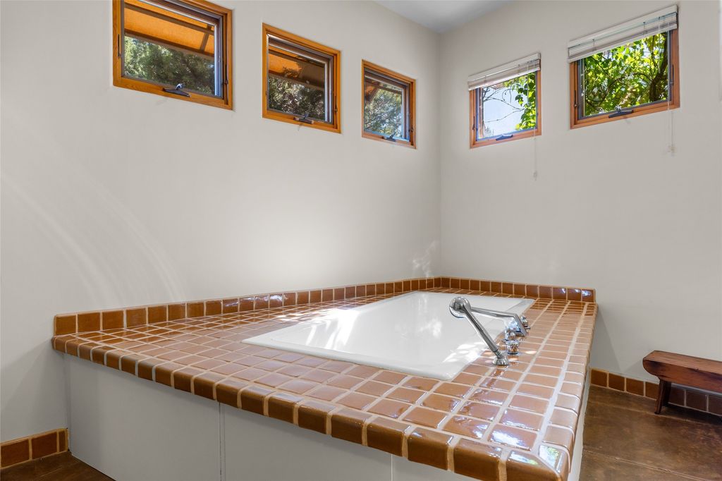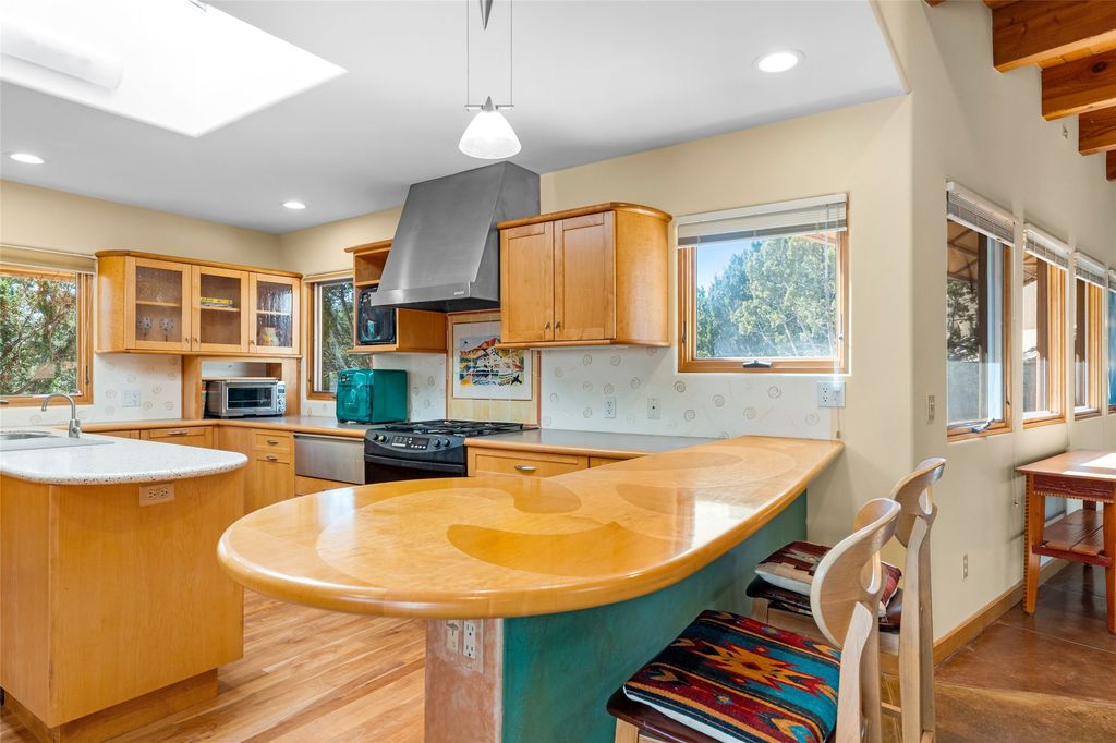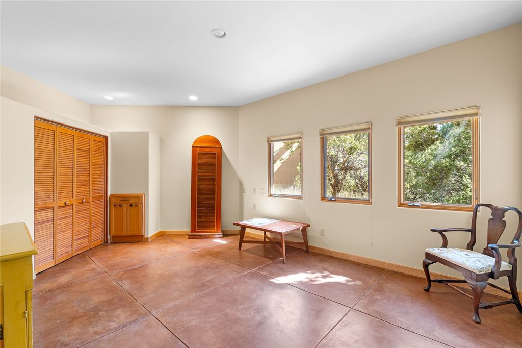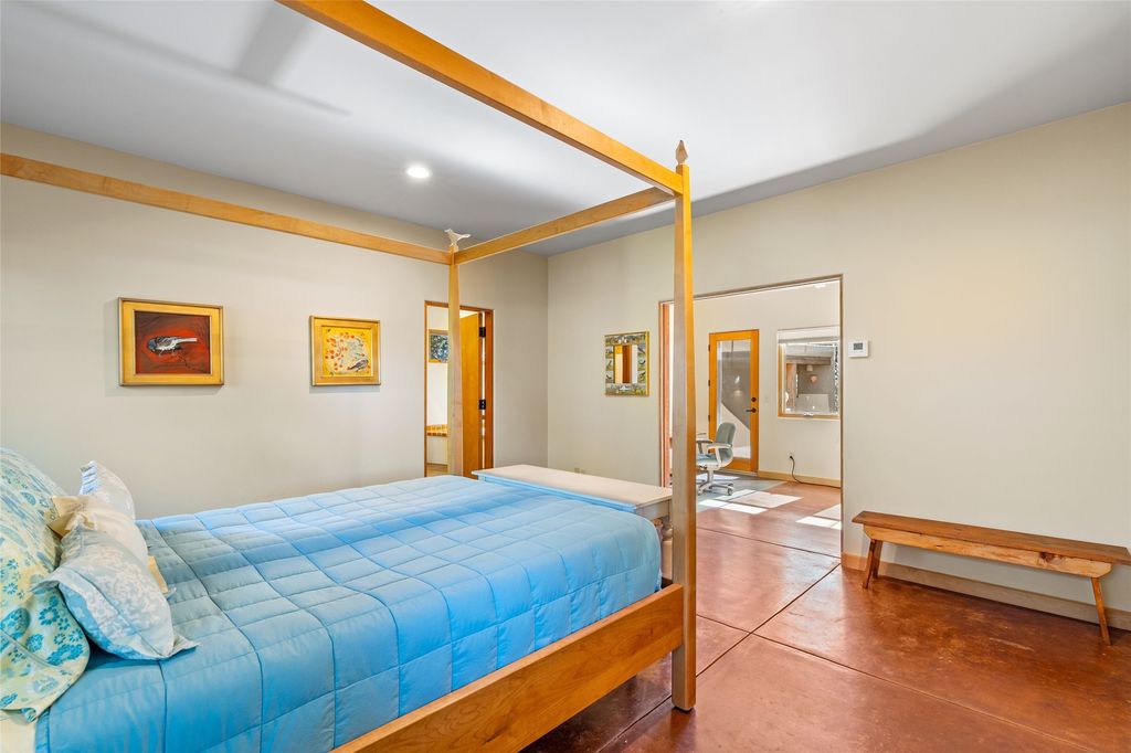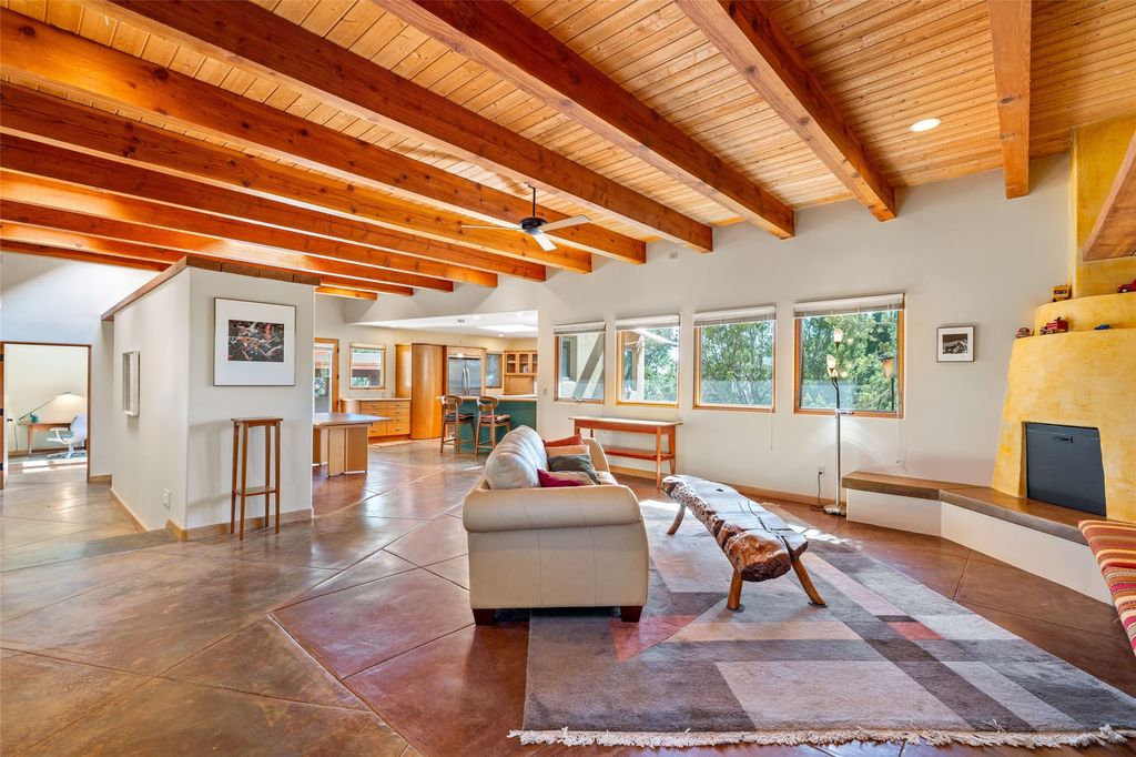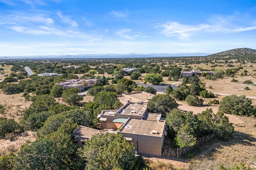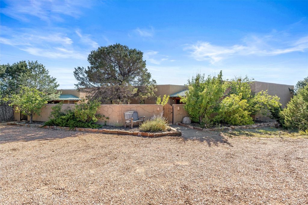 Offered for the first time since its construction in 1997 by renowed builder J. Koledin, this custom single-level residence blends soft contemporary design with mid-century modern influences and New Mexico charm in a peaceful, private setting. Nestled on approximately three acres at the end of a paved cul-de-sac within the exclusive, gated, Belicia Estates, the home offers both tranquility and convenient access to Santa Fe. A walled and gated patio entry opens to a warm and inviting living area, highlighed by a custom fireplace and striking wood-beamed ceilings. The kitchen features cherry wood flooring, custom cabinetry, and artful wall tile, while colored concrete floors with radiant heating flow throughout the rest of the home. The floor plan provides excellent bedroom separation, a dedicated office adjacent to the primary suite, private studio, laundry room with porcelain sink, plentiful cabinetry. A detached open-air structure near the rear courtyard serves as a serene retreat-perfect for yoga, exercise, or creative purcuits. Additional features include an oversized two-car garage with ample parking nearby. Set within a private, conservation-minded community of just 44 homesites, this distinctive property offers sweeping mountain views, exceptional privacy, and effortless proximity to downtown Santa Fe.