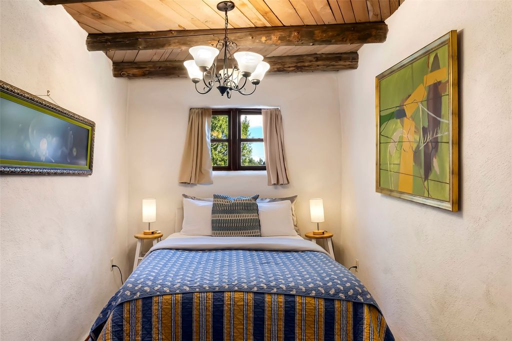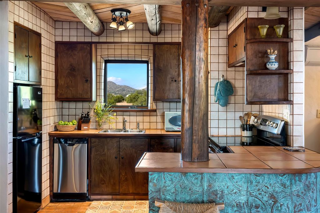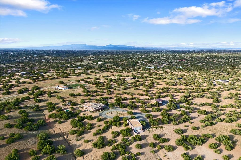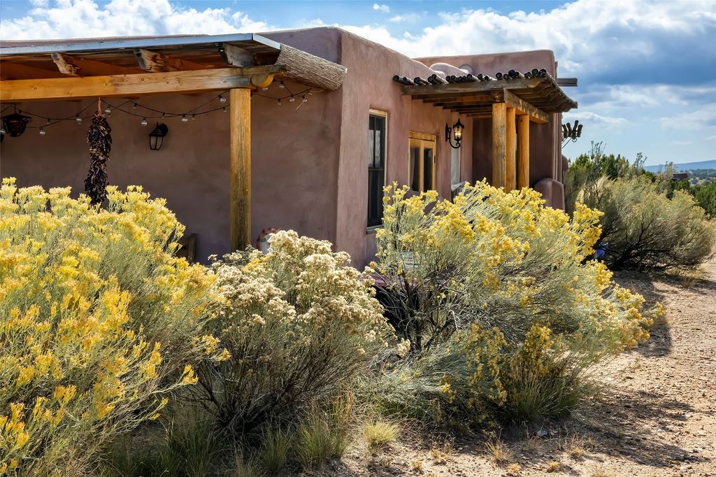 Experience the ultimate Southwestern lifestyle"”where vast skies, sweeping mountain vistas, and timeless Santa Fe architecture come together on 12.5 private acres along the historic Turquoise Trail. Just a short drive from Santa Fe, this rolling, historic parcel offers three distinct structures: a two-bedroom main house, a one-bedroom guest casita, and an open-plan studio"”ideal for an artist's workspace, creative retreat, or flexible additional living space. The main residence blends authenticity and comfort with hallmark Santa Fe craftsmanship. High ceilings with massive round vigas, hand-painted Mexican tile, custom wood doors, and hand-forged ironwork create a home rich in character and warmth. Natural light fills each room, and the easy flow to multiple patios and portals makes outdoor living effortless. From every vantage, the property captures stunning views of surrounding mountain ranges and the endless New Mexico sky"”perfect for entertaining, dining alfresco, or quiet reflection. The freestanding one-bedroom, one-bath guest casita offers its own sense of serenity, with multiple outdoor living spaces that frame sweeping views of the Ortiz Mountains. Ideal for guests or extended stays, it provides privacy while keeping nature close at hand. The nearby studio, with its open-concept design, dedicated bedroom space, kitchen, and inspiring light, is a dream space for artists, writers, or anyone seeking a creative sanctuary. Rooted in history, this land was once part of the ancient San Marcos Pueblo, offering a deep sense of place and tranquility. Here, privacy, beauty, and authenticity define daily life"”all within easy reach of Santa Fe's renowned culture, dining, and galleries.