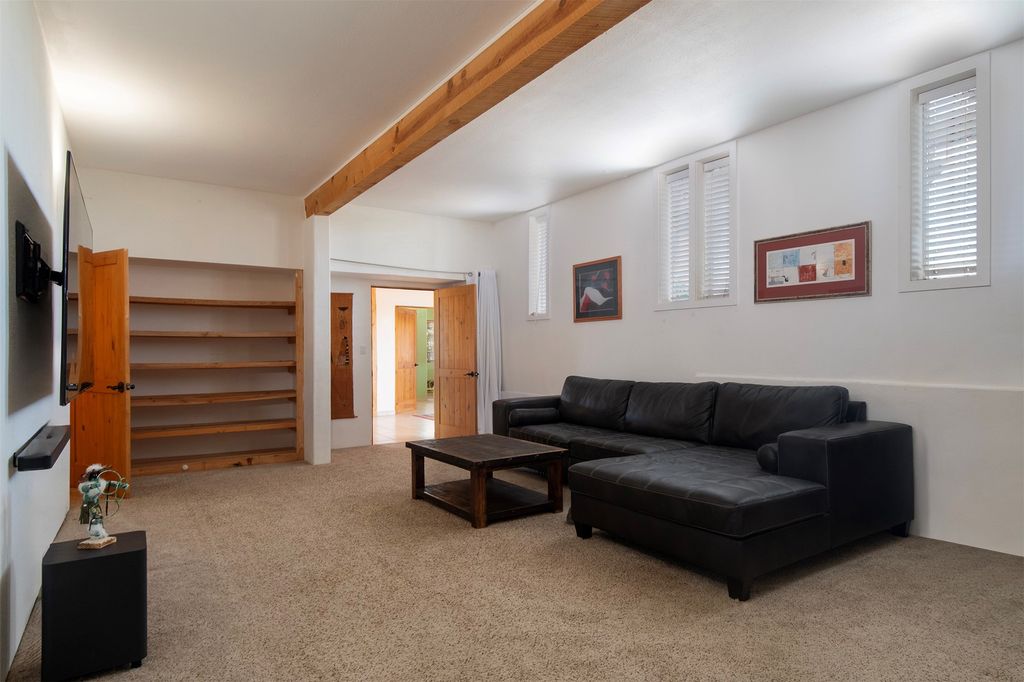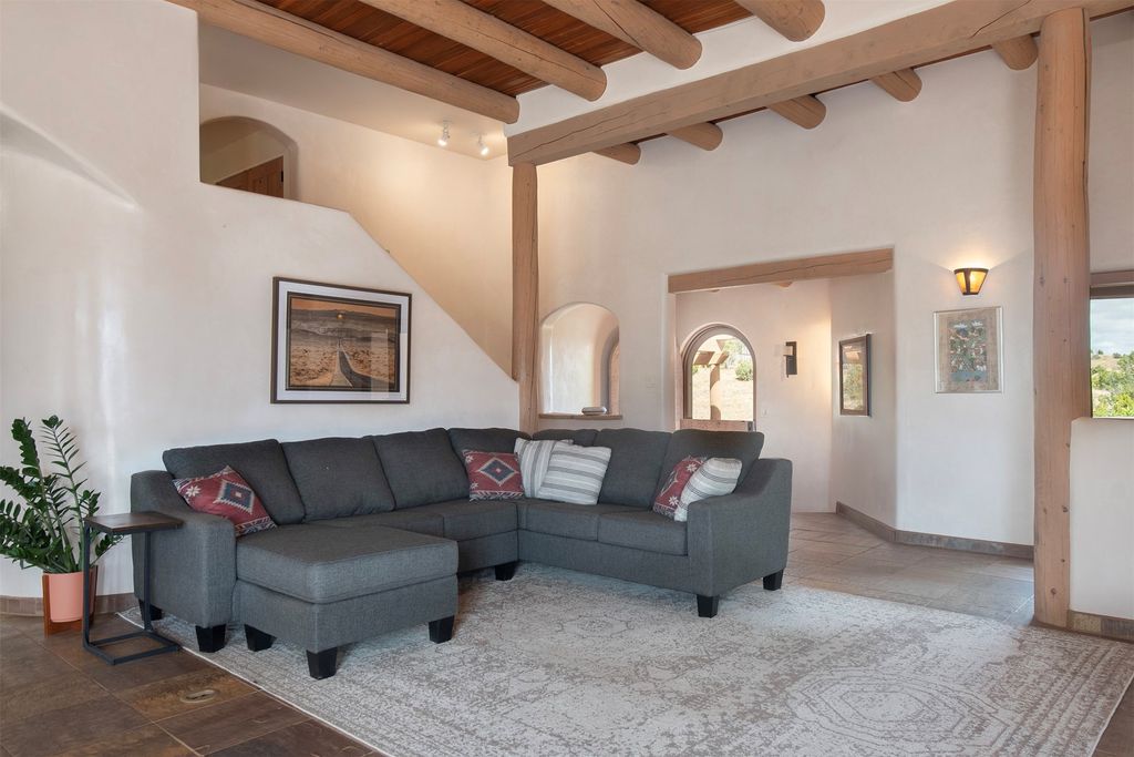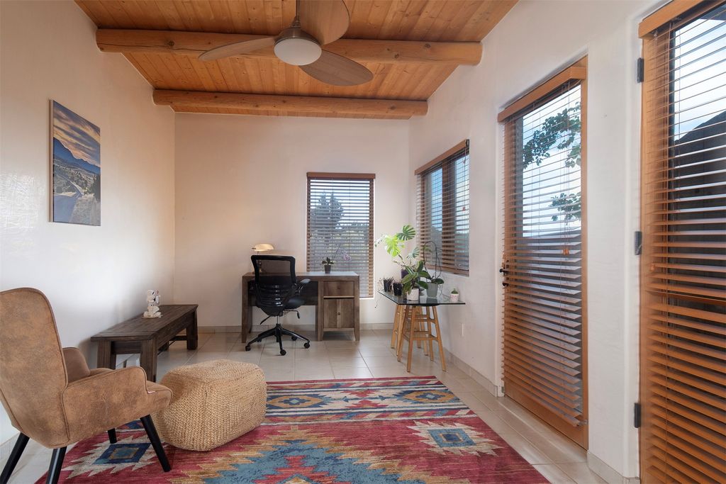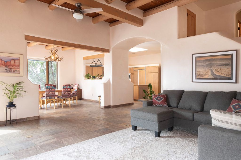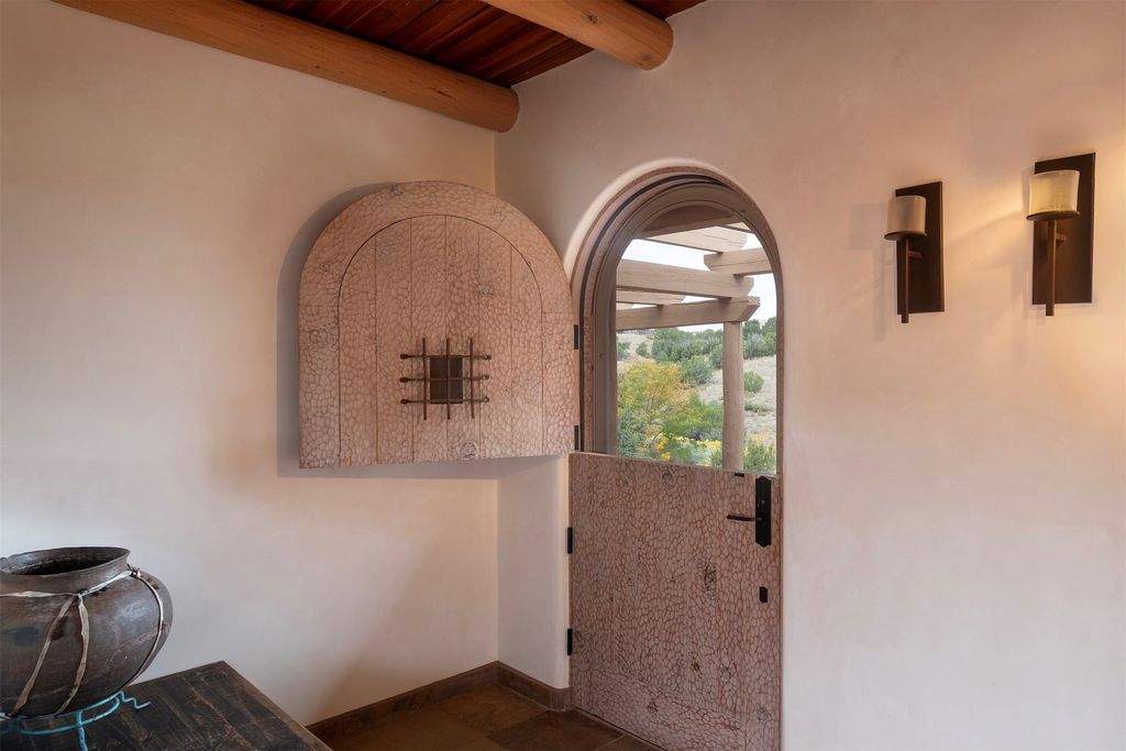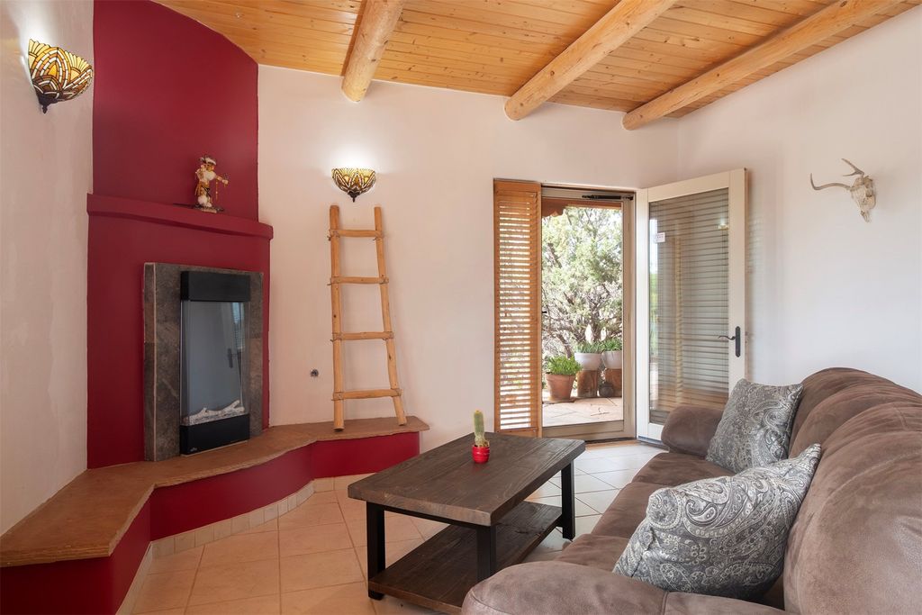 Inside the main residence, classic Santa Fe charm shines throughout. A spacious chef's kitchen is the heart of the home, while high ceilings with cedar latillas, hard trowel plaster walls, and multiple kiva fireplaces add warmth and character. A pellet stove ensures cozy comfort.