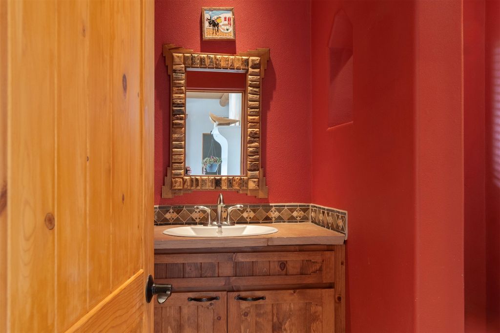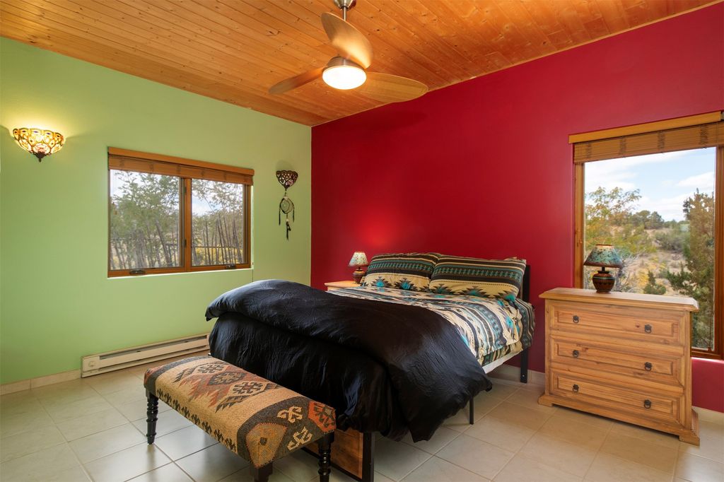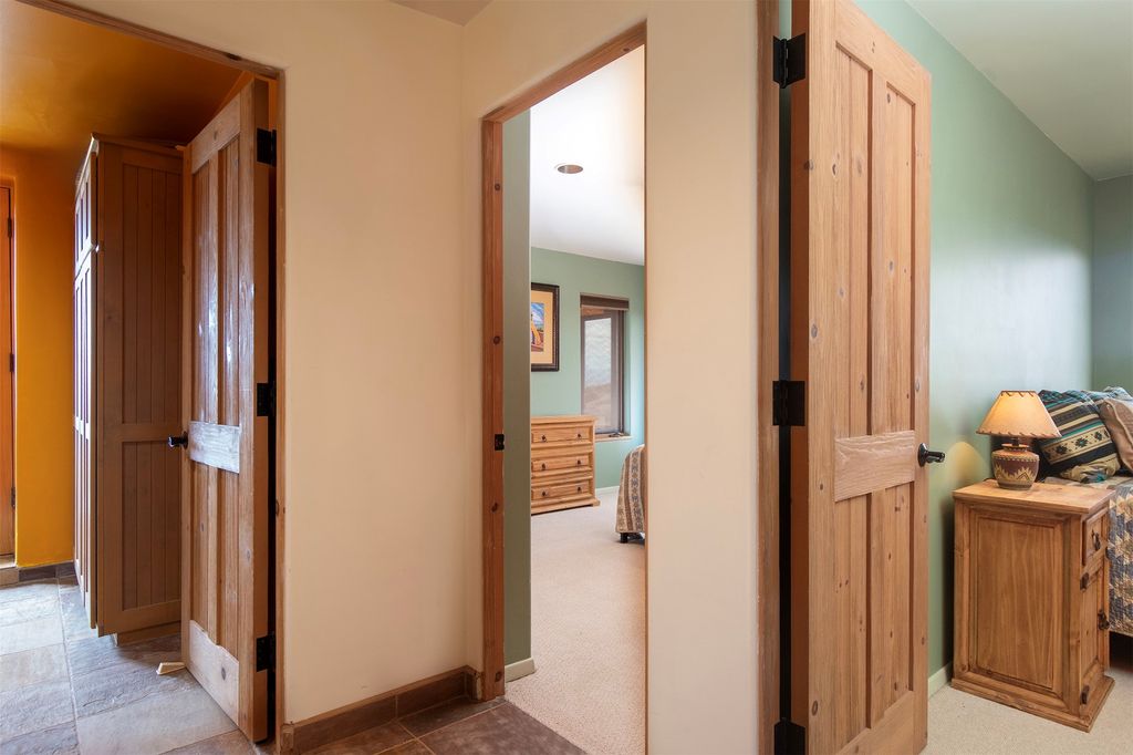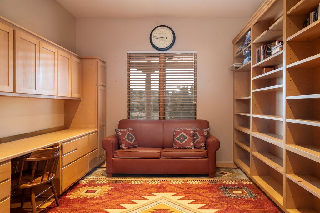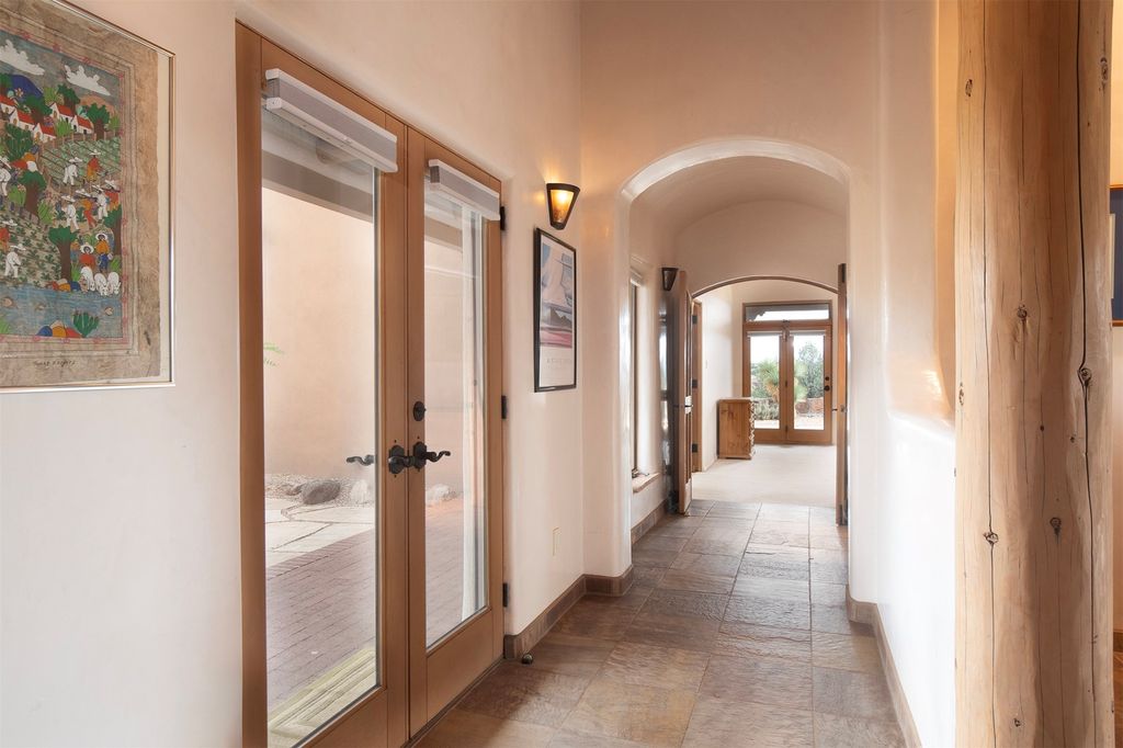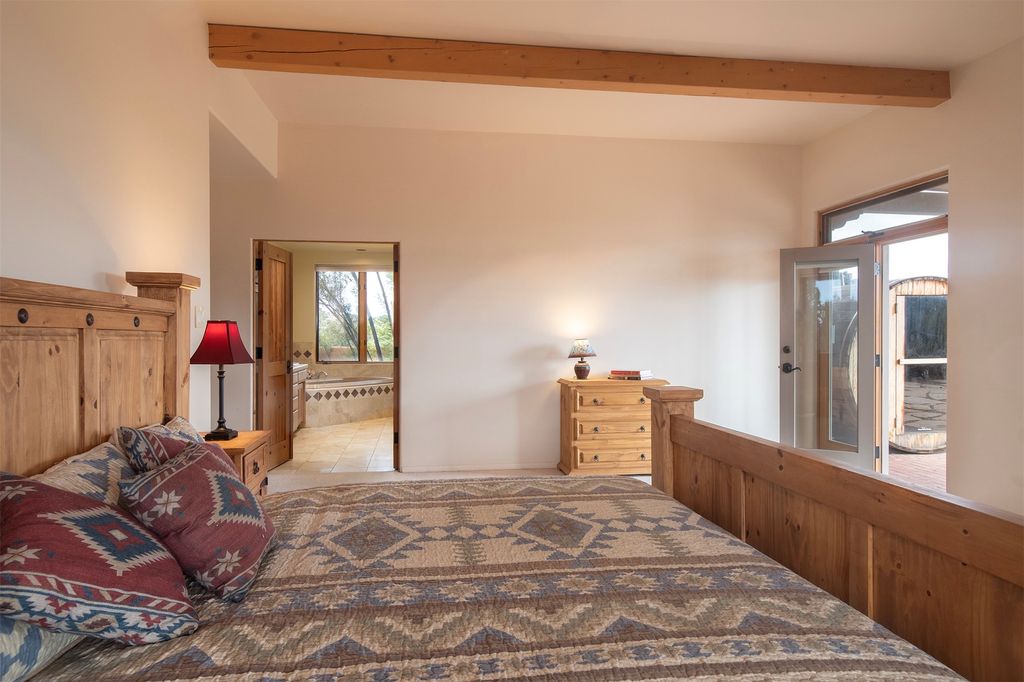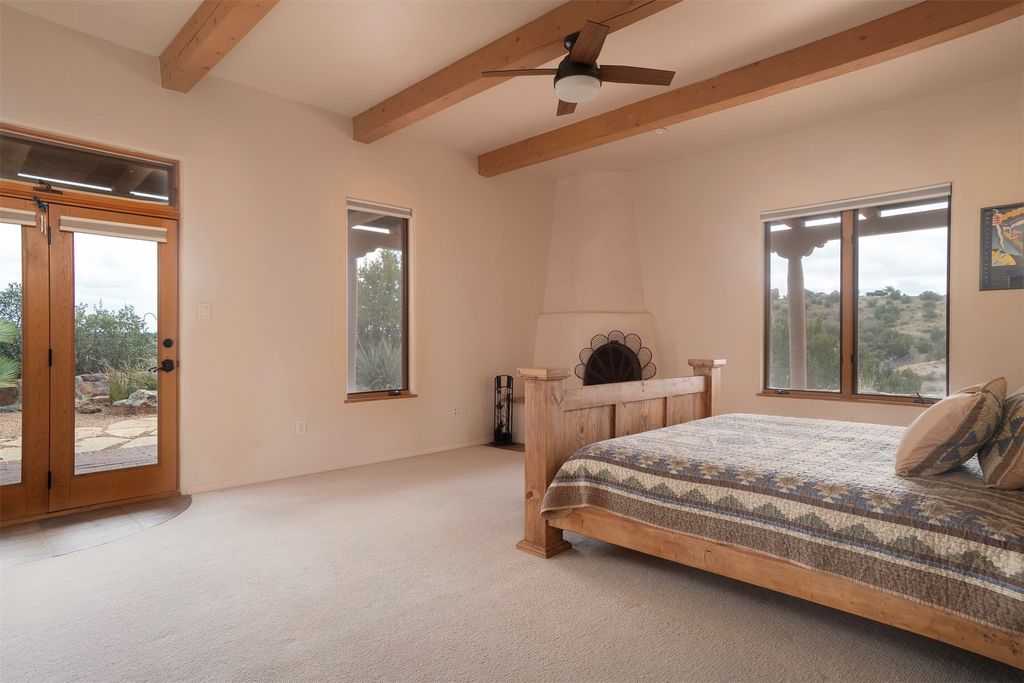 Inside the main residence, classic Santa Fe charm shines throughout. A spacious chef's kitchen is the heart of the home, while high ceilings with cedar latillas, hard trowel plaster walls, and multiple kiva fireplaces add warmth and character. A pellet stove ensures cozy comfort.