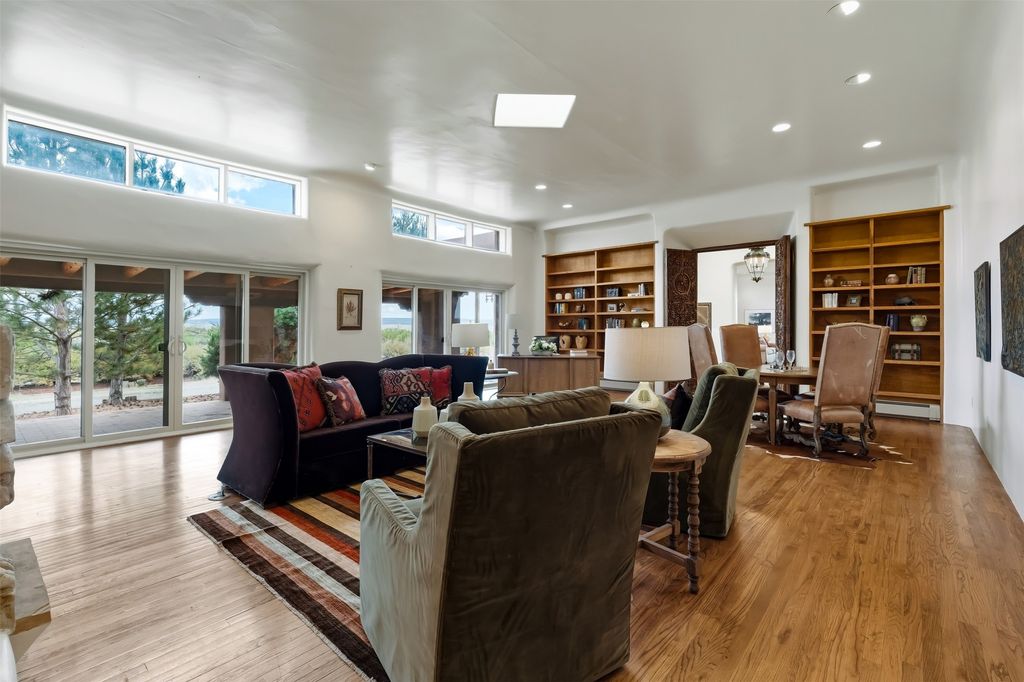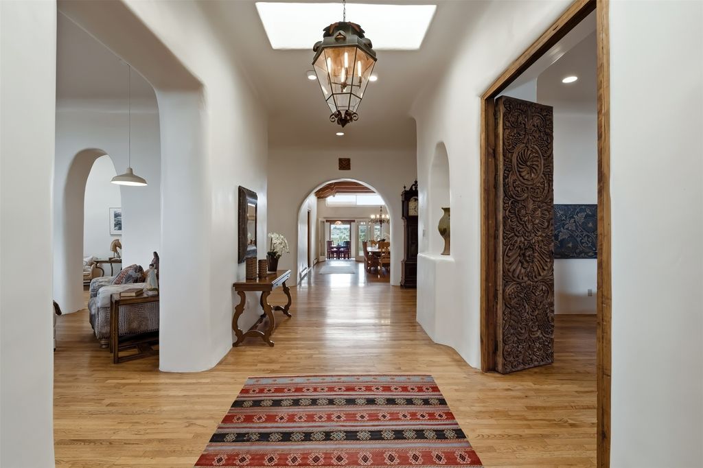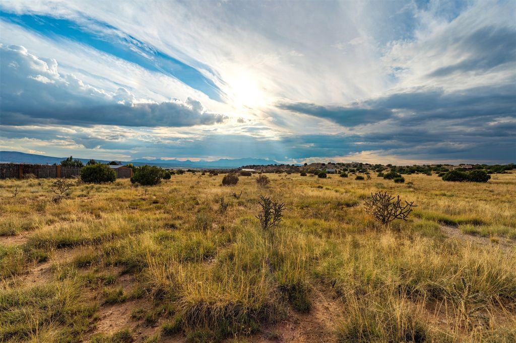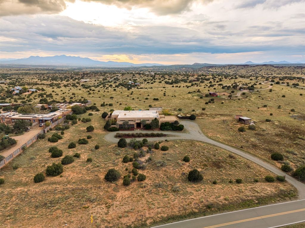In the quaint village of Galisteo lies this gracious and majestic home with adjoining 5 acre lot, for a total of 10 acres, known as 'Hacienda del Sol." One hundred years ago was the site of the Old Galisteo School House. The original 1886 bell and corner stone 1938 were placed within the walls of this present day home. Built atop of a gentle hill with stunning views of the Galisteo Basin, Sangre de Cristos and Jemez Mountains along with huge white puffy cloud formations in a brilliant blue sky greet you everyday. Large rooms with cathedral ceilings flooded with light, sculptured fireplaces, oak and pine floors with 10 foot elegantly carved doors delight the eye upon entering. Screened in, is a lovely outdoor patio with vast, distant views. A gallery hallway runs the length of the house craving art, paintings, photographs, memorabilia. A chef's kitchen with a six burner stove, center islands, prep sinks has everything one would want. An elegant dining room with arched walls, subtle lighting, and carved cabinets allow for many guests or small intimate settings. Three Bedroom suites each with fireplaces and luscious bathrooms are perfectly placed for privacy. An attached "casita" with kitchen and bath is off one of the wings of the home. Outside, there is a circular, walled patio area for summer gatherings and moon lit nights. Included in this fabulous property is a blue gate opening up to an adjoining 5 acre parcel of vacant land accessed off of Camino San Cristobal used for pleasure or as additional acreage for another home, studio, horses, and imagination. Dream on...