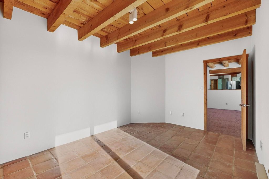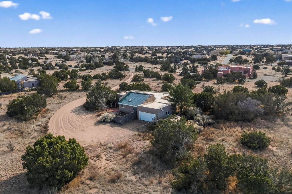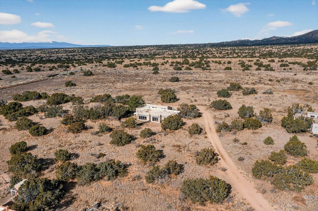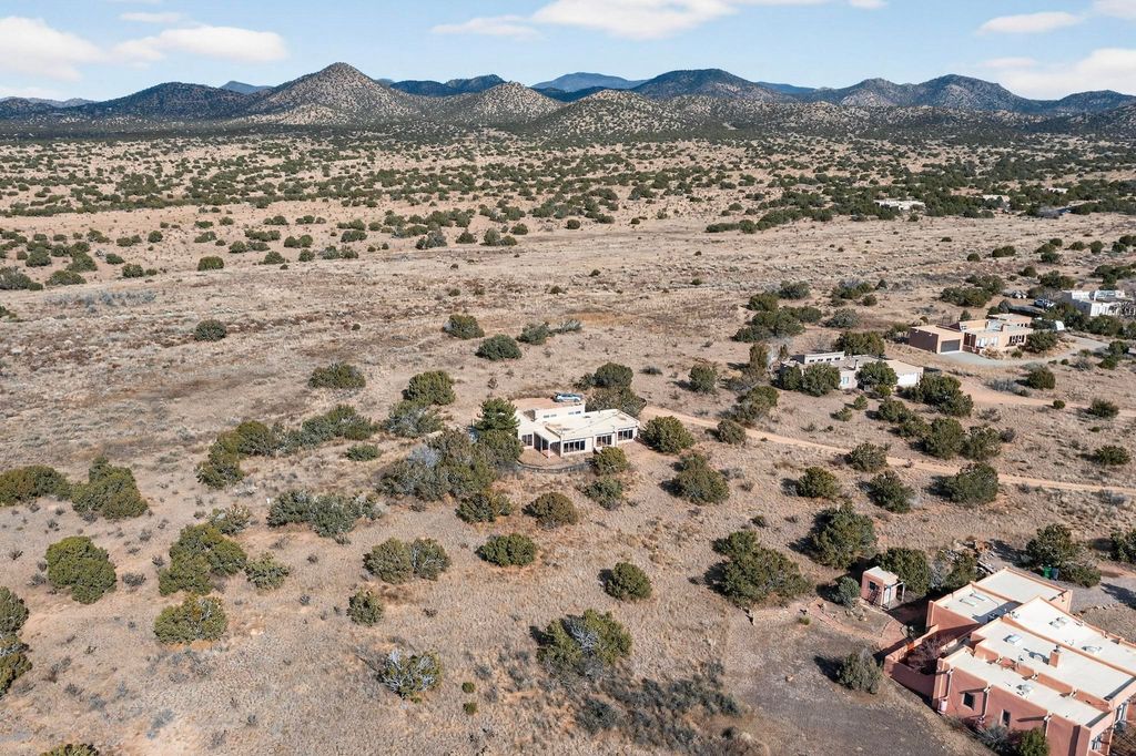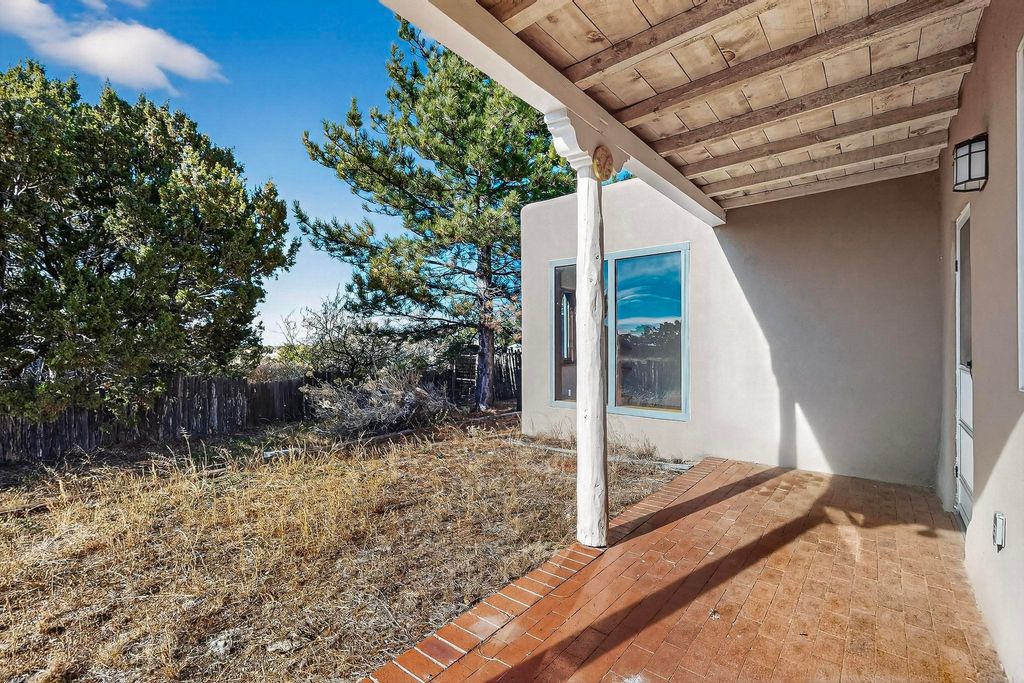 Located on an expansive Eldorado open space this is ideal for the night sky and naturalist enthusiast. Lovely traditional open plan, 1840sf passive solar design built by James Garton in 1990. The sunny split bedroom floorpan provides excellent separation for the main bedroom from the two guest bedrooms plus there is also a separate studio/den. Gleaming Santa Fe style saltillo tile and brick floors and beam ceilings throughout most rooms. Long south facing windows replaced in 2020, bring in the winter heat with overhangs adding shade in the summer.. A new TPO roof was installed in 2022. All appliances have been replaced in the last 5 years, and the hot water heater was replaced in 2020. There is a whole house filtering system, and a private front view brick patio added in 2021. here is an oversized 2 car garage plus plenty of guest parking. This home is accessed by paved roads and is within easy reach of Eldorado amenities, local shopping, schools, library and the senior center, only minutes into Santa Fe.