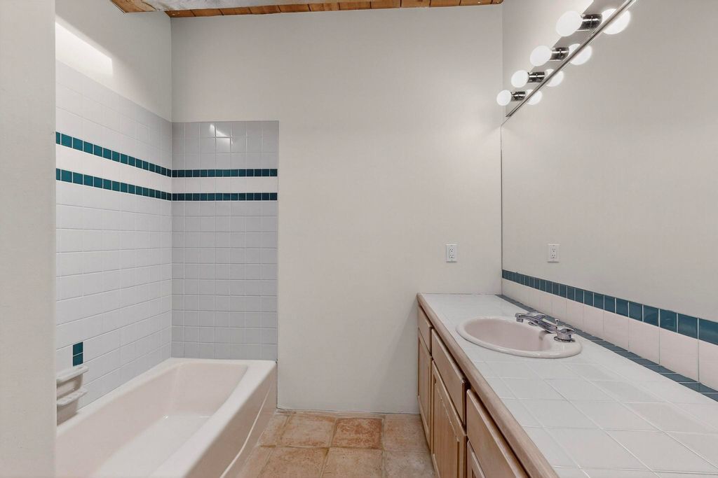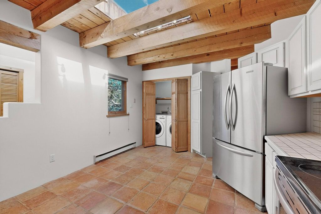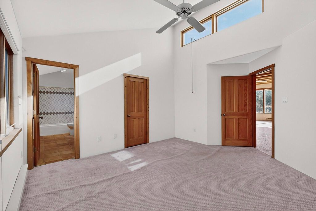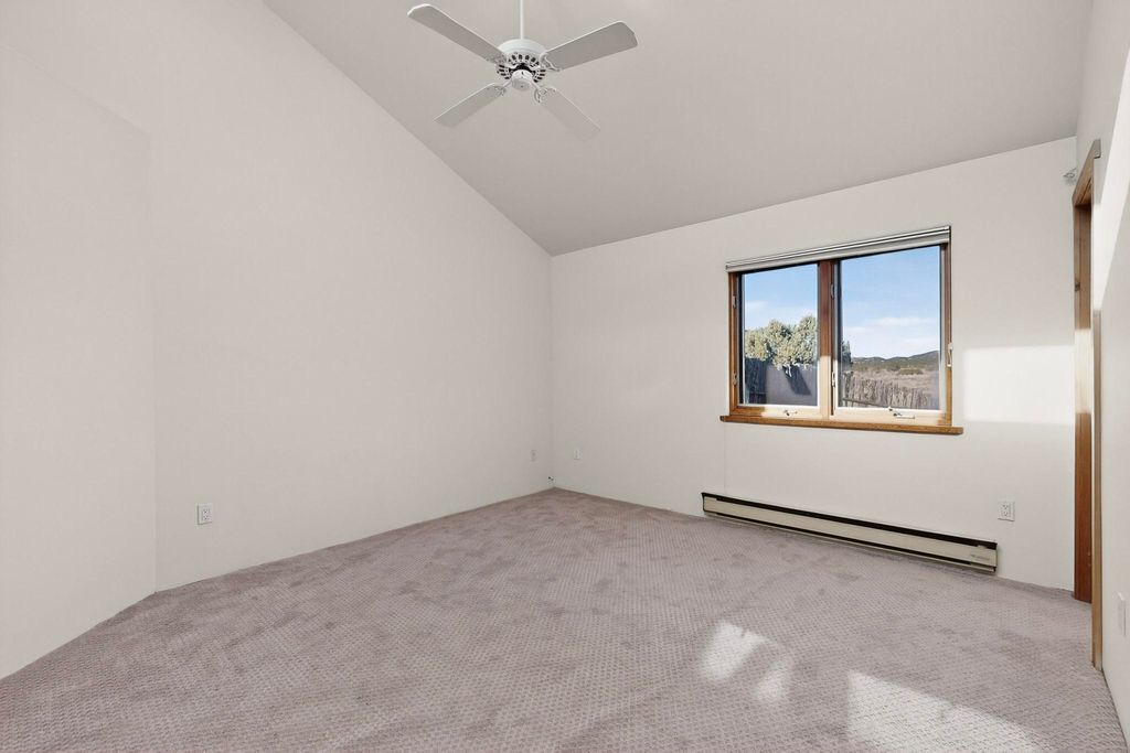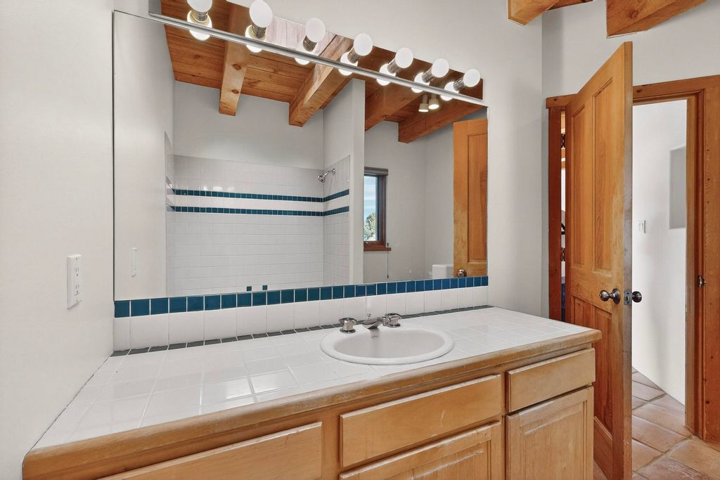 Located on an expansive Eldorado open space this is ideal for the night sky and naturalist enthusiast. Lovely traditional open plan, 1840sf passive solar design built by James Garton in 1990. The sunny split bedroom floorpan provides excellent separation for the main bedroom from the two guest bedrooms plus there is also a separate studio/den. Gleaming Santa Fe style saltillo tile and brick floors and beam ceilings throughout most rooms. Long south facing windows replaced in 2020, bring in the winter heat with overhangs adding shade in the summer.. A new TPO roof was installed in 2022. All appliances have been replaced in the last 5 years, and the hot water heater was replaced in 2020. There is a whole house filtering system, and a private front view brick patio added in 2021. here is an oversized 2 car garage plus plenty of guest parking. This home is accessed by paved roads and is within easy reach of Eldorado amenities, local shopping, schools, library and the senior center, only minutes into Santa Fe.