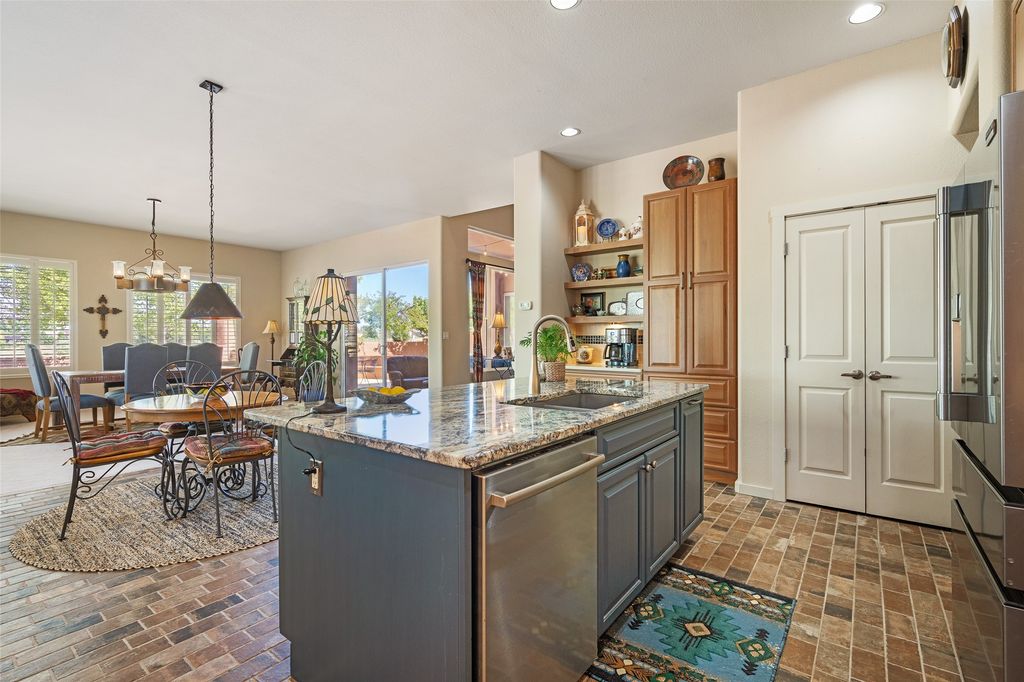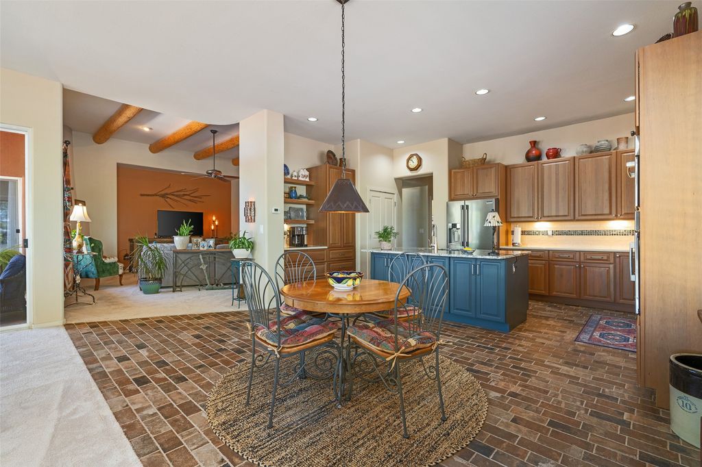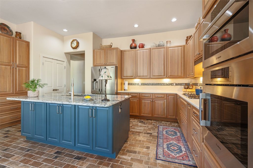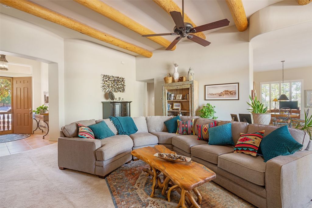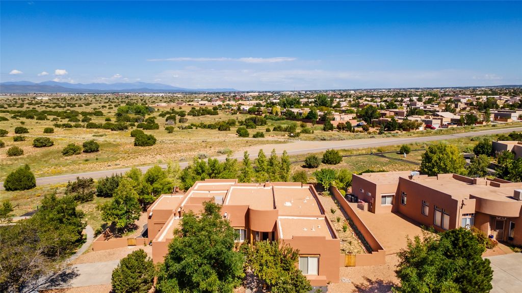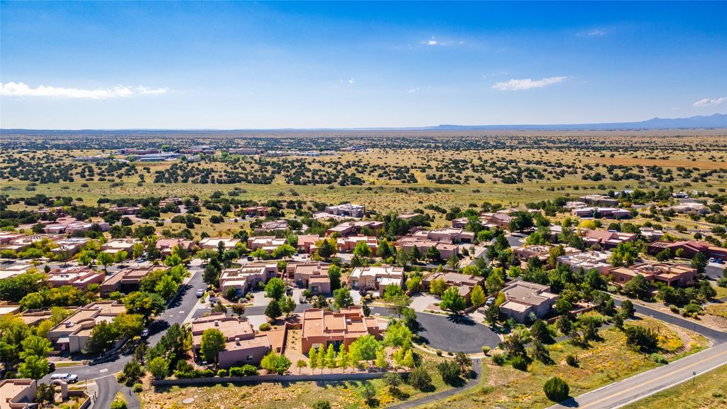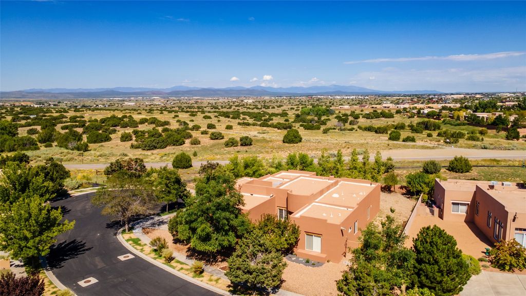 Welcome to this exceptional home, perfectly sited on a spacious lot at the end of a quiet cul-de-sac, with open space on two sides and gorgeous sunset views. Enjoy evenings by the outdoor fireplace as the sky puts on its nightly show. Thoughtfully updated by its current owners, this property offers tremendous value in today's market. With five full bedrooms, (two of which are currently used as an ensuite office and studio) and four full baths, the home provides remarkable flexibility for every lifestyle. The heart of the home is the magnificently remodeled chef's kitchen"”an absolute showstopper. Bosch appliances, beautiful two-tone cabinetry, subway tile with mosaic accents, hand-punched tin details, brick-set tile flooring, and a mix of granite and quartz countertops come together in a space any cook will adore. The dining room is inviting and generous, designed to host family gatherings and memorable evenings with friends. The living area offers vigas overhead, a wood-burning fireplace, and warm natural light"”a perfect space for cozy winter days. The primary suite is a private retreat: spacious, serene, and complete with a beautifully updated bath with customized walk-in shower, dual hammered nickel sinks and lighting, and an excellent walk-in closet. It's a haven for mornings that start slow and evenings that wind down in comfort. Additional upgrades made during this owner's tenure include a new boiler and evaporative cooler, new carpeting, fresh interior paint, new ceiling fans and custom lighting, plus plantation shutters throughout"”both beautiful and energy-efficient. Exterior wise, the stucco was also recently replaced and refreshed and the rear yard has been enhanced with new rock landscaping, pathways, and fruit trees, creating a peaceful outdoor escape. The slightly oversized garage is another welcome bonus with additional storage shelves. Located in the desirable Village at Rancho Viejo, this community offers miles of paved walking trails, multiple parks, sensible covenants, friendly neighbors, and convenient access to shopping and restaurants. Roughly 12 miles to the Santa Fe Plaza, this fantastic home delivers!