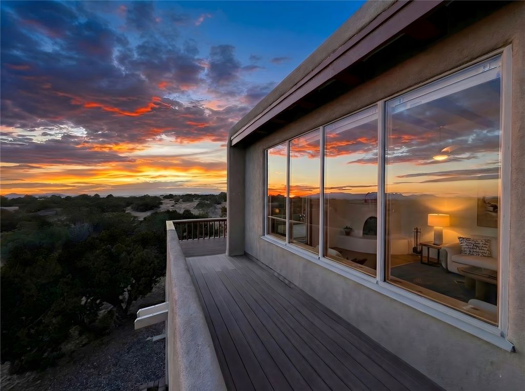 Privately located on a quiet cul-de-sac down a paved driveway, this wonderful passive-solar two-story home offers three bedrooms, 2½ baths, and abundant natural light. The upper level features a spacious open living area with wood ceiling beams, a new corner kiva fireplace, clean modern lines, and a beautifully updated design. The separate dining area and an breakfast nook create flexible living spaces. Sliding doors lead to a stunning Trex-style deck with a built-in banco"”perfect for enjoying the spectacular Jemez and Ortiz mountain views and western sunsets. The bedrooms are located downstairs, each with its own outdoor entrance and access to the covered patio and fully enclosed yard. The 2.24-acre lot provides generous outdoor space, including a new portal with latilla fencing surrounding the backyard. Additional features include mini-splits for efficient heating and cooling, an alarm system, and an attached 2-car garage. Hiking trails and the Rail Trail are just outside the backyard, and the home is conveniently located near all Eldorado amenities and the Eldorado Community School. Come take a look!