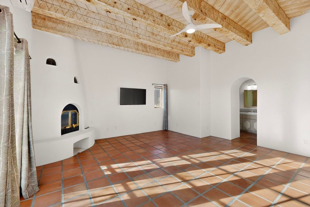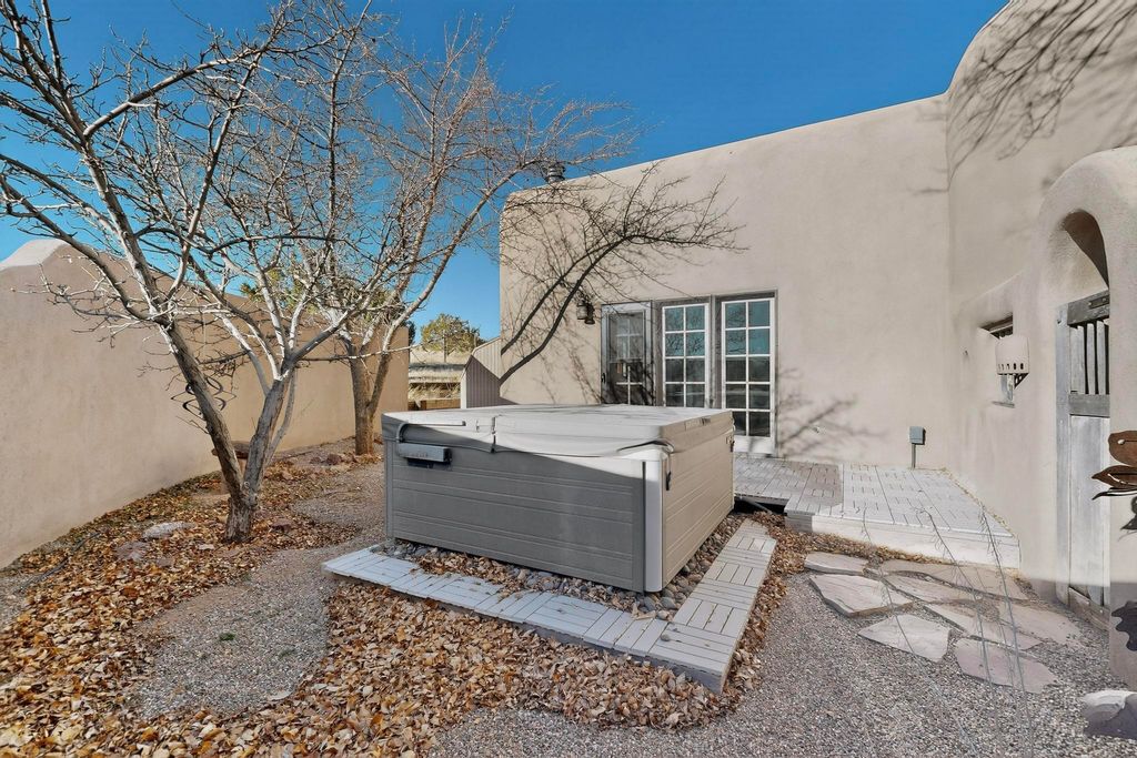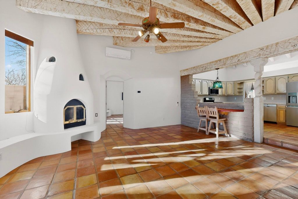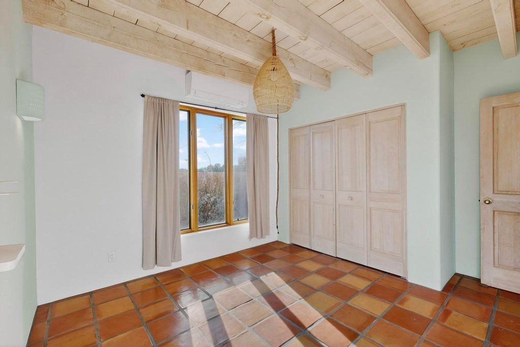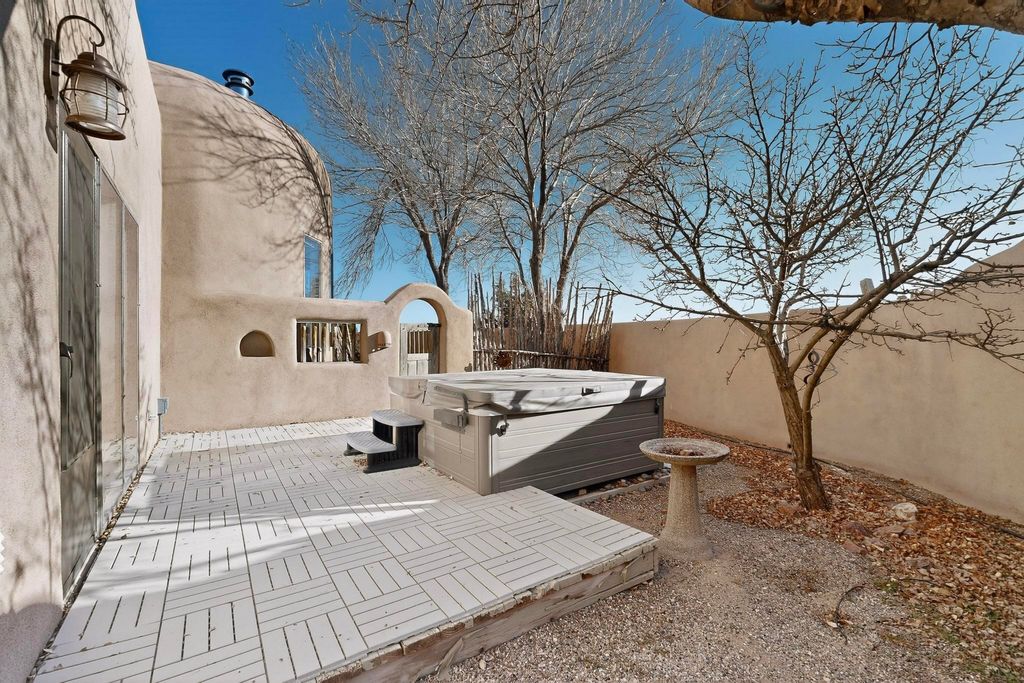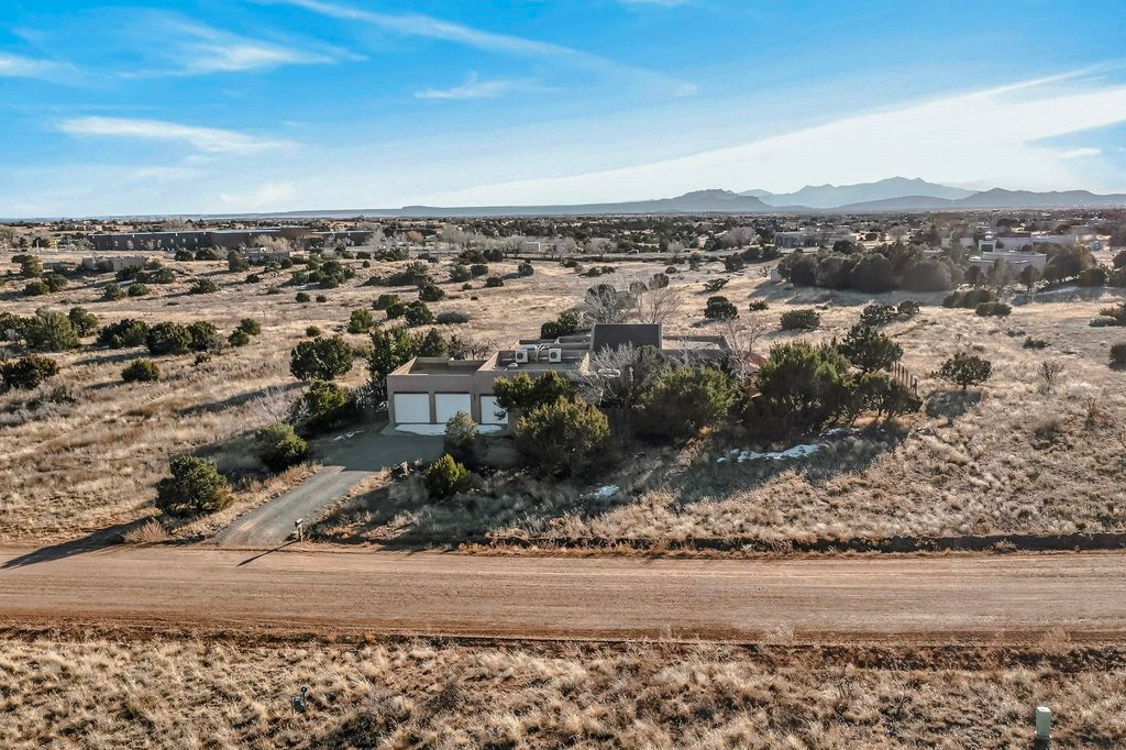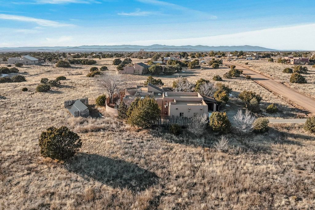 Priced to Sell! Custom designed and built for the first owner, this 4 bedroom 3 bath home is filled with eye catching hand carved details throughout. An excellent potential for multi family living with great separation of main bedroom and 2 guest wings. A sunny open plan concept with many extra rooms to expand your hobbies or private enjoyment areas. There is a new solar array, boiler, hot water heater and new above ground hot tub installed 2022/2023. New stucco, partial new roof and the 6 mini splits serviced in 2025. An oversized 2 car garage plus a studio bay with garage doors at both ends for easy access and plenty of guest parking. Two walled in private gardens for outside enjoyment accessed from north and south sides of the home. Ideally located bordering a large greenbelt, close to the community centre, hike bike trails, K-8 school, library, senior centre, 2 shopping plazas and only minutes into Santa Fe.