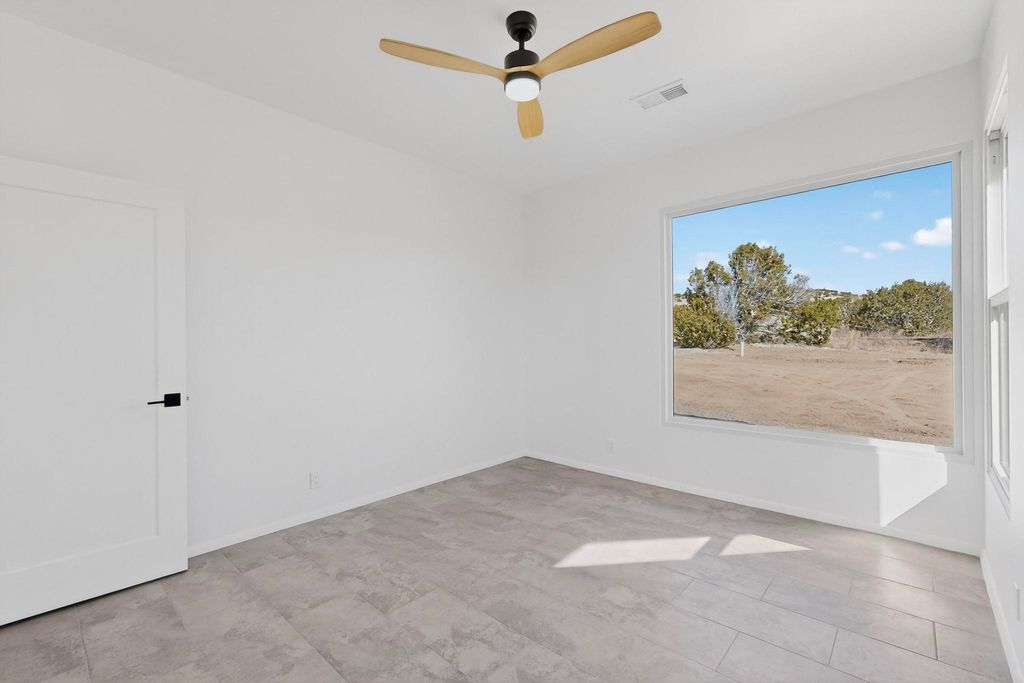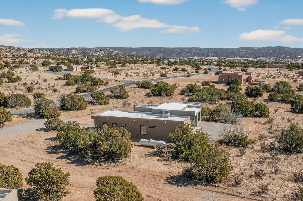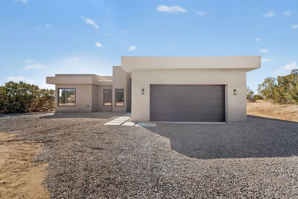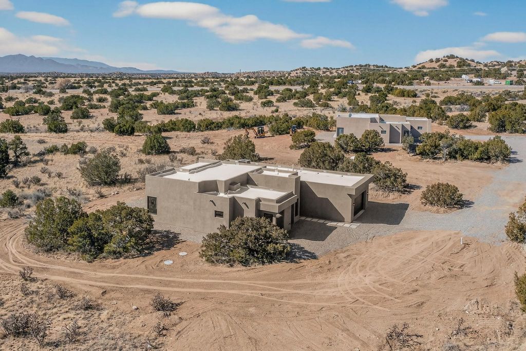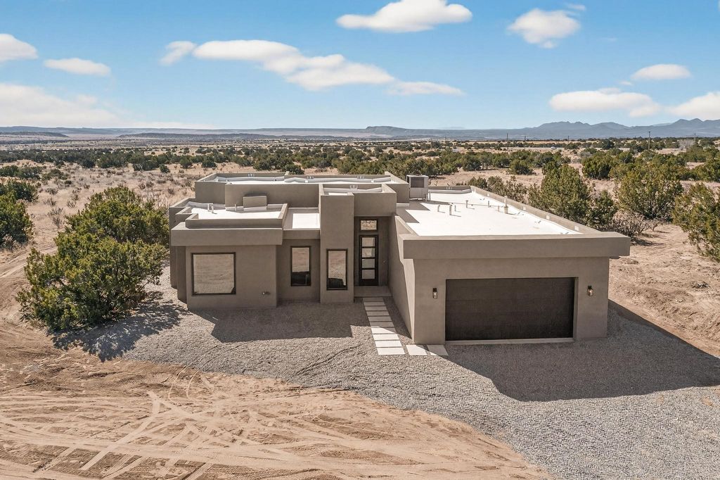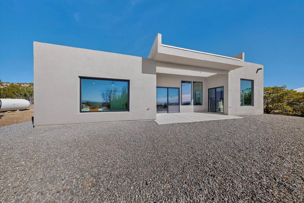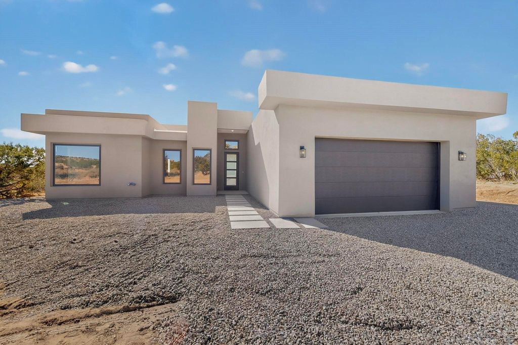 Welcome home! This stunning newly constructed contemporary-modern style home is perfectly positioned on 3.10 acres with stunning views of the Sandia Mountains and the Galisteo Basin. This 2,000 sq ft home has been designed to maximize the natural light and space, featuring high ceilings with contemporary style vigas, an open floor plan great for entertaining or keeping an eye on kids; with walls of windows taking full advantage of the expansive views!