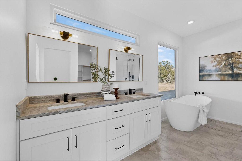 The primary suite offers a peaceful escape with a luxurious spa inspired stand-alone bathtub, dual vanities, walk-in-shower with dual rain heads, and a spacious walk-in closet.