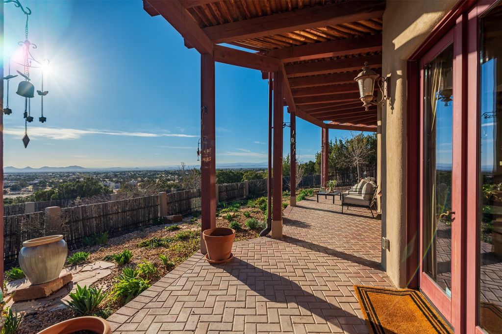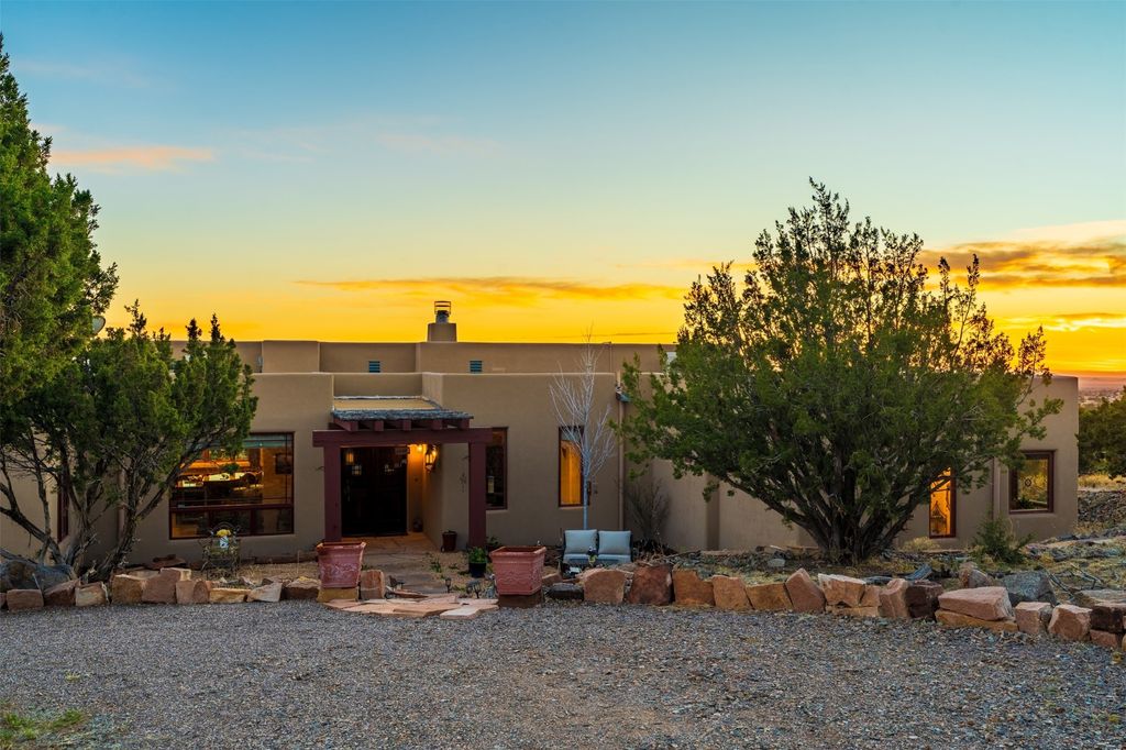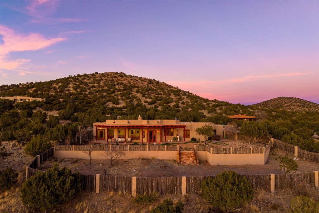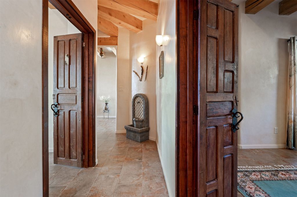 Immaculate and soulful, this single-level residence is beautifully finished with a timeless old-world aesthetic, offering a refined interpretation of Santa Fe living. Featuring 3 bedrooms and 3 baths (one full, one three-quarter, and one half), along with two versatile flex spaces, the home is set on a private and expansive 3.93-acre lot. Thoughtfully designed for both comfort and privacy, the well-conceived floor plan separates the guest suites and the primary suite into distinct wings. Tucked away on a quiet street in the coveted Los Griegos subdivision"”just 20 minutes from downtown Santa Fe"”this 2007 Archetypes Homescapes residence is perfectly sited to capture sweeping, unobstructed views. Inside, authentic craftsmanship and rich character define the interiors, with hand-troweled plaster walls, warm tile flooring, and striking wood-beamed ceilings throughout. Mesquite Mexican doors and custom cabinetry add depth and artistry. The open-concept living space is anchored by a dramatic fireplace, creating an inviting yet sophisticated focal point. The kitchen is both functional and elegant, featuring granite countertops, stainless steel appliances, and a wine refrigerator. The primary suite offers a serene, private retreat with a spacious walk-in closet and a spa-like bath complete with a deep soaking tub. Modern comforts are seamlessly integrated, including radiant floor heating and mini-split cooling systems for year-round climate control. Sustainability is enhanced by a 24-panel photovoltaic solar array and energy-efficient Rastra construction. Outdoors, an expansive wraparound rear portal invites relaxed living and unforgettable sunset views across the surrounding landscape. The fully coyote-fenced backyard provides both privacy and security, completing this exceptional offering that blends timeless elegance with the natural beauty of Northern New Mexico.