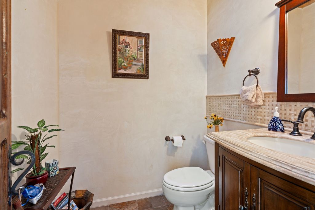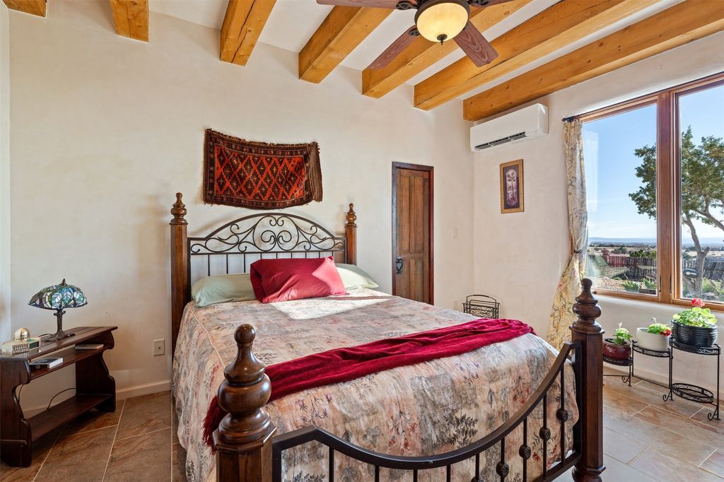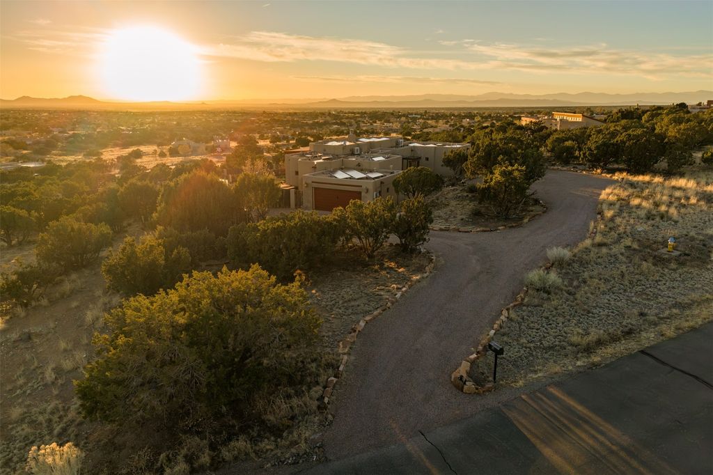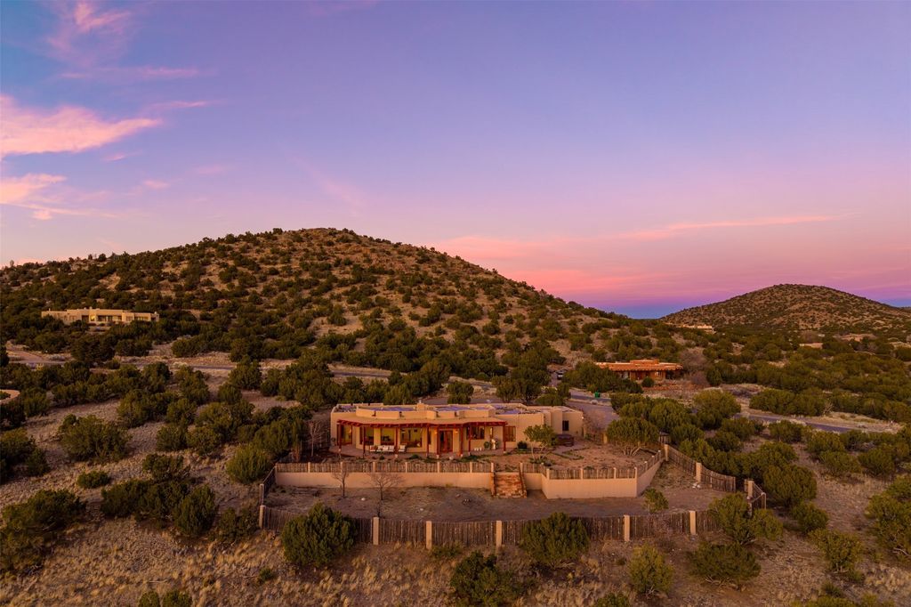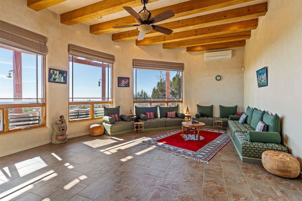 Immaculate and soulful, this single-level residence is beautifully finished with a timeless old-world aesthetic, offering a refined interpretation of Santa Fe living. Featuring 3 bedrooms and 3 baths (one full, one three-quarter, and one half), along with two versatile flex spaces, the home is set on a private and expansive 3.93-acre lot. Thoughtfully designed for both comfort and privacy, the well-conceived floor plan separates the guest suites and the primary suite into distinct wings. Tucked away on a quiet street in the coveted Los Griegos subdivision"”just 20 minutes from downtown Santa Fe"”this 2007 Archetypes Homescapes residence is perfectly sited to capture sweeping, unobstructed views. Inside, authentic craftsmanship and rich character define the interiors, with hand-troweled plaster walls, warm tile flooring, and striking wood-beamed ceilings throughout. Mesquite Mexican doors and custom cabinetry add depth and artistry. The open-concept living space is anchored by a dramatic fireplace, creating an inviting yet sophisticated focal point. The kitchen is both functional and elegant, featuring granite countertops, stainless steel appliances, and a wine refrigerator. The primary suite offers a serene, private retreat with a spacious walk-in closet and a spa-like bath complete with a deep soaking tub. Modern comforts are seamlessly integrated, including radiant floor heating and mini-split cooling systems for year-round climate control. Sustainability is enhanced by a 24-panel photovoltaic solar array and energy-efficient Rastra construction. Outdoors, an expansive wraparound rear portal invites relaxed living and unforgettable sunset views across the surrounding landscape. The fully coyote-fenced backyard provides both privacy and security, completing this exceptional offering that blends timeless elegance with the natural beauty of Northern New Mexico.