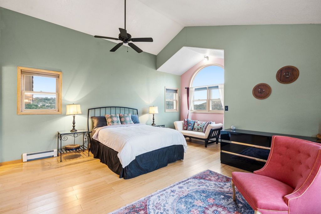 Set on more than five wooded acres just 20 minutes from the historic Santa Fe Plaza, this Spanish-style retreat offers rare privacy, expansive views, and the feeling of owning your own secluded oasis while remaining close to town. Elevated above the road and surrounded by native piñon, pine, and cedar, the property enjoys rolling terrain, endless skies, and sunsets that glow in gold and crimson before giving way to brilliant, star-filled nights. The setting is peaceful, immersive, and grounding. Inside, natural light pours through generous windows, illuminating soaring ceilings and open living spaces that feel both grand and inviting. Warm wood and tile flooring, iron accents, and timeless architectural details reflect authentic Spanish character. The beautifully refreshed kitchen anchors the home, offering generous space to gather, cook, and entertain with ease. Upstairs, spacious bedrooms provide comfort and privacy, including one with a balcony set among the trees. The primary suite serves as a private sanctuary with a deep soaking tub and oversized shower for a spa-inspired experience. A detached studio offers flexibility for guests, creative pursuits, or a home office. Outdoors, enjoy curated landscaping, a tranquil pond, covered patio with traditional horno, and fenced space for pets. Offering land, light, views, and proximity, this is Santa Fe living at its most serene, a rare opportunity to experience space, beauty, and quiet connection to nature just minutes from the Plaza.