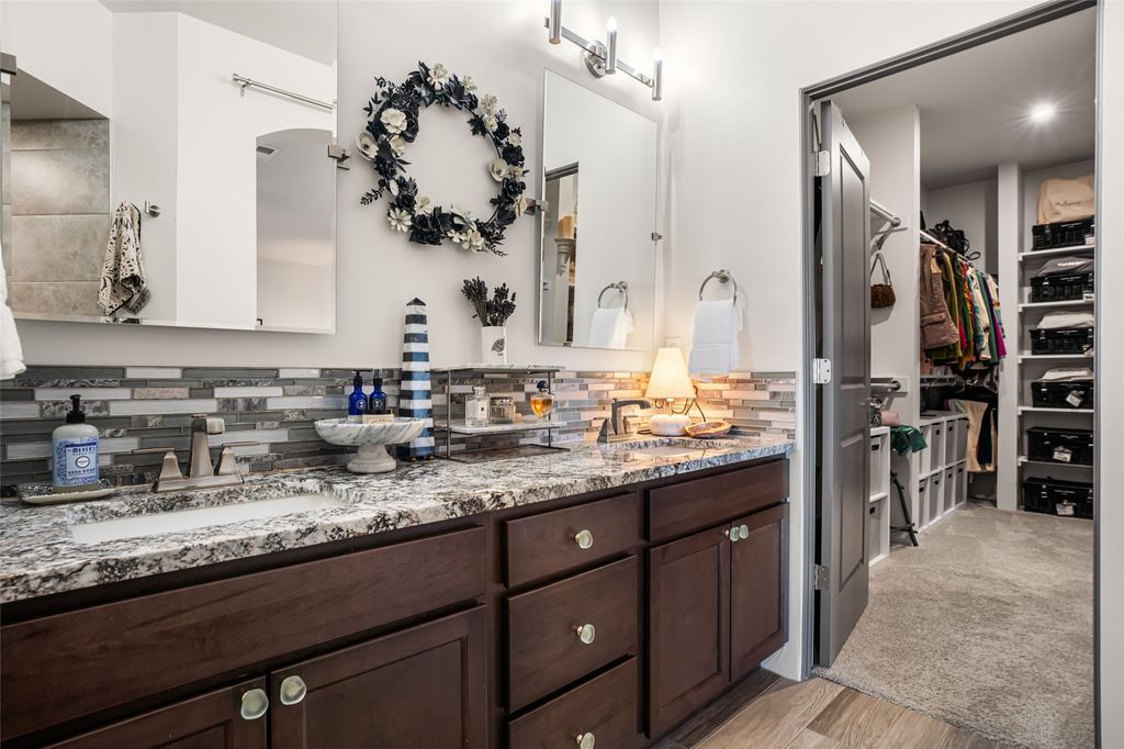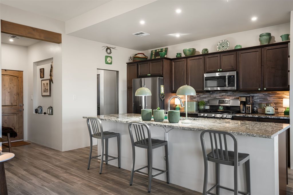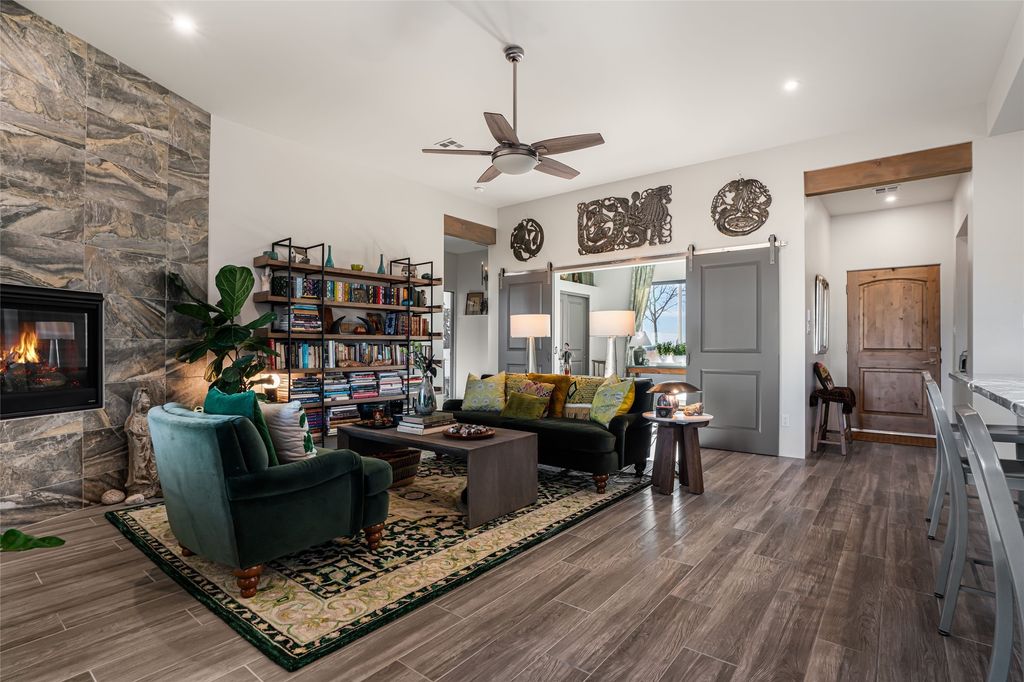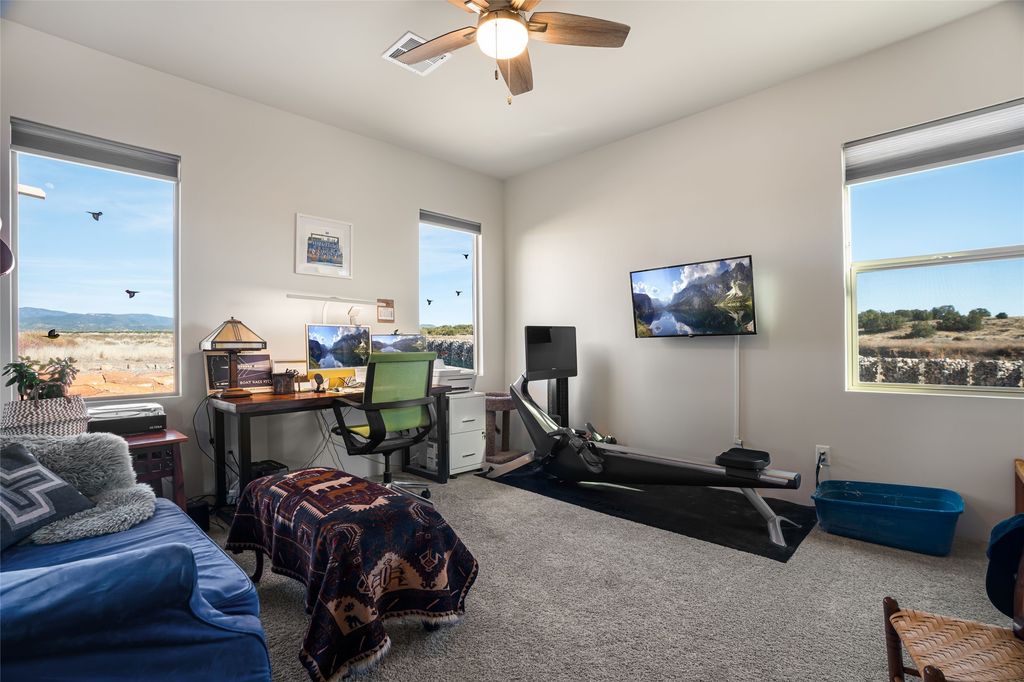 The laundry room offers good storage and leads directly into the two car garage. Excellent bedroom separation, the main bedroom is graciously sized, also looks out to the Sangres and has an enormous walk-in closet with plenty of hanging and shelving space. En suite bath with two sinks, granite counters and large walk-in shower. On the other side of the house, the second bedroom has more big mountain vistas, full guest bath adjacent and linen closet. The third bedroom's view is to the south with Sandia views and barn doors to close it off from the main living area, and makes a super media room, office or overflow guest room.