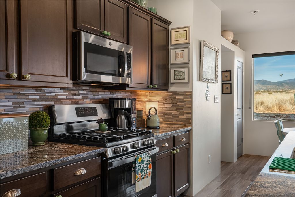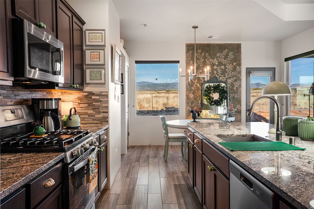 Located on one of the premier Oshara Village estate lots overlooking the green space to the South and the Sangre de Cristo Mountains to the East, this almost new 3 bedroom, 2 bath home was completed spring of 2022 and is a HERS-rated green home through energy efficiency including AC, healthy materials, durability and sustainability. With clean soft contemporary lines, the main living space is open and enjoys a kiva gas fireplace, high ceilings, fantastic light, mountain views and easy access to the outdoor covered portal from which to enjoy sunrises, sunset colors and moonrises over the Sangres. The kitchen has excellent storage in the solid wood cabinets, plenty of prep room on generous granite counters and upgraded stainless appliances, including gas stove and farm sink.