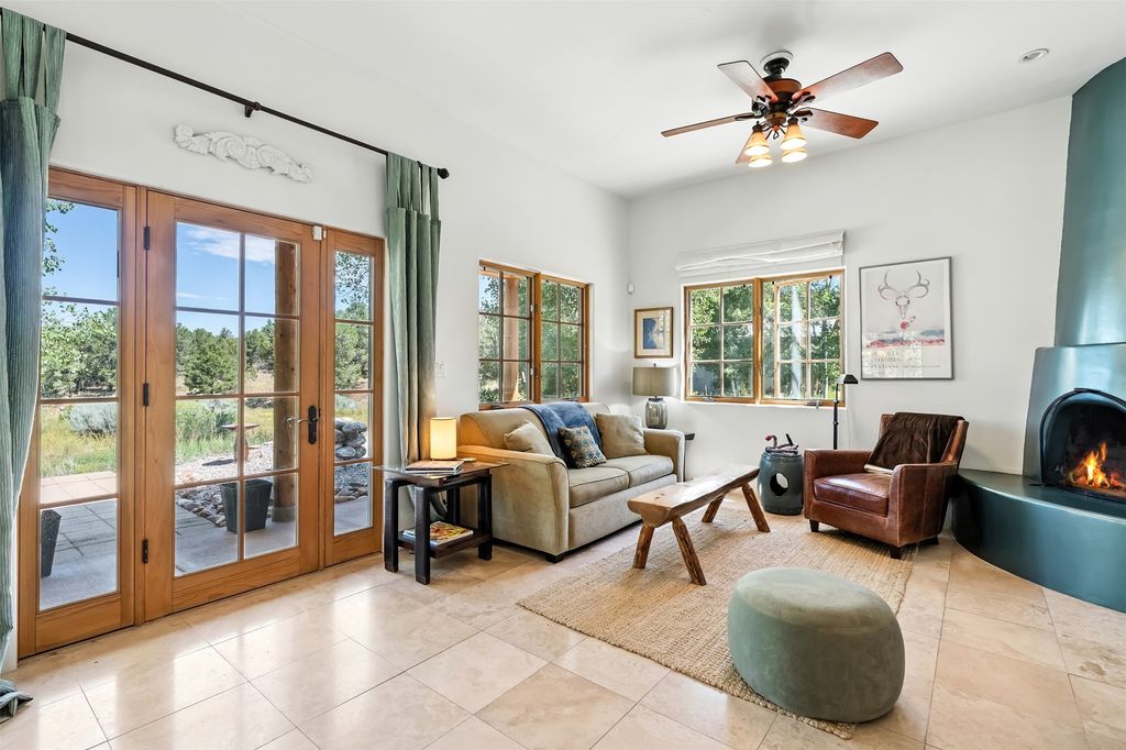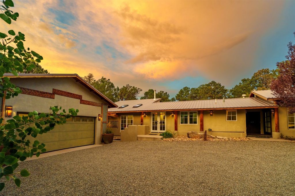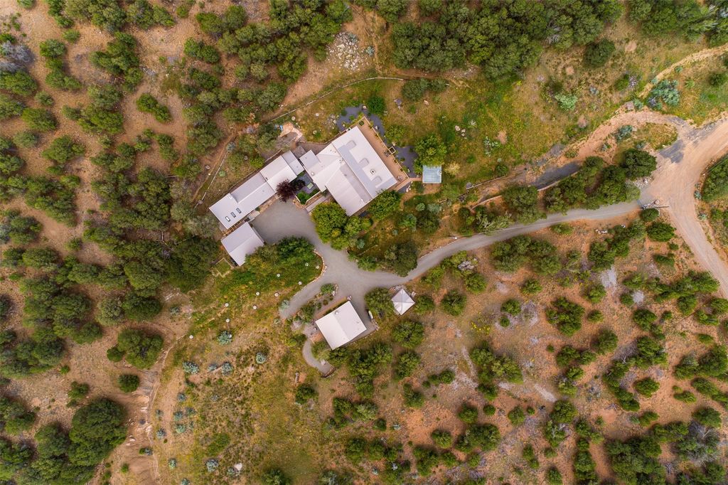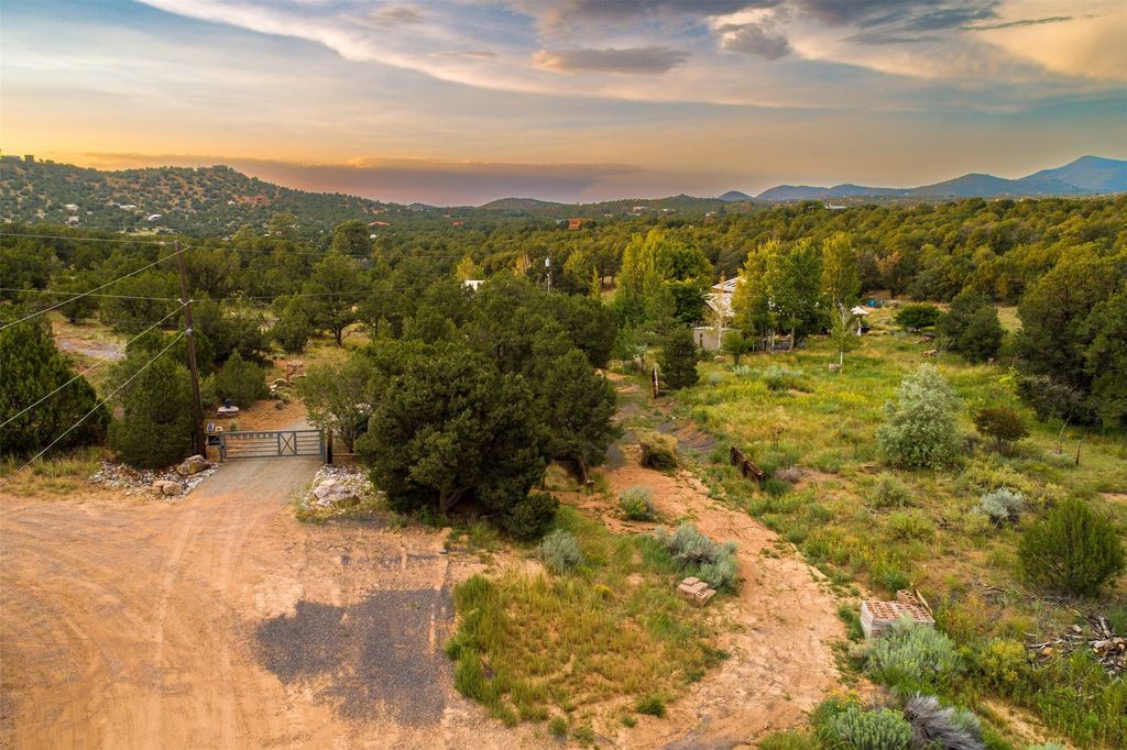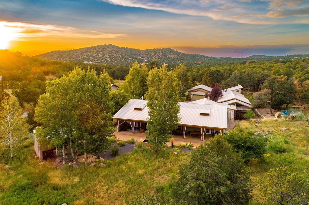 LIVE, WORK, ENTERTAIN, in your own secluded sanctuary located on 7.08 Sunlit Hills acres. 10 Sabina Lane is a sophisticated & contemporary COMPOUND offering a wide variety of living & working spaces in a stunning pastoral setting, 15 minutes from Santa Fe. MAIN HOUSE - 2,187sqft open concept Great Room w/beamed cathedral ceiling, fireplace, Chef's kitchen w/granite counters, high end appliances, 2 spacious bedrooms w/en suite bathrooms, laundry area, 5 sets of French door leading to 58 foot long covered portal. GUEST SUITE - 530sqft is steps from the main house & offers an inviting bedroom, spa inspired bathroom, custom tiles, soaking tub, is adjoined by a private tranquil terrace. STUDIO/OFFICE - 994sqft amazing work space with vaulted ceiling, view windows, areas for an office, art or other work related spaces, powder room & covered portal entry. One would never need to leave the property to conduct all their business or artistic work. CASITA - 683sqft Set apart from the main house, the casita has a full kitchen w/stone counters, kiva fireplace, covered portal, stackable washer/dryer. The casita has produced additional income as an Air B&B GARAGE - 60 sqft Fully finished, 2car capacity, storage areas. GAZEBO -196sqft An inviting space away from the home for meditation & relaxation. PAVILION -241sqft Wonderful retreat area w/fireplace, banco seating, ceiling fan, designer lighting. The property is accessed through a gated entry, a graveled driveway w/recently added retaining wall. Many additional aspects - electric convection stove top, extensive & significant landscaping,10 zone irrigation system,2 owned propane tanks (500 and 250 gallons), 5 fireplaces, an amazing flower filled meadow, healthy pinon, aspen and juniper trees, eclectic river rock pylons, antique wooden bathroom cabinet, a wealth of ceiling fans & mini split in the primary bedroom. For folks seeking a destination, full time live/work situation, please consider 10 Sabina Lane.