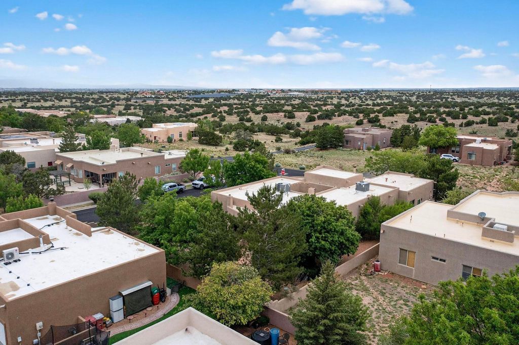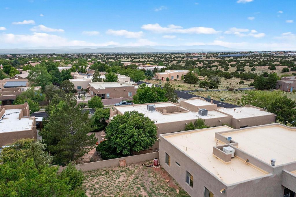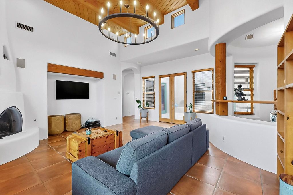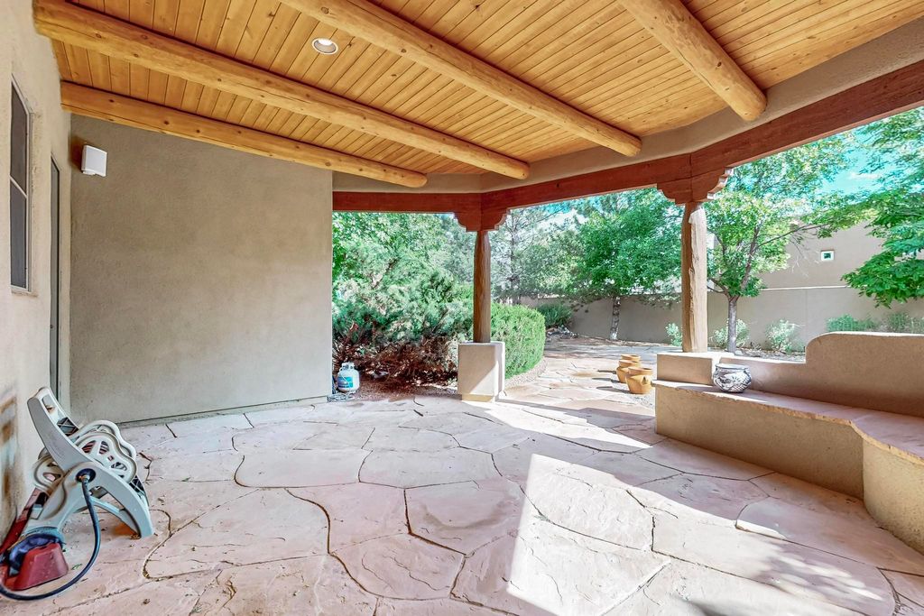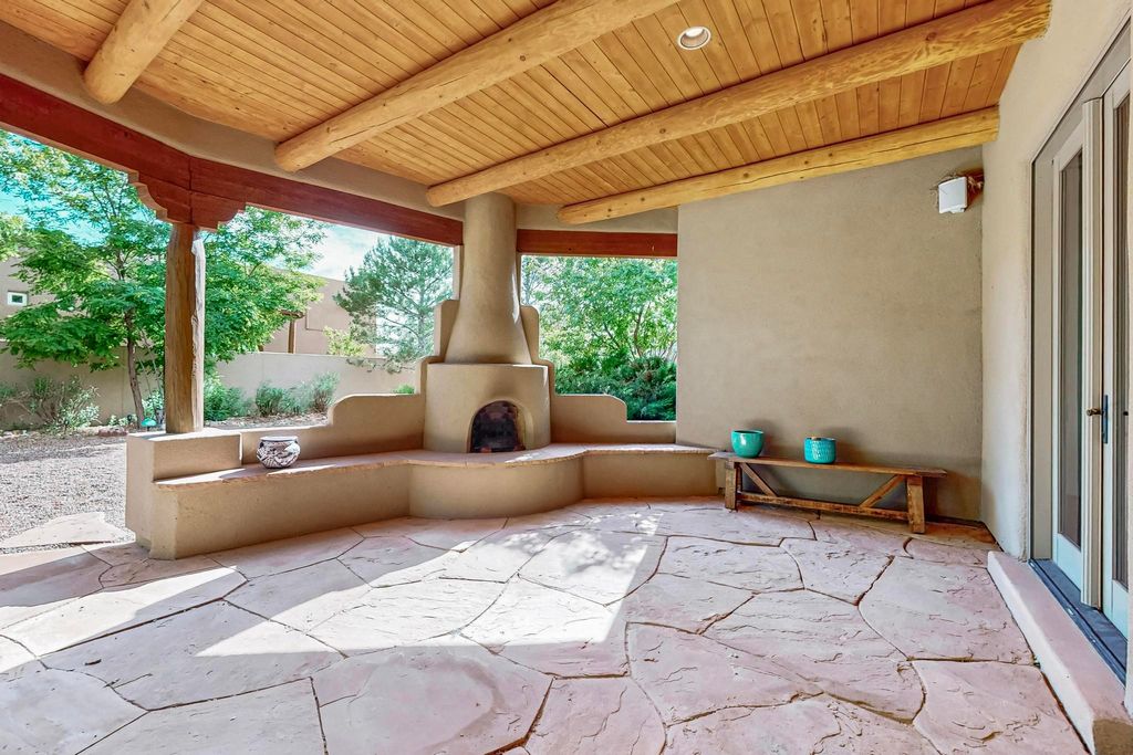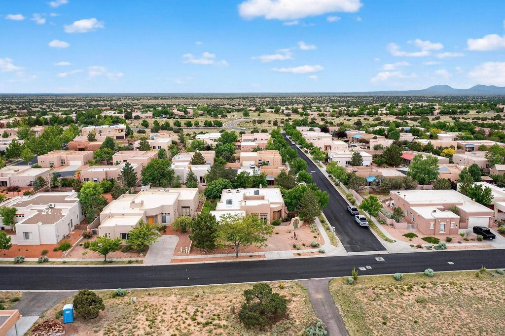 This stunning home in the highly desirable Rancho Viejo community is truly something special! Formerly a Parade of Homes model, this unique floor plan is one of only a few in the neighborhood. From the moment you walk in, you're welcomed by a warm foyer with carved vigas that opens into a breathtaking living space. Soaring 14-foot tongue-and-groove ceilings, exposed beams, a built-in bookcase, and a classic kiva fireplace create an inviting atmosphere filled with natural light from expansive windows. The entire interior was freshly painted in 2023, giving the home a clean, updated feel. The chef's kitchen is as functional as it is beautiful, featuring high-end appliances, dual convection ovens, and easy access to outdoor living spaces"”perfect for entertaining. At the center of the home, you'll find a peaceful flagstone patio with its own kiva fireplace, accessible from four different doors. It's the perfect setup for gatherings, relaxing evenings, or simply enjoying the New Mexico sunshine. Comfort and efficiency shine here, too. Two zoned combo heating and cooling systems (installed in 2023), smart thermostats, and radiant heated floors throughout the entire home ensure year-round comfort. You'll also love the whole-house built-in audio system, Tesla charging station, and custom solid wood doors that add warmth and authenticity to every space. The exterior stucco was replaced in 2021, bedroom flooring has been recently upgraded, and the home features a built-in rainwater collection system with an underground cistern, water pump, and spout"”thoughtfully designed for sustainability. A private office tucked away near the primary suite offers built-in cabinetry and shelving, making it ideal for remote work or creative projects. And don't miss the rear patio"”complete with a kiva fireplace, gas line ready for your grill, and beautiful viga-accented tongue-and-groove ceilings"”extending the home's Southwestern charm outdoors.