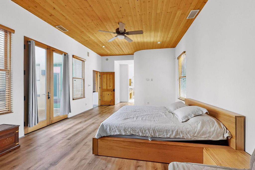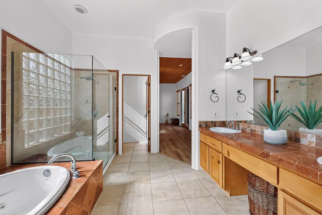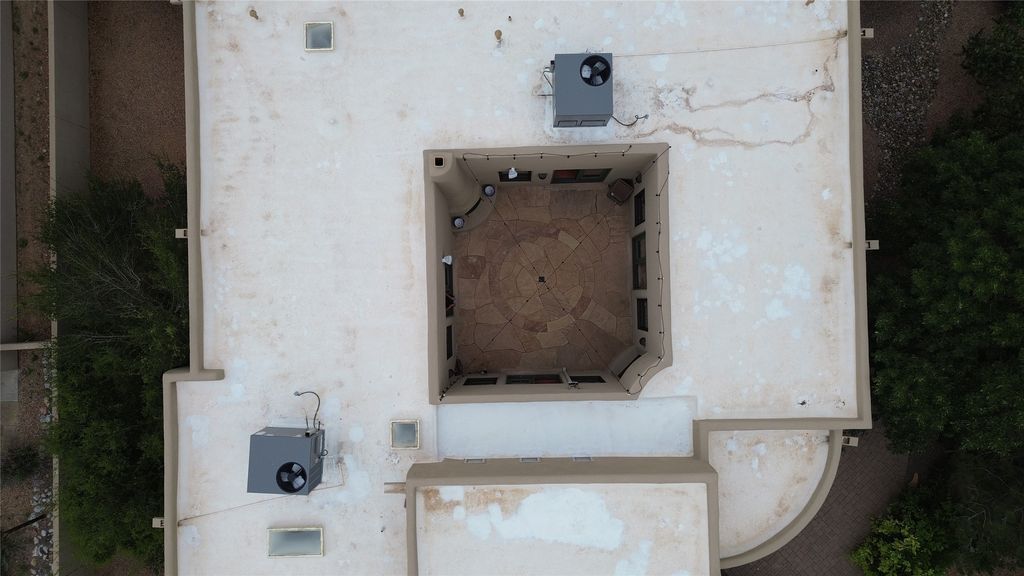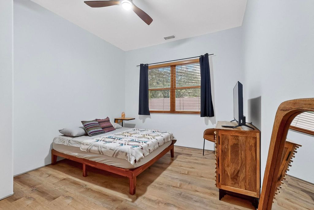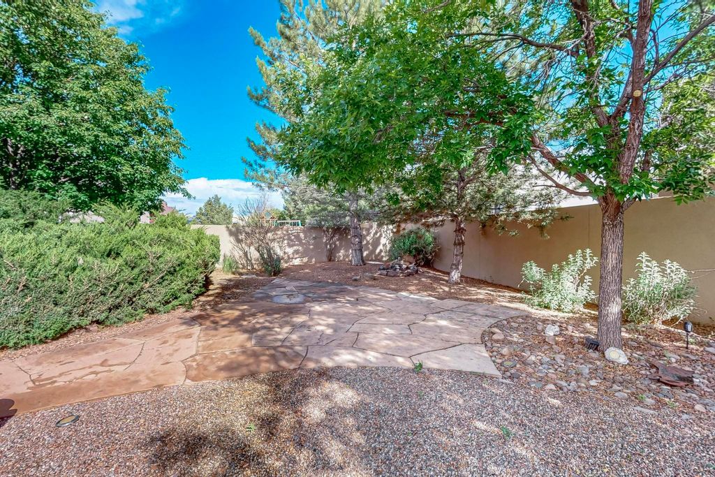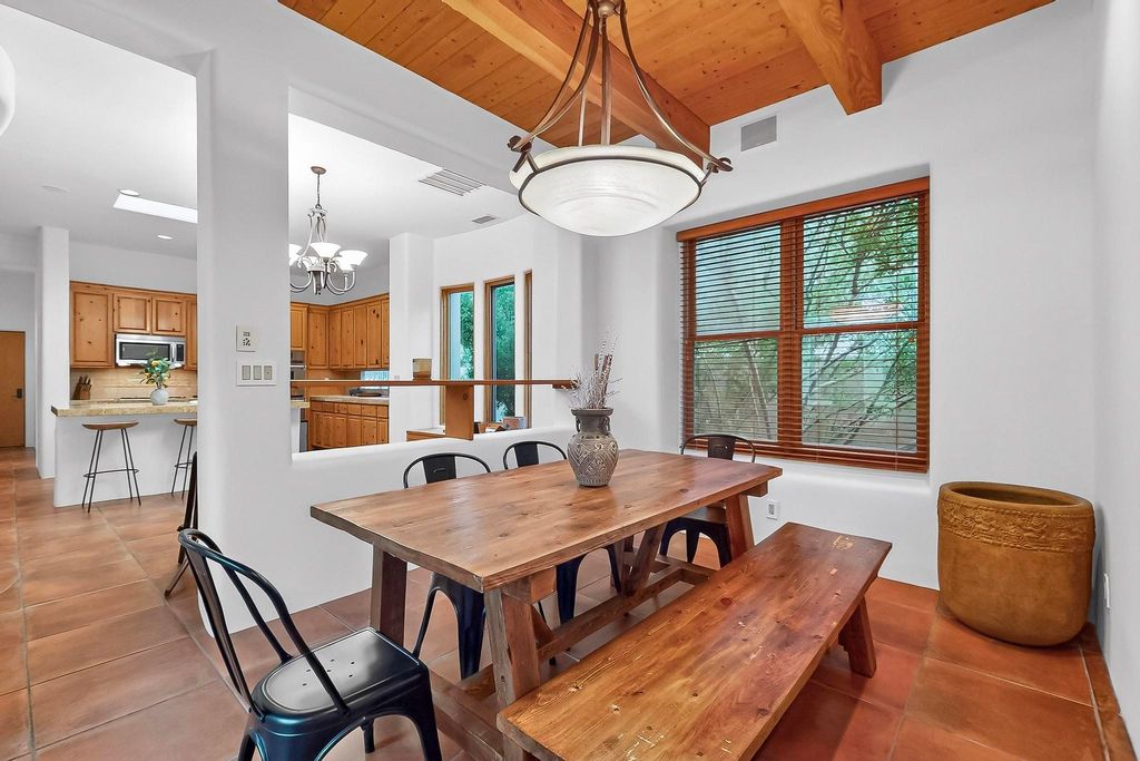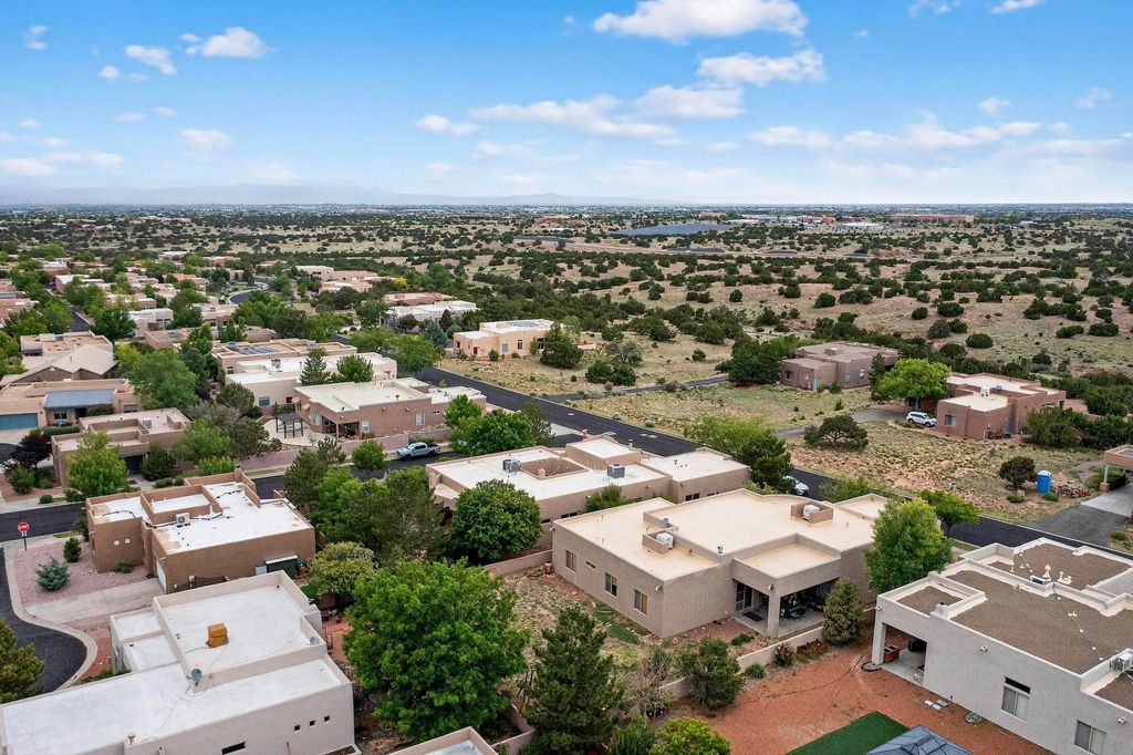 This stunning home in the highly desirable Rancho Viejo community is truly something special! Formerly a Parade of Homes model, this unique floor plan is one of only a few in the neighborhood. From the moment you walk in, you're welcomed by a warm foyer with carved vigas that opens into a breathtaking living space. Soaring 14-foot tongue-and-groove ceilings, exposed beams, a built-in bookcase, and a classic kiva fireplace create an inviting atmosphere filled with natural light from expansive windows. The entire interior was freshly painted in 2023, giving the home a clean, updated feel. The chef's kitchen is as functional as it is beautiful, featuring high-end appliances, dual convection ovens, and easy access to outdoor living spaces"”perfect for entertaining. At the center of the home, you'll find a peaceful flagstone patio with its own kiva fireplace, accessible from four different doors. It's the perfect setup for gatherings, relaxing evenings, or simply enjoying the New Mexico sunshine. Comfort and efficiency shine here, too. Two zoned combo heating and cooling systems (installed in 2023), smart thermostats, and radiant heated floors throughout the entire home ensure year-round comfort. You'll also love the whole-house built-in audio system, Tesla charging station, and custom solid wood doors that add warmth and authenticity to every space. The exterior stucco was replaced in 2021, bedroom flooring has been recently upgraded, and the home features a built-in rainwater collection system with an underground cistern, water pump, and spout"”thoughtfully designed for sustainability. A private office tucked away near the primary suite offers built-in cabinetry and shelving, making it ideal for remote work or creative projects. And don't miss the rear patio"”complete with a kiva fireplace, gas line ready for your grill, and beautiful viga-accented tongue-and-groove ceilings"”extending the home's Southwestern charm outdoors.