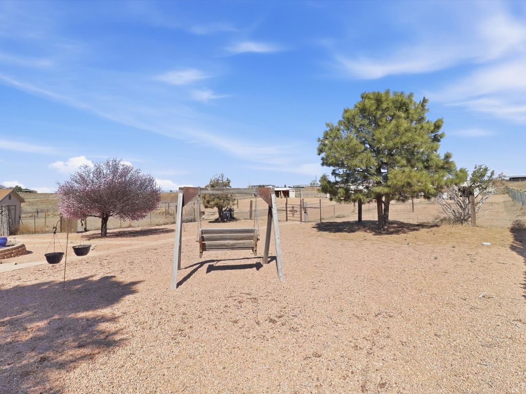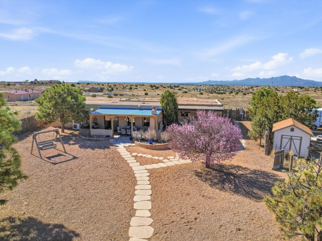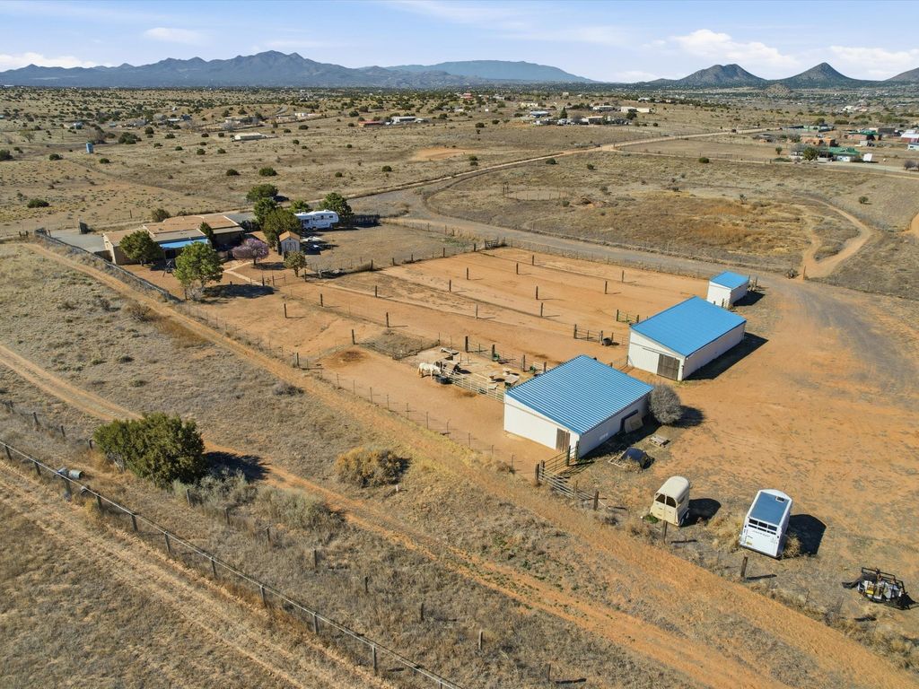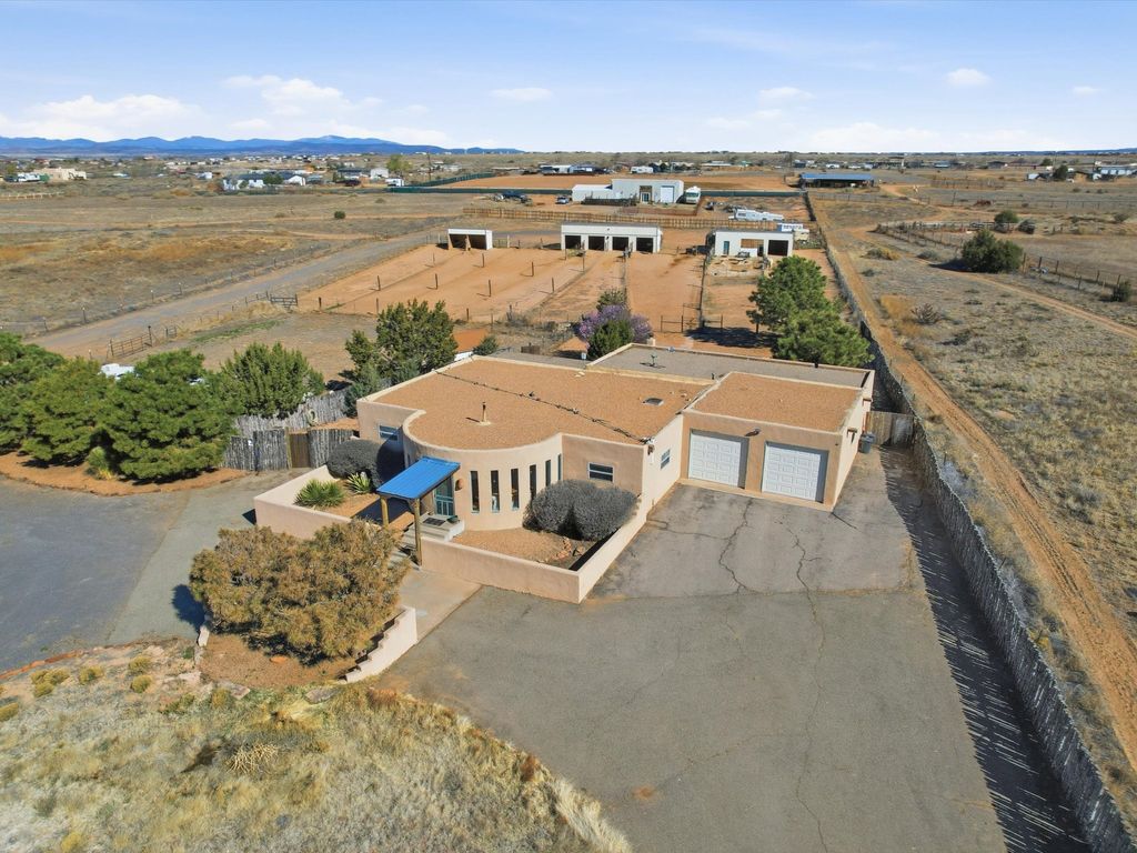 Set on 5.19 fully fenced acres just minutes outside Santa Fe, this Southwestern ranch retreat offers breathtaking sunrises, sunsets, and equally impressive dark night skies. The 4-bedroom, 2-bath single-level home features a light-filled open floor plan, tile and wood flooring, and expansive windows that showcase the surrounding mountain views. The circular Kiva-style living room, with twelve floor-to-ceiling windows, invites natural sunlight and the beauty of Santa Fe inside, while the spacious living area and two master suites provide comfort, privacy, and abundant closet space. Three additional rooms can serve as bedrooms, allowing for a total of five. Two outdoor patios"”one with a tranquil water feature and one with a kiva fireplace"”offer peaceful escapes year-round, where you can enjoy the many hummingbirds or watch a family of 16 ravens keep the barn animals company. The home seamlessly blends indoor and outdoor living, with large sliding windows in the main living areas letting in fresh mountain breezes. Equestrian enthusiasts will appreciate the three barns (one with a separate tack room), each with water and electricity, capable of hosting up to 12 horses, offering strong income potential from boarding. The nearly 4-acre fully fenced field provides a safe pasture for turnout and includes a 60' round pen for training. Recent updates include an attached insulated two-car garage with shop sink and ample storage, along with covered portals and patios designed for outdoor entertaining and relaxation. With no HOA restrictions, this property provides flexibility for horse lovers, hobbyists, and families seeking a peaceful retreat. Just minutes from Santa Fe's shopping, dining, and amenities, this well-maintained home is a bright, spacious ranch haven that captures the quintessential Santa Fe lifestyle"”mountain views, abundant wildlife, and serene open spaces.
