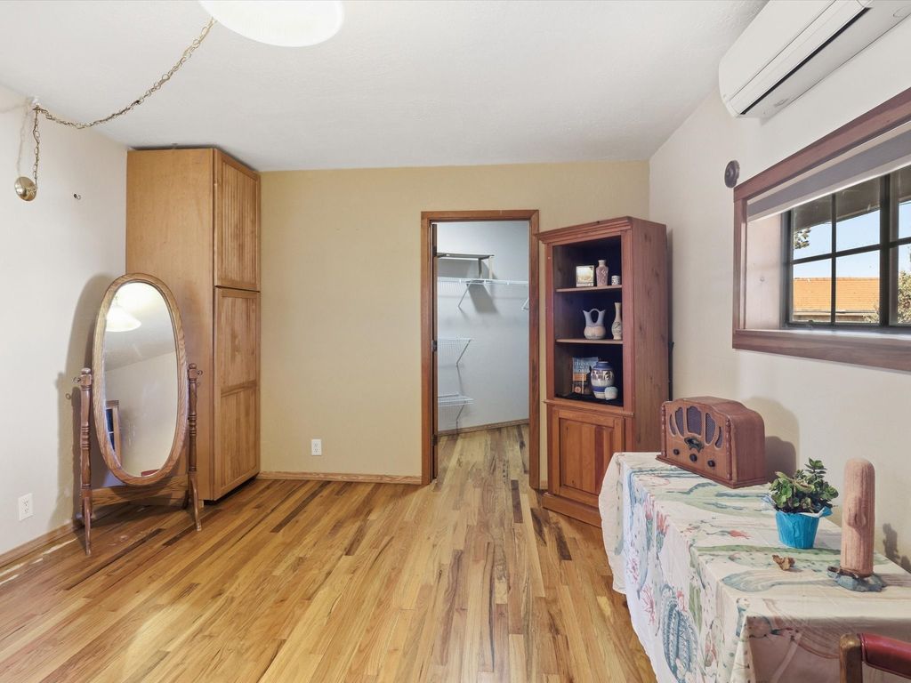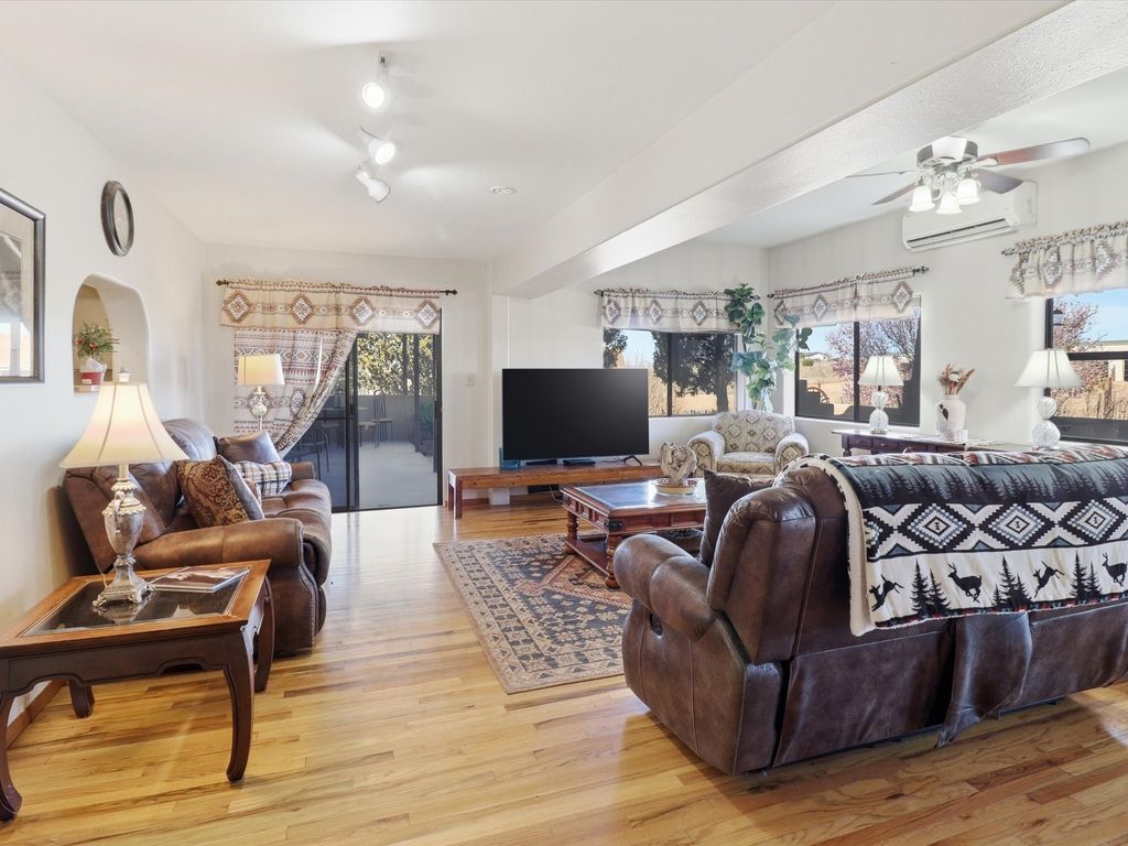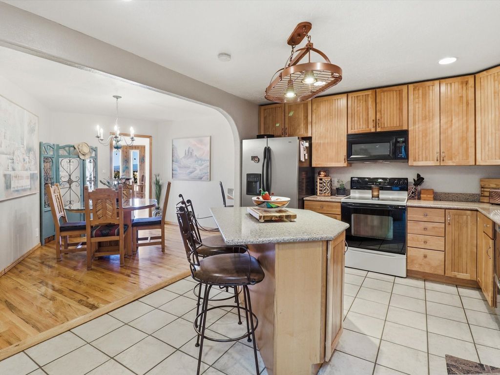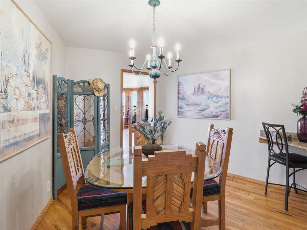 Set on 5.19 fully fenced acres just minutes outside Santa Fe, this Southwestern ranch retreat offers breathtaking sunrises, sunsets, and equally impressive dark night skies. The 4-bedroom, 2-bath single-level home features a light-filled open floor plan, tile and wood flooring, and expansive windows that showcase the surrounding mountain views. The circular Kiva-style living room, with twelve floor-to-ceiling windows, invites natural sunlight and the beauty of Santa Fe inside, while the spacious living area and two master suites provide comfort, privacy, and abundant closet space. Three additional rooms can serve as bedrooms, allowing for a total of five. Two outdoor patios"”one with a tranquil water feature and one with a kiva fireplace"”offer peaceful escapes year-round, where you can enjoy the many hummingbirds or watch a family of 16 ravens keep the barn animals company. The home seamlessly blends indoor and outdoor living, with large sliding windows in the main living areas letting in fresh mountain breezes. Equestrian enthusiasts will appreciate the three barns (one with a separate tack room), each with water and electricity, capable of hosting up to 12 horses, offering strong income potential from boarding. The nearly 4-acre fully fenced field provides a safe pasture for turnout and includes a 60' round pen for training. Recent updates include an attached insulated two-car garage with shop sink and ample storage, along with covered portals and patios designed for outdoor entertaining and relaxation. With no HOA restrictions, this property provides flexibility for horse lovers, hobbyists, and families seeking a peaceful retreat. Just minutes from Santa Fe's shopping, dining, and amenities, this well-maintained home is a bright, spacious ranch haven that captures the quintessential Santa Fe lifestyle"”mountain views, abundant wildlife, and serene open spaces.