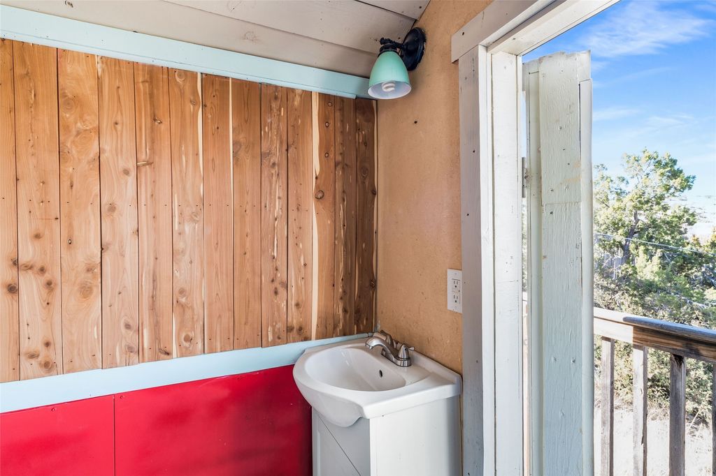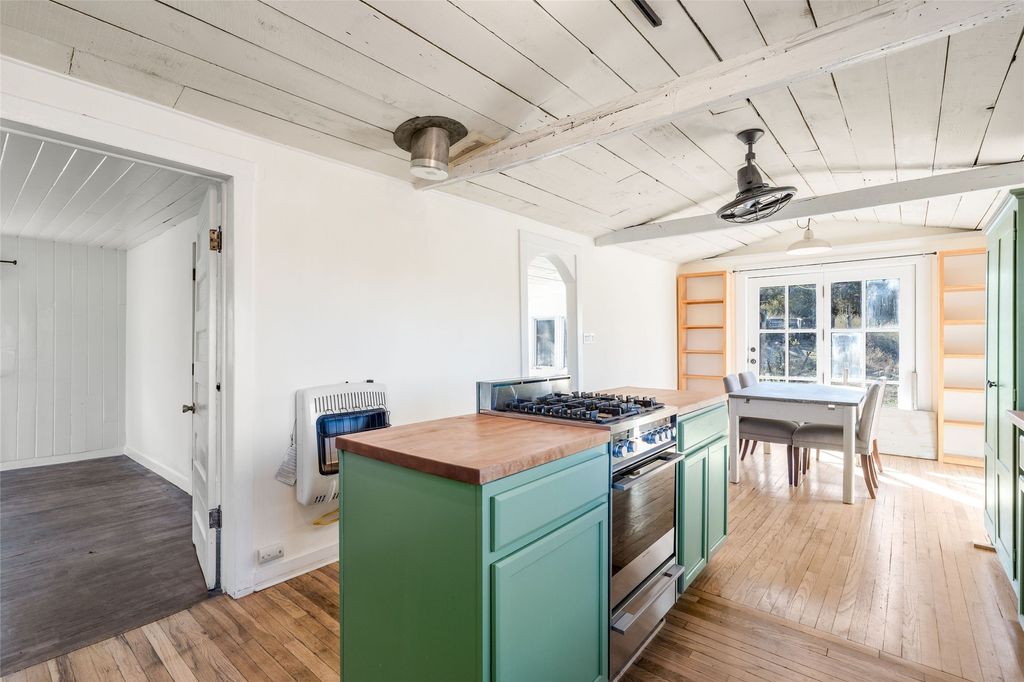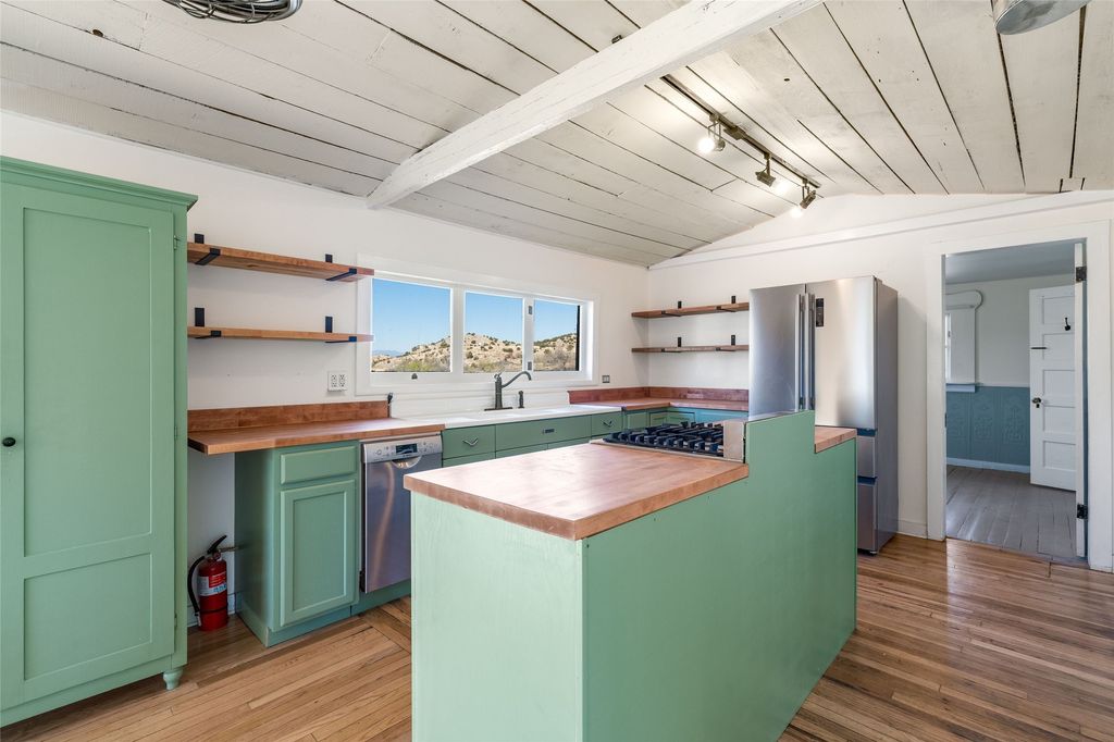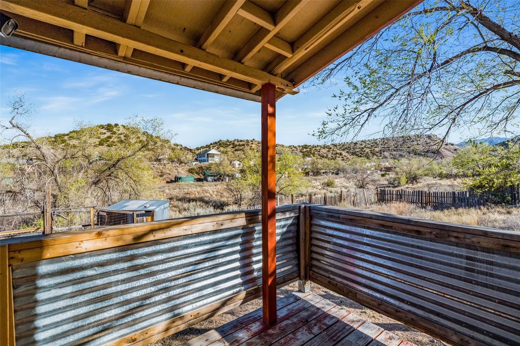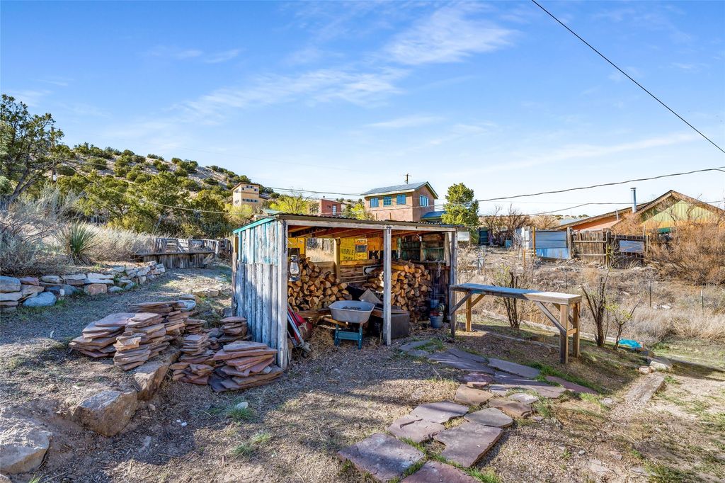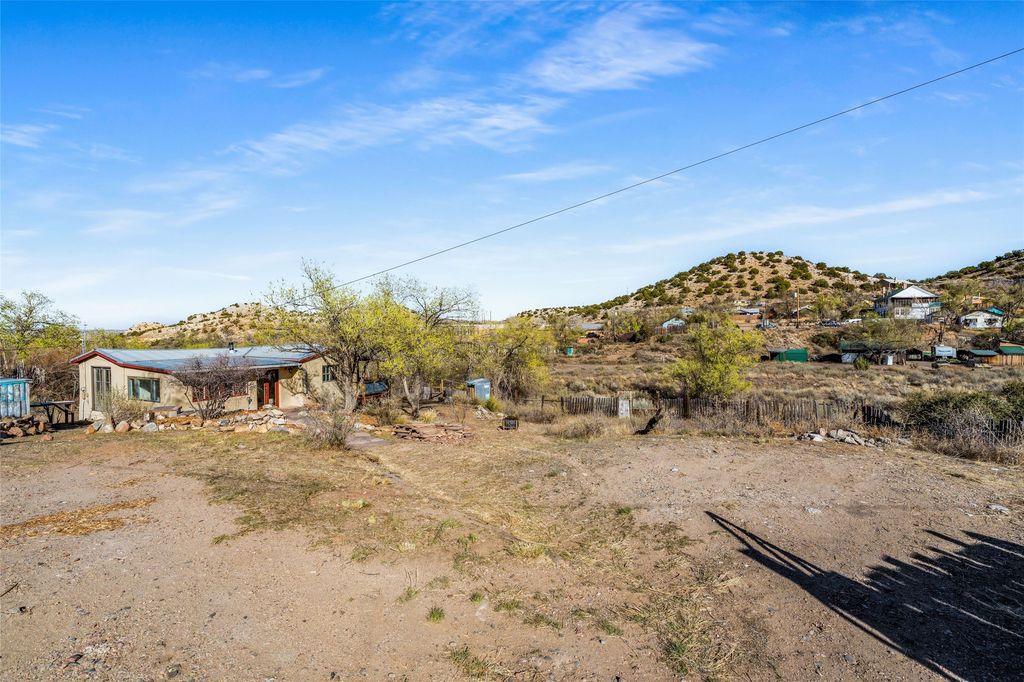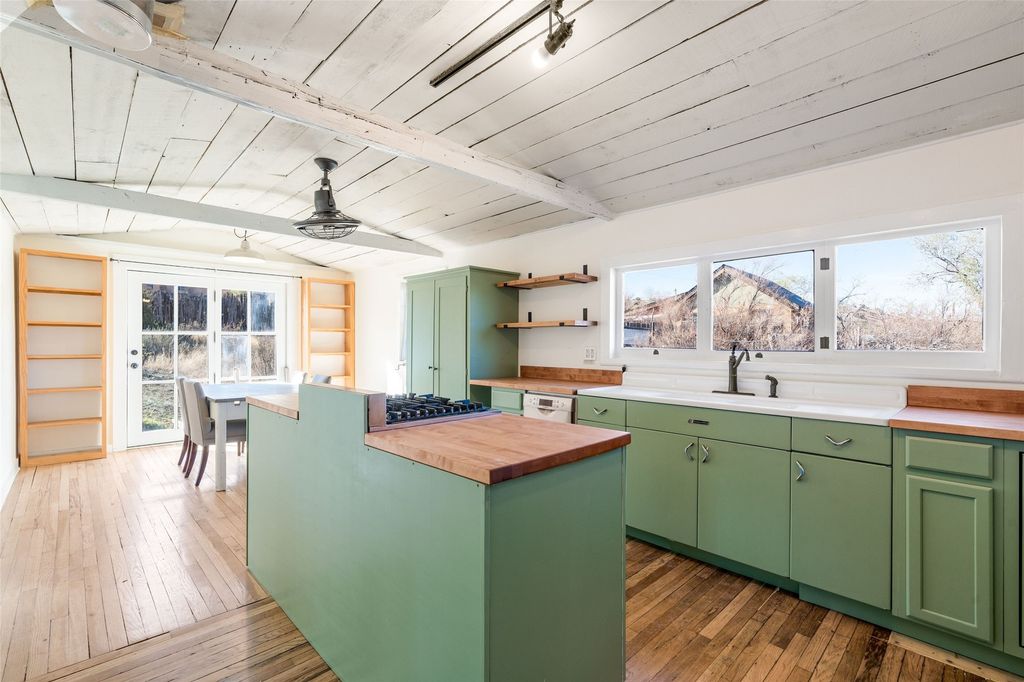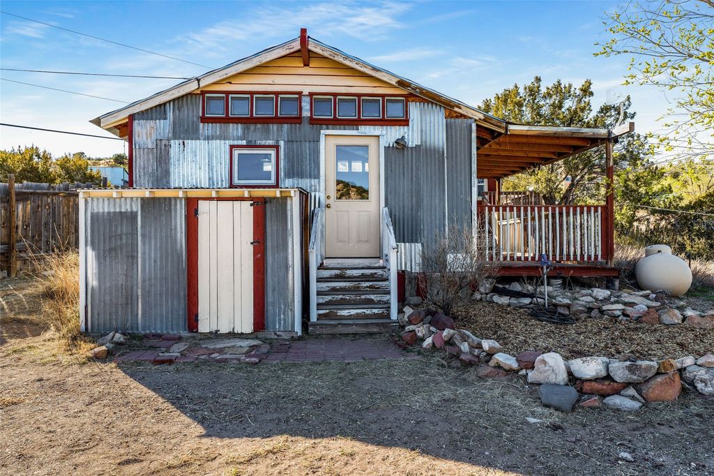 Nestled on an oversized lot bordering the town greenbelt, this beautifully updated Madrid cabin blends historic character with thoughtful modern enhancements. The expanded country kitchen is a true centerpiece, featuring open shelving, butcher-block counters, and a generous center island ideal for gourmet cooking and entertaining. The updated bathroom offers a luxurious soaking tub, and much of the home's original hardwood flooring has been lovingly preserved. A heated sunroom provides a bright, welcoming living space, while one of the bedrooms showcases classic English wainscoting that adds to the home's timeless charm. The main bedroom opens onto a private porch overlooking the greenbelt"”an ideal spot for morning coffee or evening relaxation. The property also includes a versatile detached studio complete with a sink, woodstove, private porch, and an additional bathroom ready for activation. Perfect for artists, guests, or a home office. Outside, enjoy views of the Sangre de Cristo Mountains from the landscaped yard, with direct access to the greenbelt leading to a 40-acre county open space"”perfect for hiking and exploring. Residents of Madrid also share ownership of the historic Madrid Ballpark, the first lighted ballpark in North America and still a vibrant hub for community events and tournaments. Located within easy walking distance of Madrid's general store, restaurants, coffee shop, and galleries, this home offers a rare blend of privacy, character, and walkable village living. Convenient access to both Albuquerque and Santa Fe completes the package, making this a truly special opportunity in the heart of Madrid.