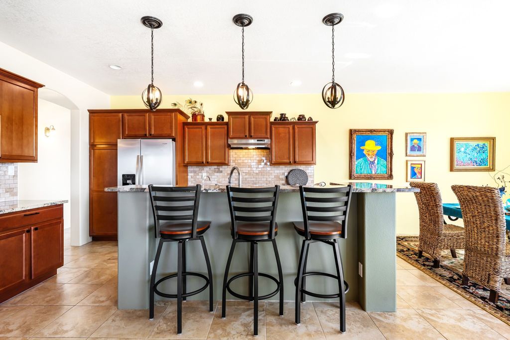 A JEWEL IN LA PRADERA! The rare Spanish Broom floorplan - only four in the neighborhood according to seller - features a curved wall of picture windows to capture the amazing views. NEW ROOF AND STUCCO IN 2024. This one-owner home is single-level, located on a cul-de-sac and has an ideal floorplan with good bedroom separation and an open feel. Kitchen has pretty cabinetry, granite counters and stainless appliances, island sink and room for barstools. Reverse osmosis at kitchen sink. Walk out to one of the most gorgeous backyards and portal in La Pradera. Recent 50K in improvements - it is like being at a luxury resort. Flagstone patio and natural gas firepit. Forced air heating and air conditioning. Primary bedroom has door to rear portal, walk-in closet, soaking tub and separate shower, double sinks and granite counters. Two guest rooms have access to a full guest bathroom, also with granite counters. Finished 2-car garage. Proper laundry room with storage - washer and dryer convey with the property. Water heater and HVAC system are 2018. Third bedroom could be office. Some furnishings are available - list in supplements.