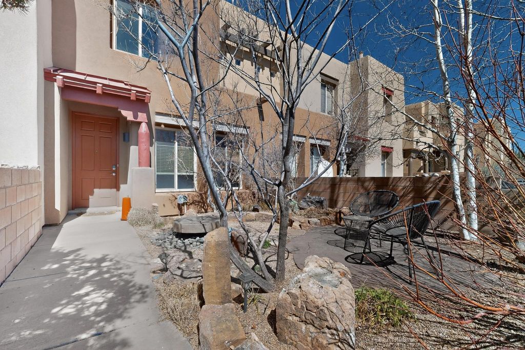 Located on a quiet, tree-lined street, across from a park, this home is perfect as a primary residence or lock & leave second home, offering comfort and convenience for a variety of lifestyles. A beautifully landscaped entry courtyard welcomes you with a charming fountain, creating an inviting and serene entrance. The open living room and dining area feature a beamed ceiling and a cozy fireplace, providing a warm and inviting space for gatherings and everyday living. The kitchen is equipped with granite countertops, stainless steel appliances, and a pantry, offering both style and functionality for all your culinary needs. Upstairs, both the primary and secondary bedrooms feature ensuite bathrooms and walk-in closets, ensuring comfort and privacy. The primary suite also includes a door leading directly to the deck offering stunning mountain views. Between the bedrooms, an office nook offers a space for work or study. A half bath and laundry room are conveniently located on the main floor. Residents have easy access to hiking and biking trails and open space, encouraging an active and outdoor lifestyle in this beautiful and vibrant community.