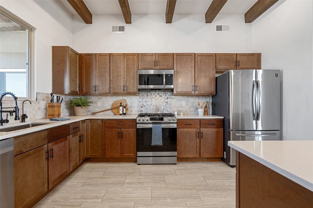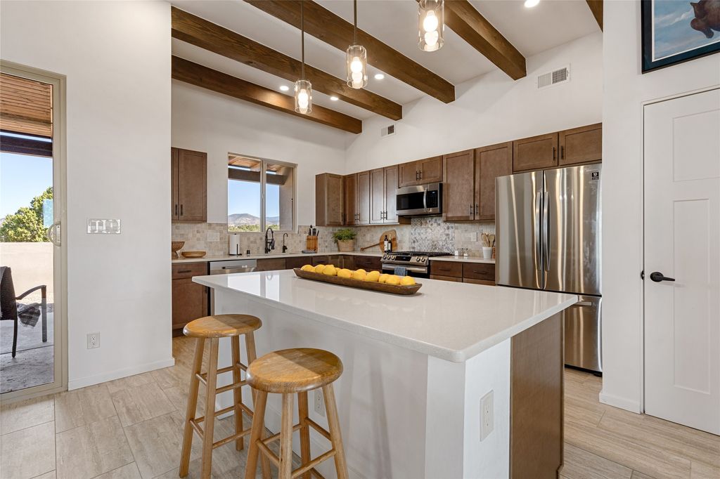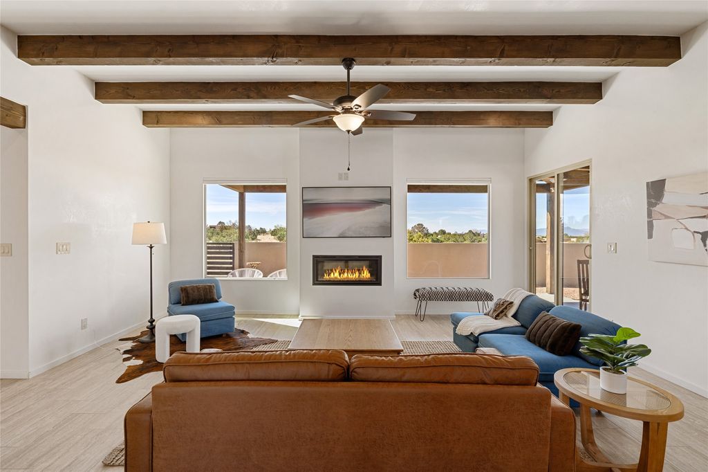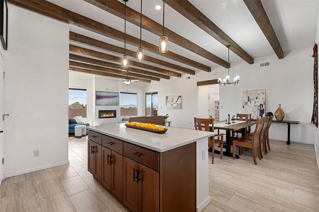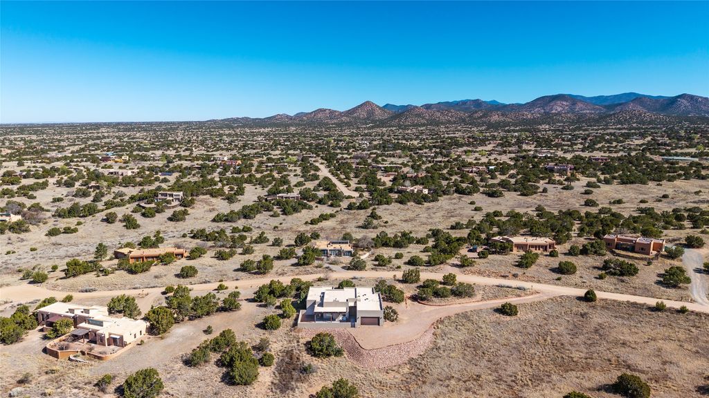 Tucked down a quiet cul-de-sac lane, this beautifully maintained contemporary Pueblo-style home offers the best of Eldorado living. The mountain views, open space, and a thoughtfully designed floor plan, all in a setting that feels both private and serene. Set on 1.45 acres, the south-facing home captures light and views all day long, with meadows and open space as your backdrop. Inside, the single level, split-bedroom layout delivers open-concept living and dining at its finest. There is generous flow between spaces that feels both connected and comfortable. The great room opens through sliding glass doors to a covered patio and courtyard, creating seamless indoor-outdoor living ideal for entertaining or simply soaking in the New Mexico sky. The kitchen is a stand out. The large center island, quartz countertops, stainless steel appliances, and pantry make it as functional as it is beautiful. The spacious primary suite, separated from the guest rooms for privacy, features a spa-inspired bath with a large soaking tub, separate shower, dual vanity sinks, a skylight, and a generous walk-in closet. Three additional bedrooms offer flexibility "” the fourth room is ideally configured as a home office, den, or media room, adapting easily to your needs. A gas fireplace, tile floors throughout, forced heat, and central air conditioning ensure year-round comfort. The attached 2-car garage is insulated and finished, adding everyday practicality to this turn-key package. Eldorado is one of Santa Fe's most sought-after communities "” just 20 minutes from the historic Plaza, with miles of walking and riding trails, acres of protected wilderness, shopping, dining, a library, senior center, K-8 school, and a Community Center with pool, athletic facilities, and a dog park.