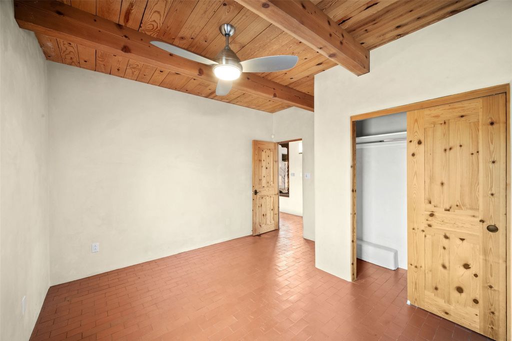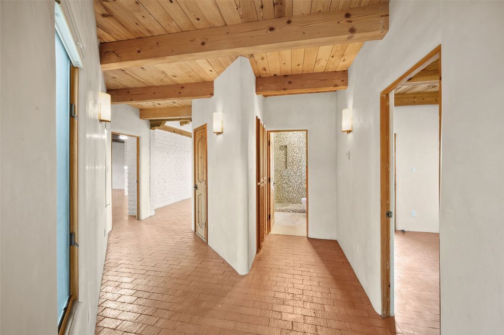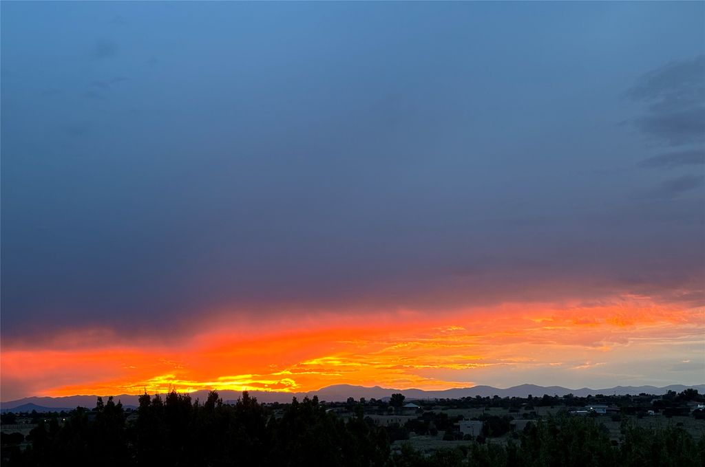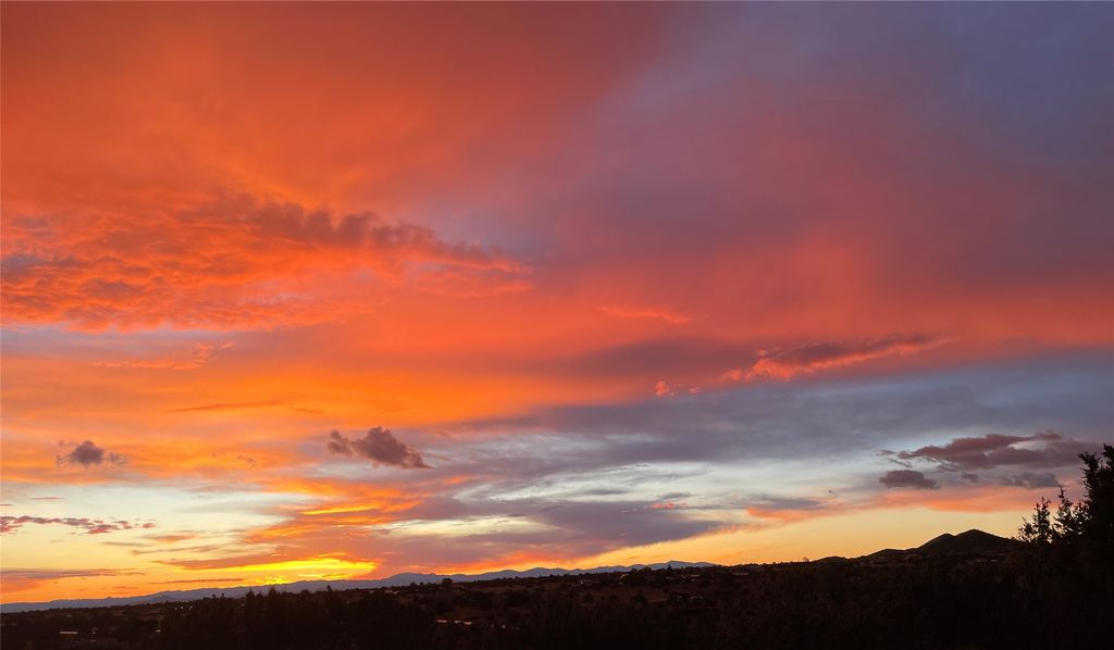 Exquisite Santa Fe-style custom residence showcasing timeless craftsmanship and refined Southwestern elegance. Wood-planked soaring ceilings, hand-carved posts, rich adobe accent walls, and brick floors create a warm, inviting atmosphere that blends seamlessly with the serene natural surroundings. Privately set in a park-like setting on over three lush, treed acres, the home captures sweeping views. The thoughtfully designed open floor plan slows effortlessly, with expansive windows framing the landscape and nearly every room offering direct access to the outdoors. Hand-carved Nichos and three traditional kiva fireplaces add distinctive architectural character and charm. A gated courtyard entry provides a welcoming and intimate arrival experience, The rear portal offers an idyllic setting for sunset gatherings wildlife observations, birding, and outdoor dining while a flagstone patio extends gracefully into the surrounding land. This on-of-kind property is rich in ambiance and authenticity. Tastefully remodeled, the home features a beautifully updated kitchen and bath, a high-efficiency natural gas radiant heating system (Pex tubing), and refreshed stucco. Additional upgrades include an on-demand hot water system and a recently installed septic system for peace of mind. The acreage allows for horses and is currently home to roaming deer and native wildlife, enhancing the sense of tranquility and connection to nature. A spacious three-car garage completes the offering. Ideally located just minutes from the heart of Santa Fe, with convenient access to local amenities, dining, and shopping, this exeptional property offers the perfect balance of privacy, compfort, and sophistication. Watch the video and check out the Virtual Tour!