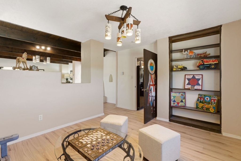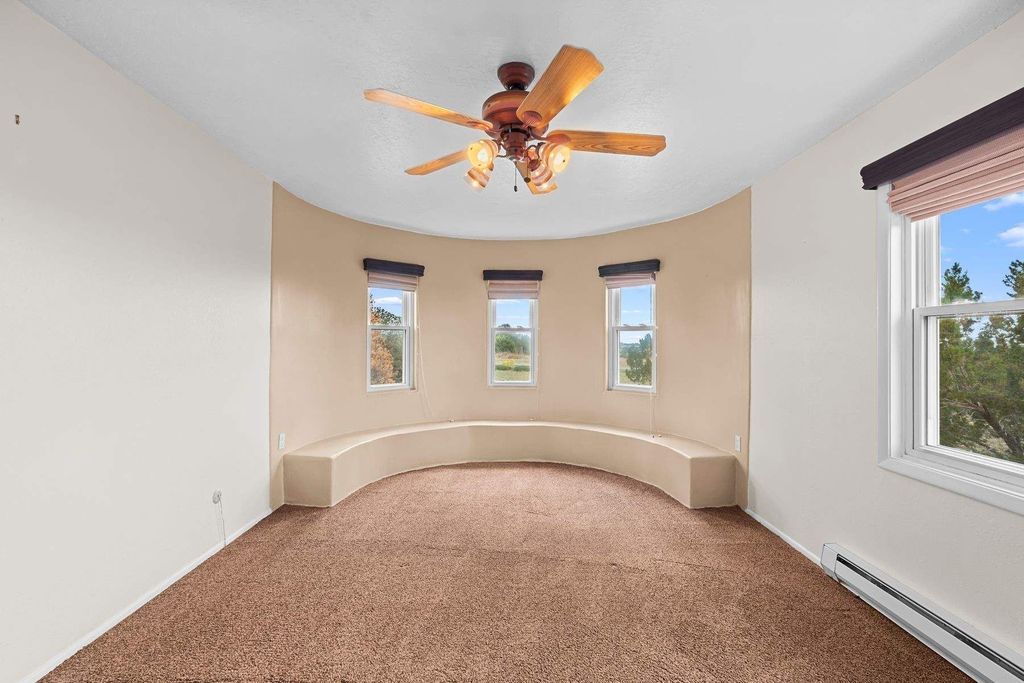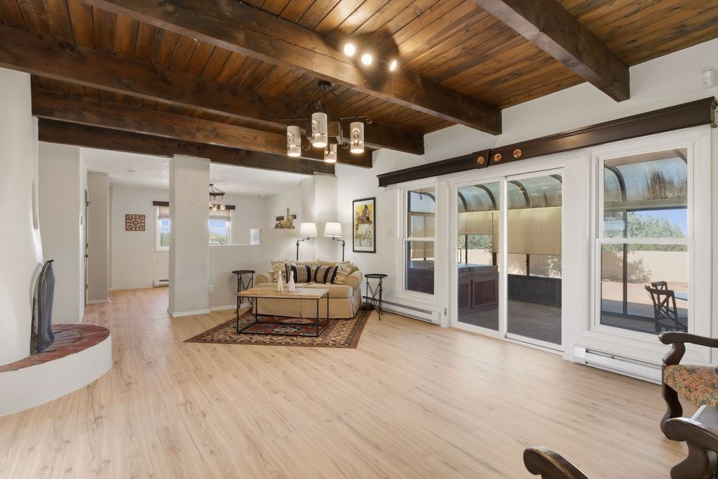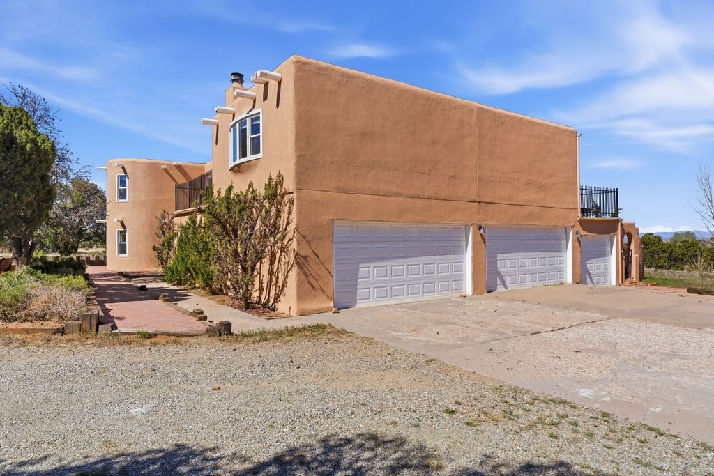 Pueblo Revival home in Eldorado on 1.65 acres with Sangre de Cristo mountain views, located just 15 minutes from the Santa Fe Plaza with easy access to I-25. This 3,562 square foot, two-story residence offers 4 bedrooms, 4 bathrooms, and a flexible layout designed for living, working, and creative use in one of Santa Fe's most sought-after communities. A dramatic entry leads into a spacious living room with dual-sided kiva fireplace, connecting to a flex space and sunroom that opens to a walled patio with mountain views. New laminate flooring in the main-level living areas enhances flow and durability, while brick and tile floors, banco seating, custom kachina-painted doors, and beamed ceilings reflect classic Southwestern design. The kitchen features quartz countertops, dual ovens, custom cabinetry, and a generous dining area. Upstairs, four bedrooms include walk-in closets and a large primary suite with two decks, dual baths, a bonus room, and a second fireplace. Additional flexible spaces include a main-level bonus room adjacent to the oversized five-car garage, suitable for studio, workshop, or gym use. A greenhouse with hot tub, storage shed, and multiple outdoor living areas support year-round use and a variety of lifestyle needs. Recent improvements include new exterior paint on the home and privacy wall. The level 1.65-acre lot offers usable space for gardens, outdoor living, or future improvements, with direct access to Eldorado's trail network and the nearby Santa Fe Rail Trail. Eldorado amenities include a community center, pool, tennis courts, stables, shopping, and El Dorado Community School. This property combines acreage, flexible living space, and proximity to Santa Fe, medical facilities, and Los Alamos commuting routes.