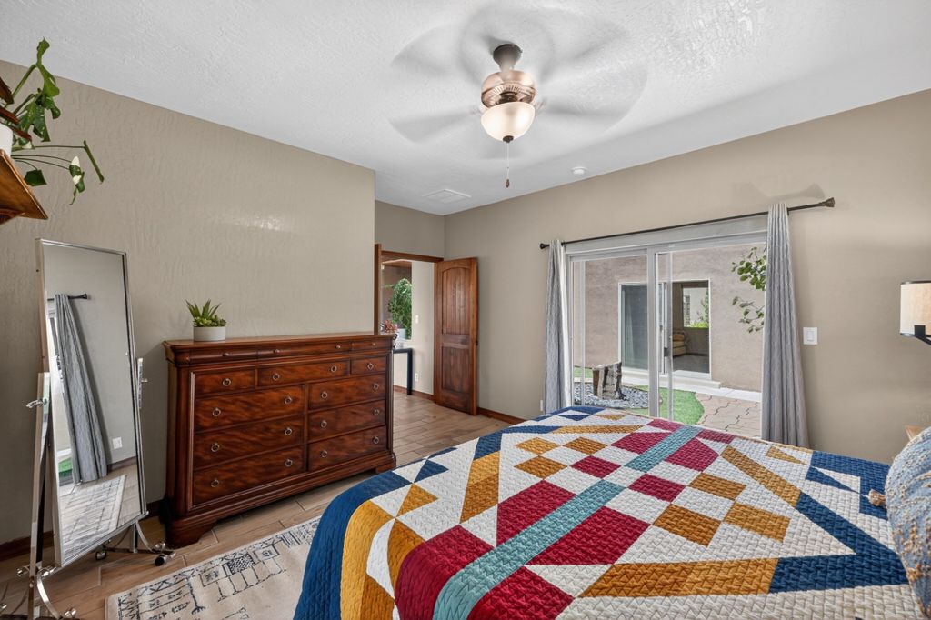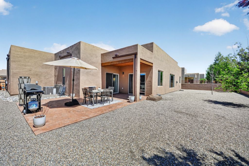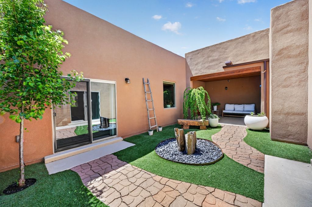 Welcome to refined Southwest living in the coveted La Pradera community, where the enchantment of Santa Fe meets soft contemporary elegance. This stunning move-in ready residence showcases the celebrated Zaguan floor plan, drenched in natural light through expansive windows that frame the breathtaking New Mexico landscape. Handcrafted double cedar gates open to a private courtyard adorned with a stone fountain and dramatic landscaping, setting a tone of quiet sophistication. Inside, exceptional finishes abound "” a Kiva fireplace, tile flooring, and high wood-beamed ceilings create an atmosphere of luxury and warmth. The gourmet kitchen features a four-burner Wolf convection oven, Sub-Zero Cove dishwasher, Jennair counter-depth refrigerator, Silestone countertops, and soft-close cabinetry. The light-filled primary suite offers a private ensuite bathroom with a custom tiled shower, deep soaking tub, dual walk-in closets, and a dedicated water closet. A second bedroom extends to the portal and a walled, private yard. Steps from the main residence, a separate guest casita provides a living room, bedroom, and luxury bath "” ideal for visitors or potential rental income. Beautiful outdoor living continues through a generous backyard with open space, suited for entertaining beneath endless turquoise skies. Additional highlights include a three-car finished garage with electric vehicle charging and epoxy floor, 2 tankless hot water heaters, whole-house air purification, steam humidifier, and reverse-osmosis water system. La Pradera is known for its paved walking paths and hiking trails within the neighborhood and just outside the entrance. These trails are in the foothills and high desert between La Pradera and neighboring developments. Ideally situated near Sunset Park, Santa Fe Community College, shopping, and dining, this extraordinary residence embodies the beauty and soul of the Southwest. Schedule your private showing today. Don't miss the 3-D Matterport and drone footage in the listing!